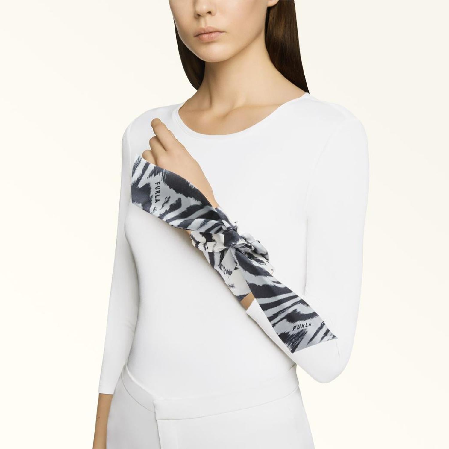 • The Furla Metropolis bandeau in light silk twill features a soft, undulating zebra print. With stunning versatility, it can be tied around your neck or wrist, worn as a belt around your waist or used to elevate your favourite bag.