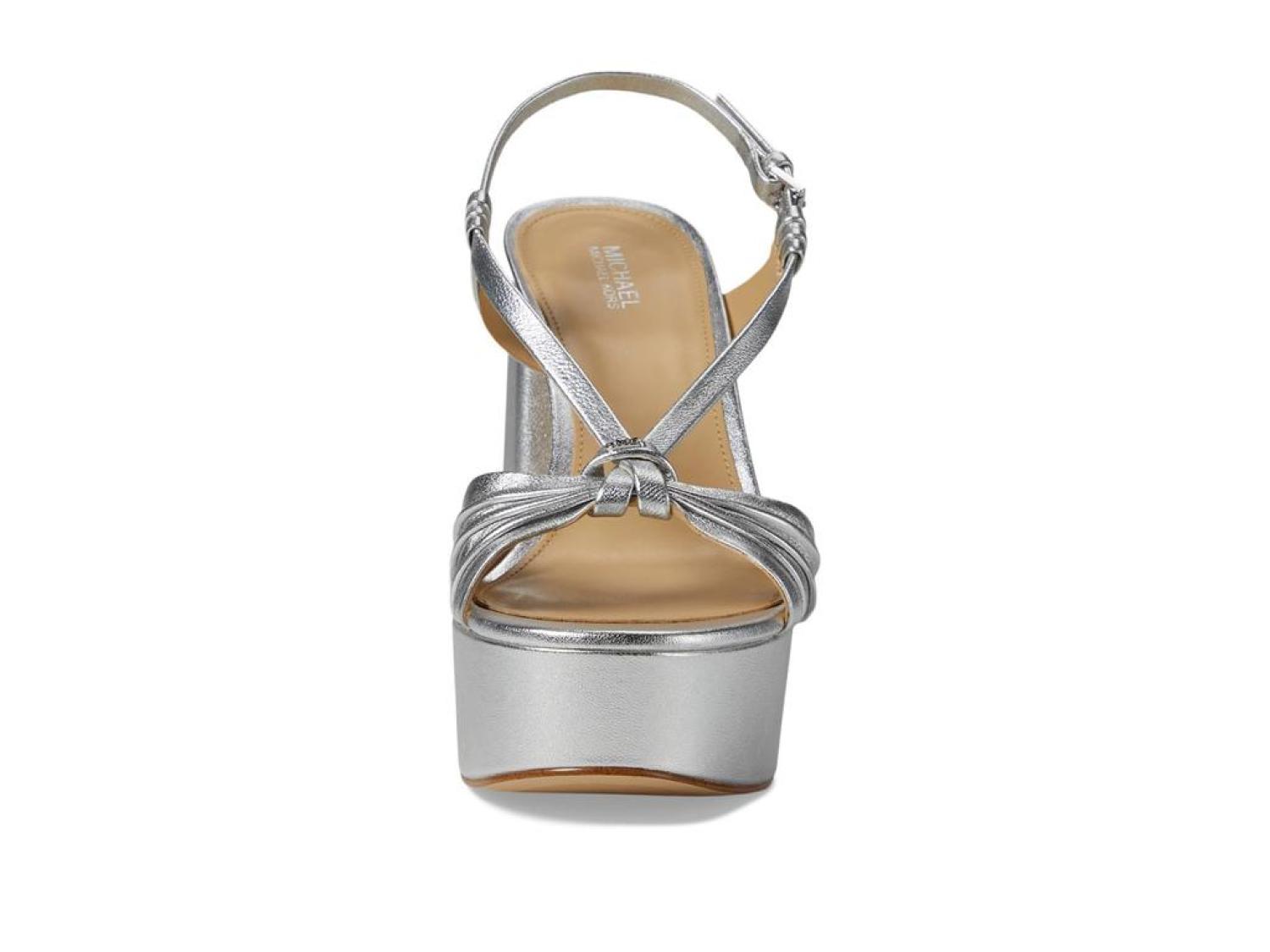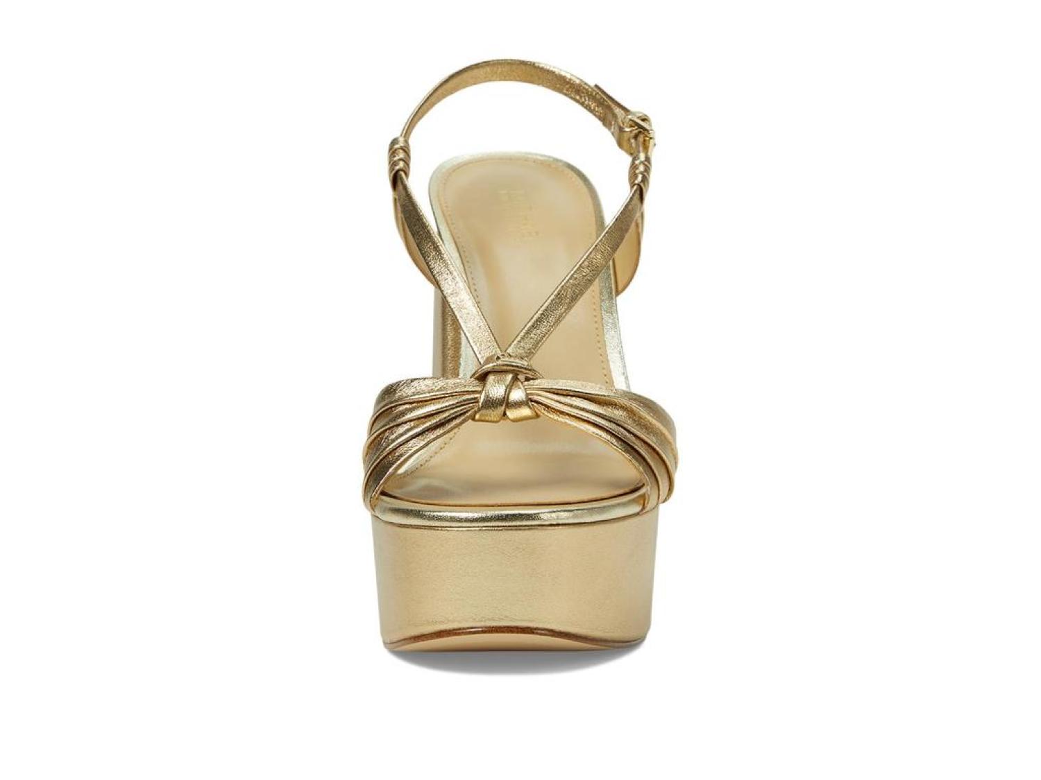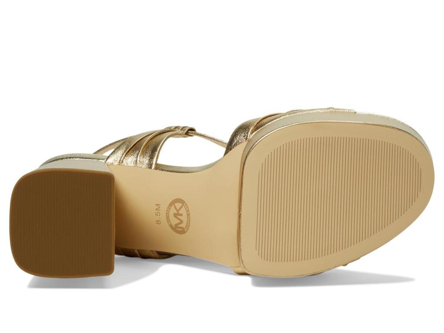 • The MICHAEL Michael Kors® Gabriella Platform Sandal is a dress sandal featuring beautiful pleated leather design, the deep folds create added volume, and textural interest paired with a platform and block heel make for the perfect occasion shoe. The low-top metallic heels feature a pleated leather upper with adjustable ankle strap & buckle closure, faux leather lining, and cushioned faux leather insole.