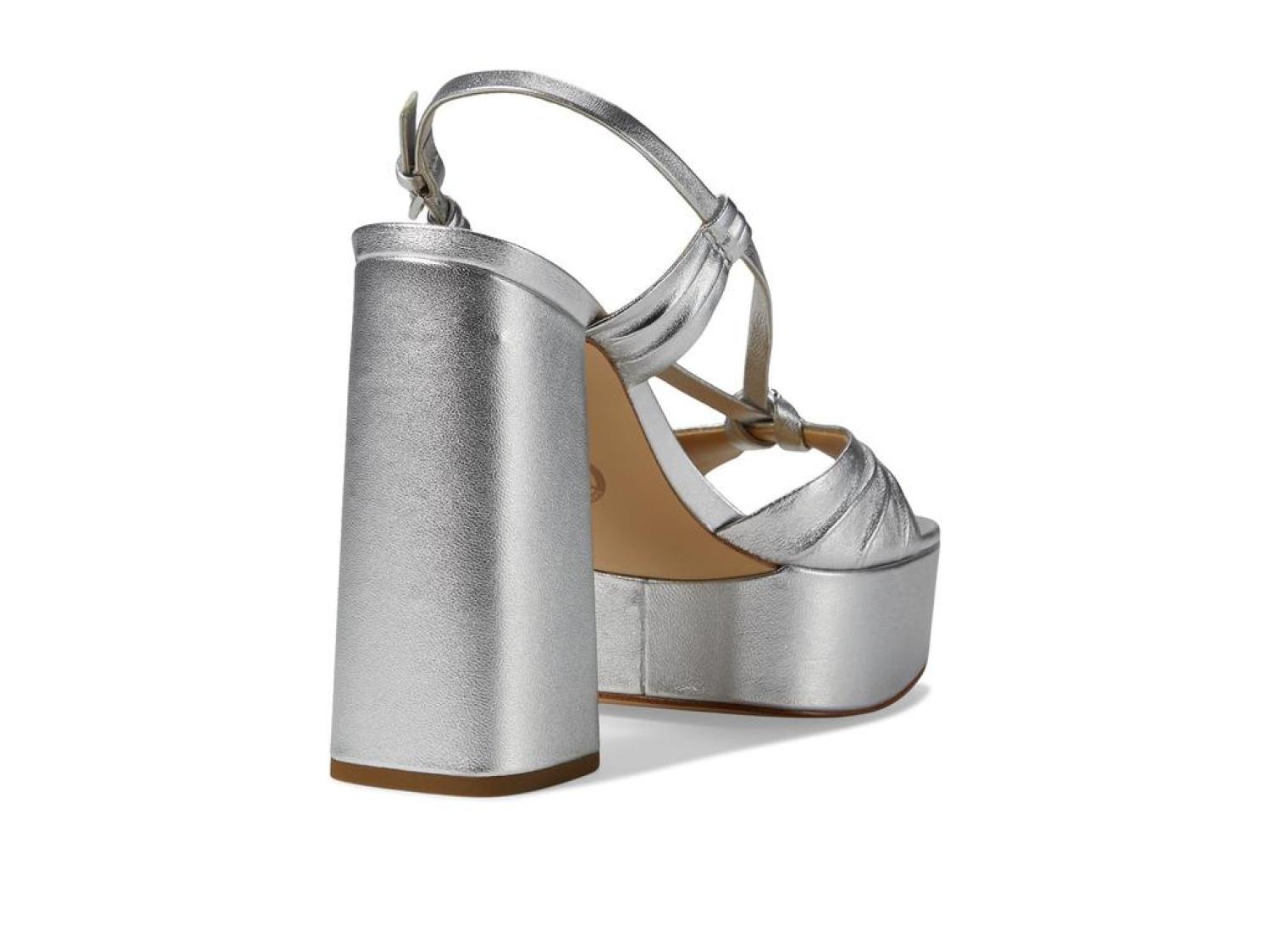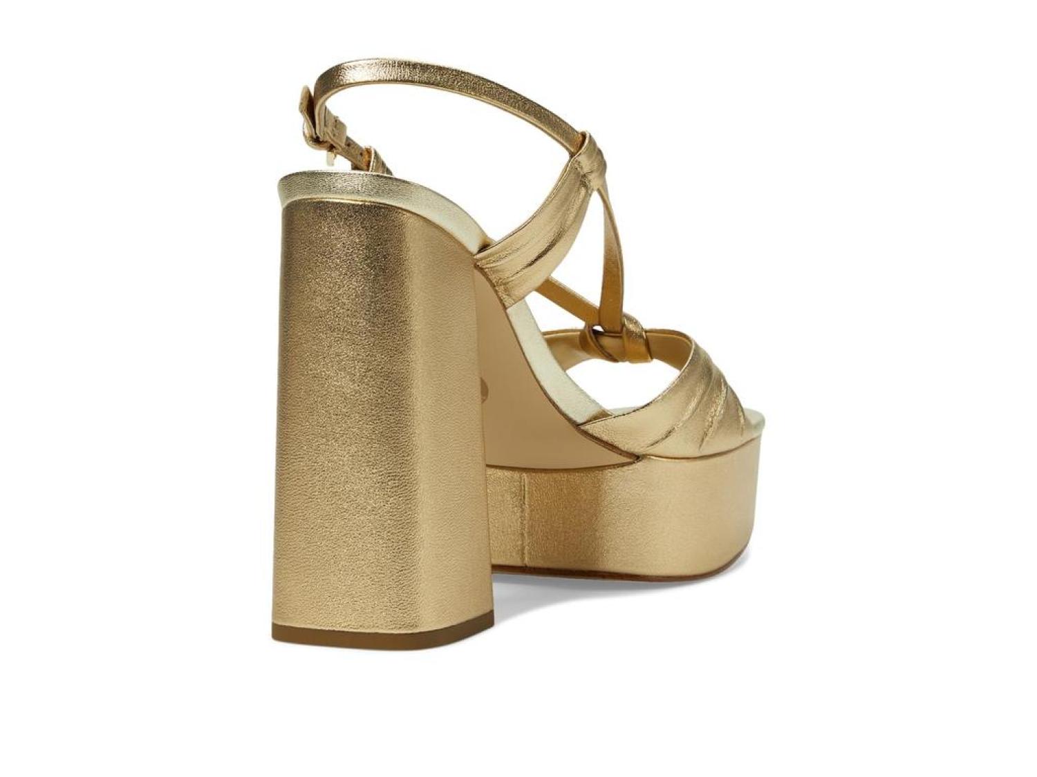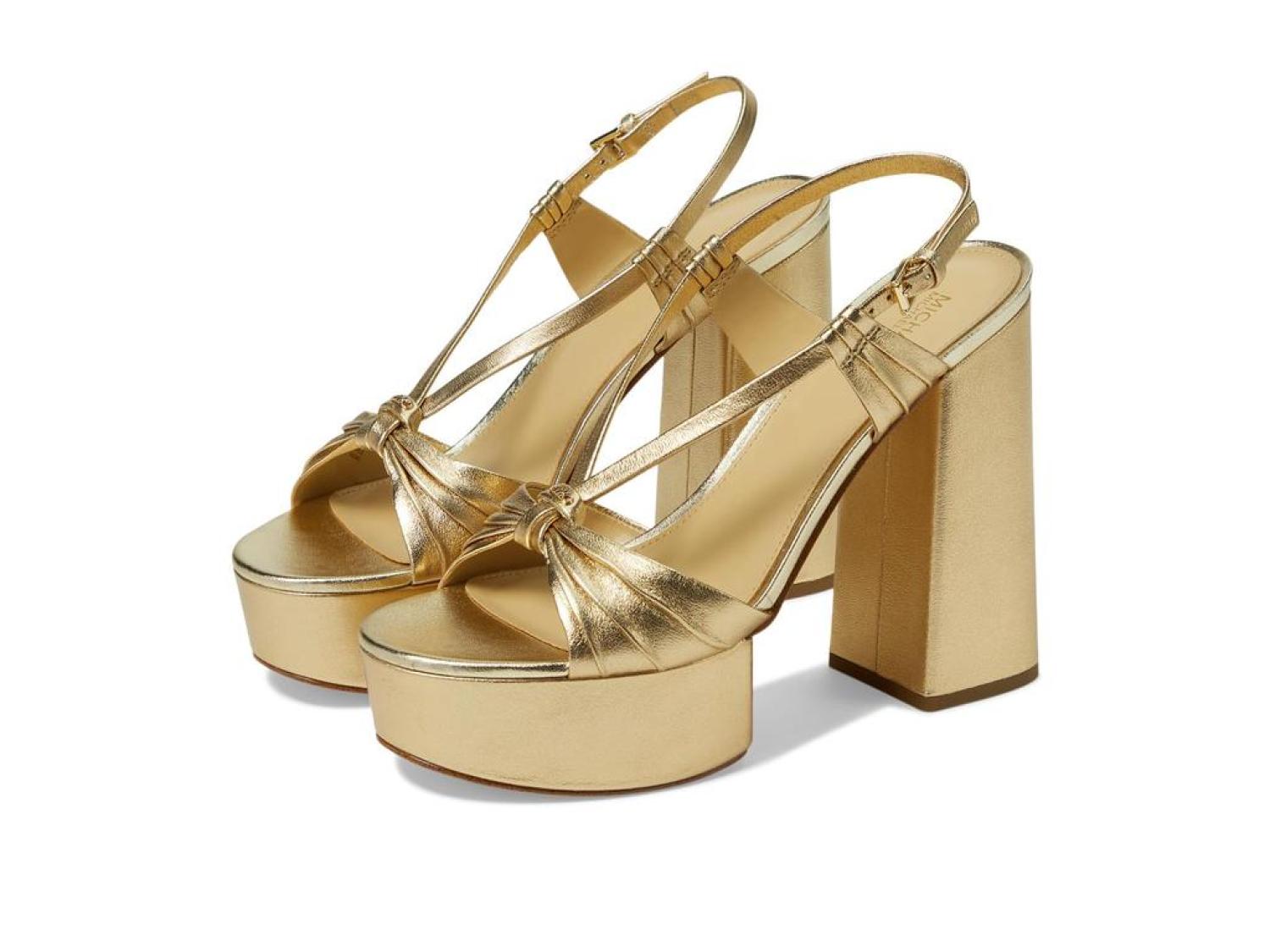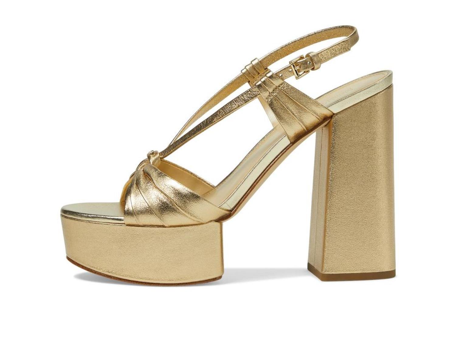 • The MICHAEL Michael Kors® Gabriella Platform Sandal is a dress sandal featuring beautiful pleated leather design, the deep folds create added volume, and textural interest paired with a platform and block heel make for the perfect occasion shoe. The low-top metallic heels feature a pleated leather upper with adjustable ankle strap & buckle closure, faux leather lining, and cushioned faux leather insole.