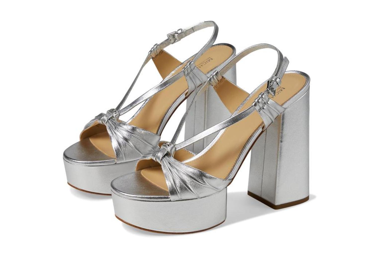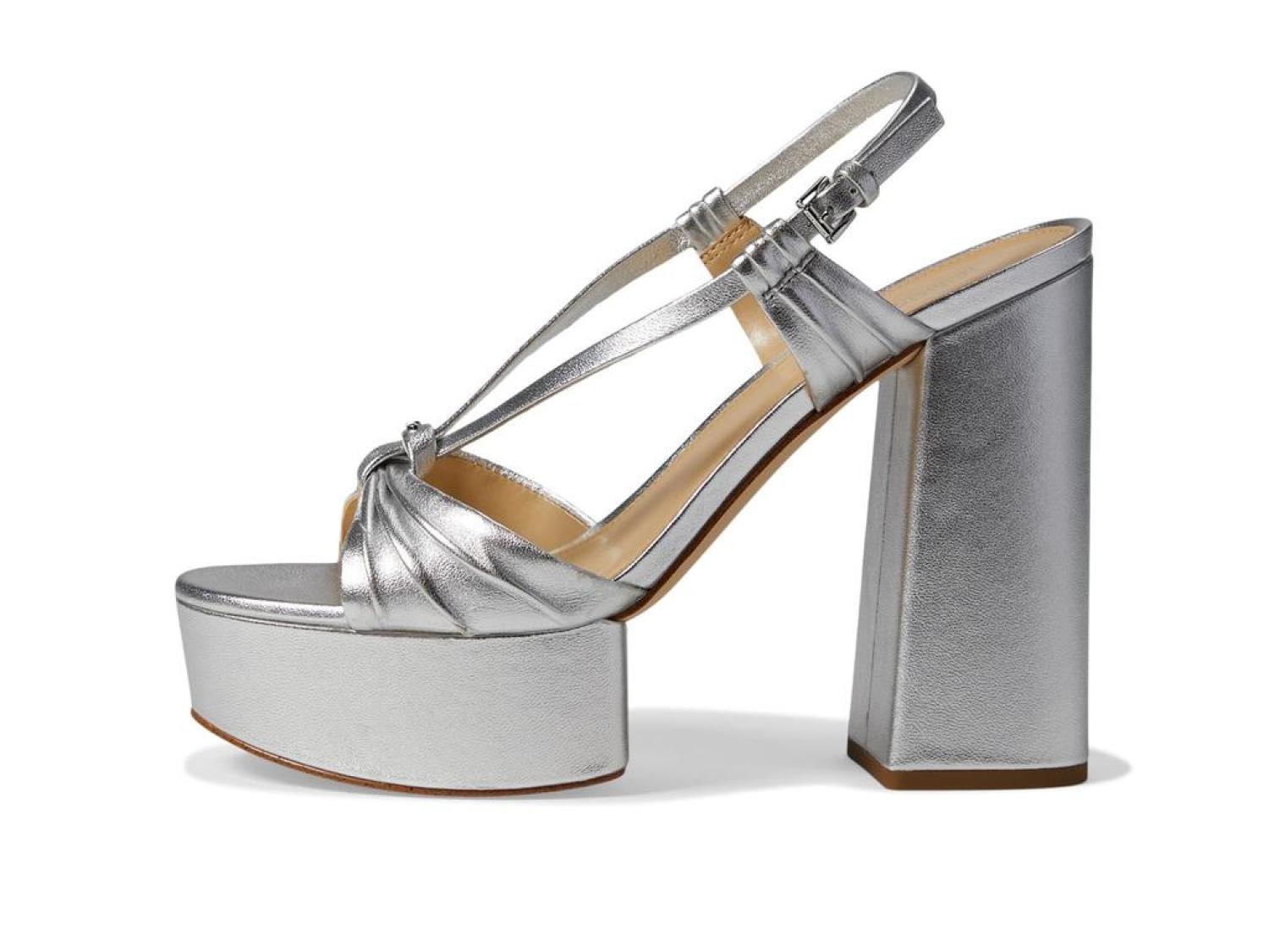 The MICHAEL Michael Kors® Gabriella Platform Sandal is a dress sandal featuring beautiful pleated leather design, the deep folds create added volume, and textural interest paired with a platform and block heel make for the perfect occasion shoe. The low-top metallic heels feature a pleated leather upper with adjustable ankle strap & buckle closure, faux leather lining, and cushioned faux leather insole.