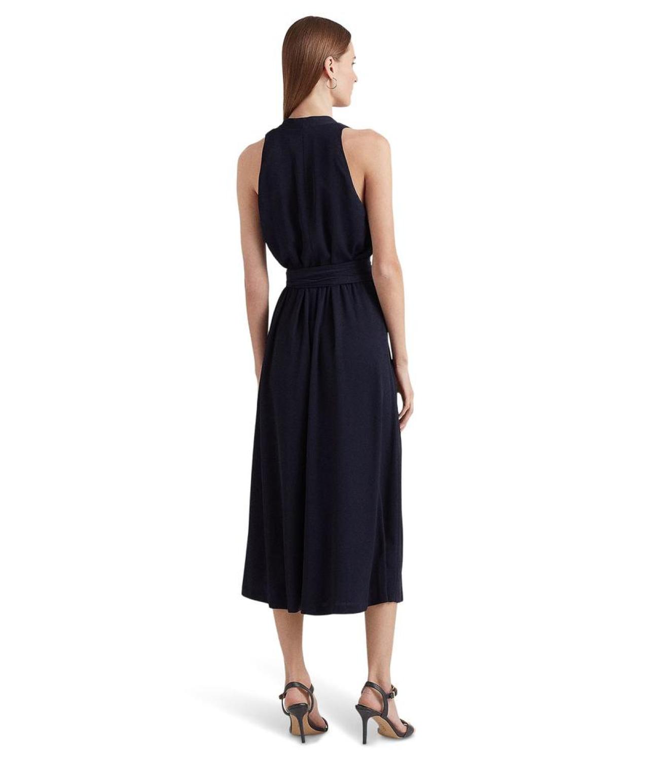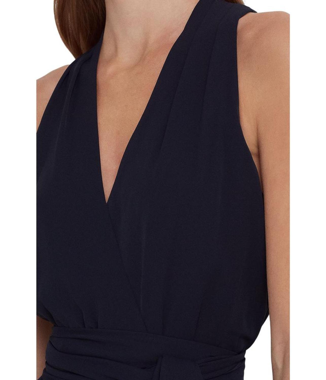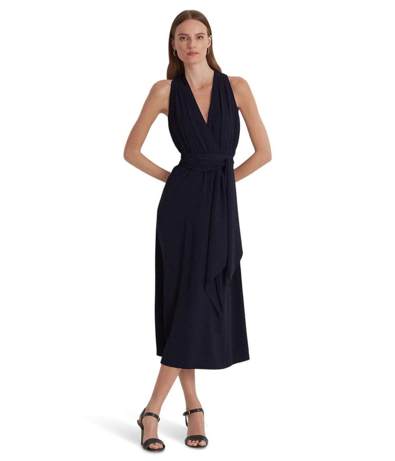 The primary materials that compose this product contain a minimum of 20 percent recycled content. Get a comfortable fit and gorgeous look wearing the sensual and attractive LAUREN Ralph Lauren® Georgette Halter Cocktail Dress for the upcoming party and flaunt your curves. A-line silhouette. Halter neckline. Sleeveless construction. Elasticized waistband. Concealed zippered back with a hook-and-eye closure. Threaded belt loops with a removable self-belt on the waist. Midi-length cocktail dress. Intended to hit at the knee. 100% recycled polyester. Dry clean. Imported.