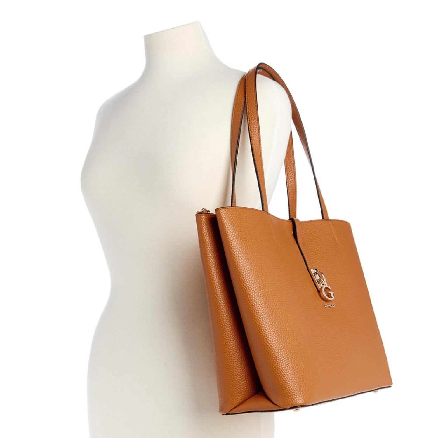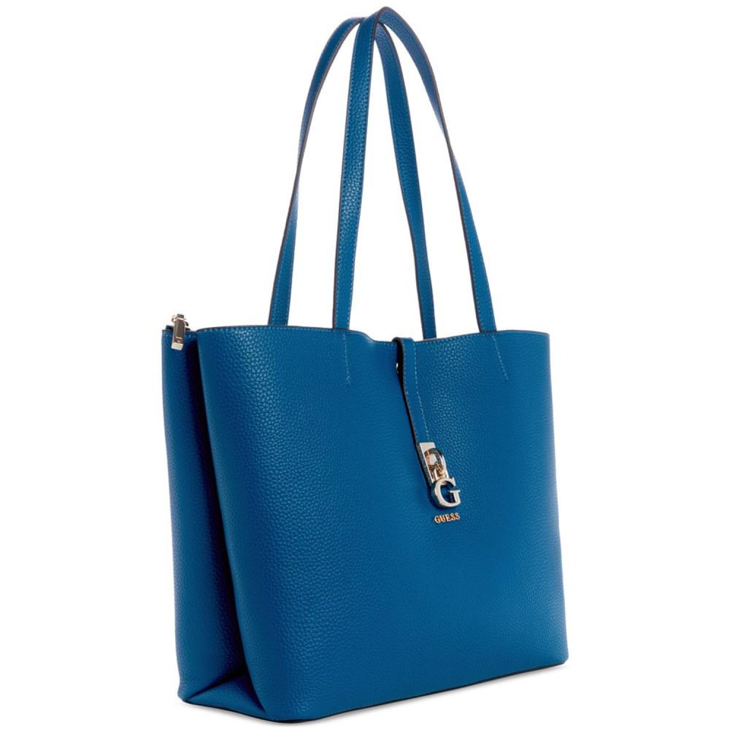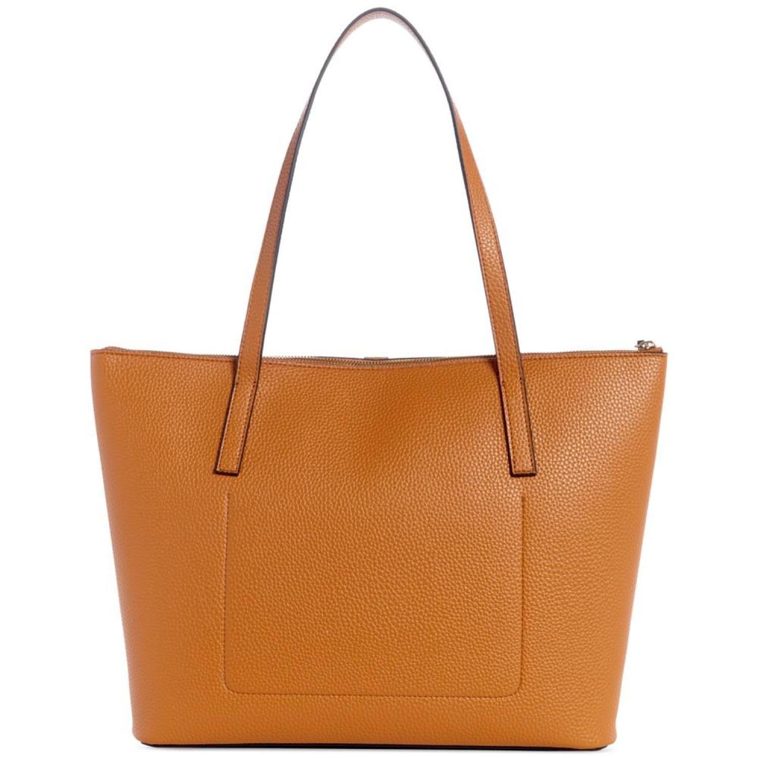 This tote by GUESS is perfect for everyday style and organization. Featuring a double compartment interior with both zip and snap closures, it is punctuated with a logo charm for an iconic finish. Extra-large sized bag; 16-1/4"W x 11"H x 5-3/4"D (width is measured across the bottom of handbag) Silhouette is based off 5'9" model 9-3/4"L straps Zip & magnetic snap closures Gold-tone hardware & logo charm Double compartment interior Tablet compatible (std. size 8"-10") Polyurethane Spot clean Imported