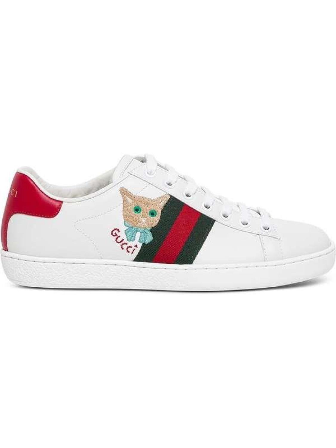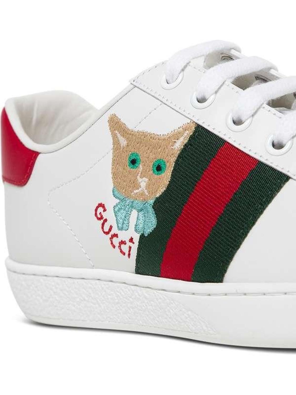 Step into playful sophistication with the Gucci Ace Cat Leather Sneaker, a charming addition to your footwear collection. These white leather sneakers feature a delightful cat-embroidered motif, showcasing Gucci's whimsical aesthetic. The iconic red and green signature Web-stripe trim adds a touch of heritage flair, while the branded heel counter elevates the design with a touch of luxury. With a classic round toe and front lace-up fastening, these sneakers offer both style and comfort. Finished with a flat rubber sole for traction and durability, the Gucci Ace Cat Leather Sneaker is sure to become a statement piece in your wardrobe, perfect for adding a playful twist to any ensemble.