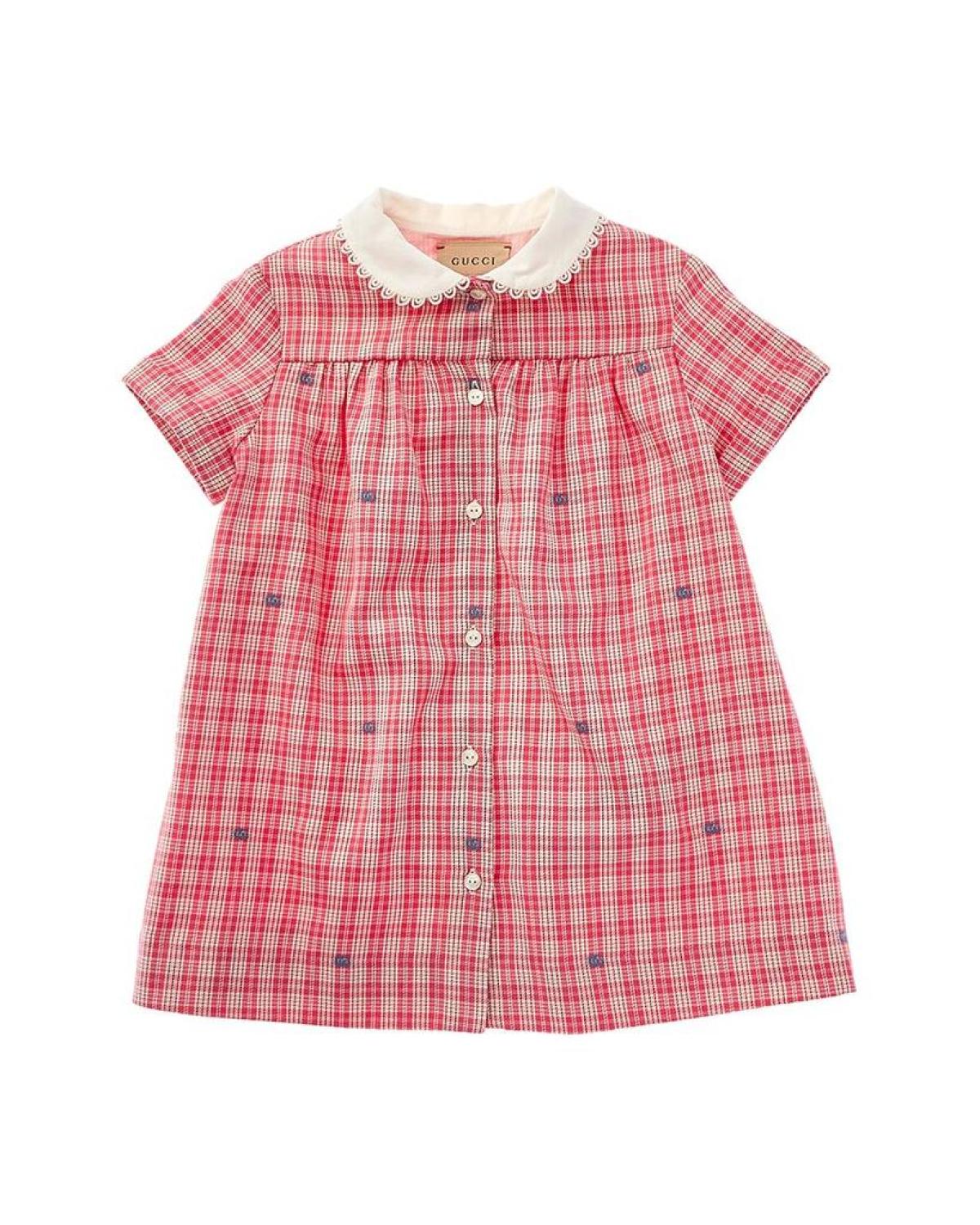 Elevate your little girl's wardrobe with the Gucci Dress, a timeless piece from the iconic Italian luxury brand. This pink dress features a scalloped collar and a button front for added details. Made from 100% cotton and machine washable, this dress is not only stylish but also easy to care for. Crafted in Italy, this Gucci Dress is guaranteed to be 100% genuine and authentic. Embrace the eclectic and coveted style of Gucci with this must-have addition to your child's closet.