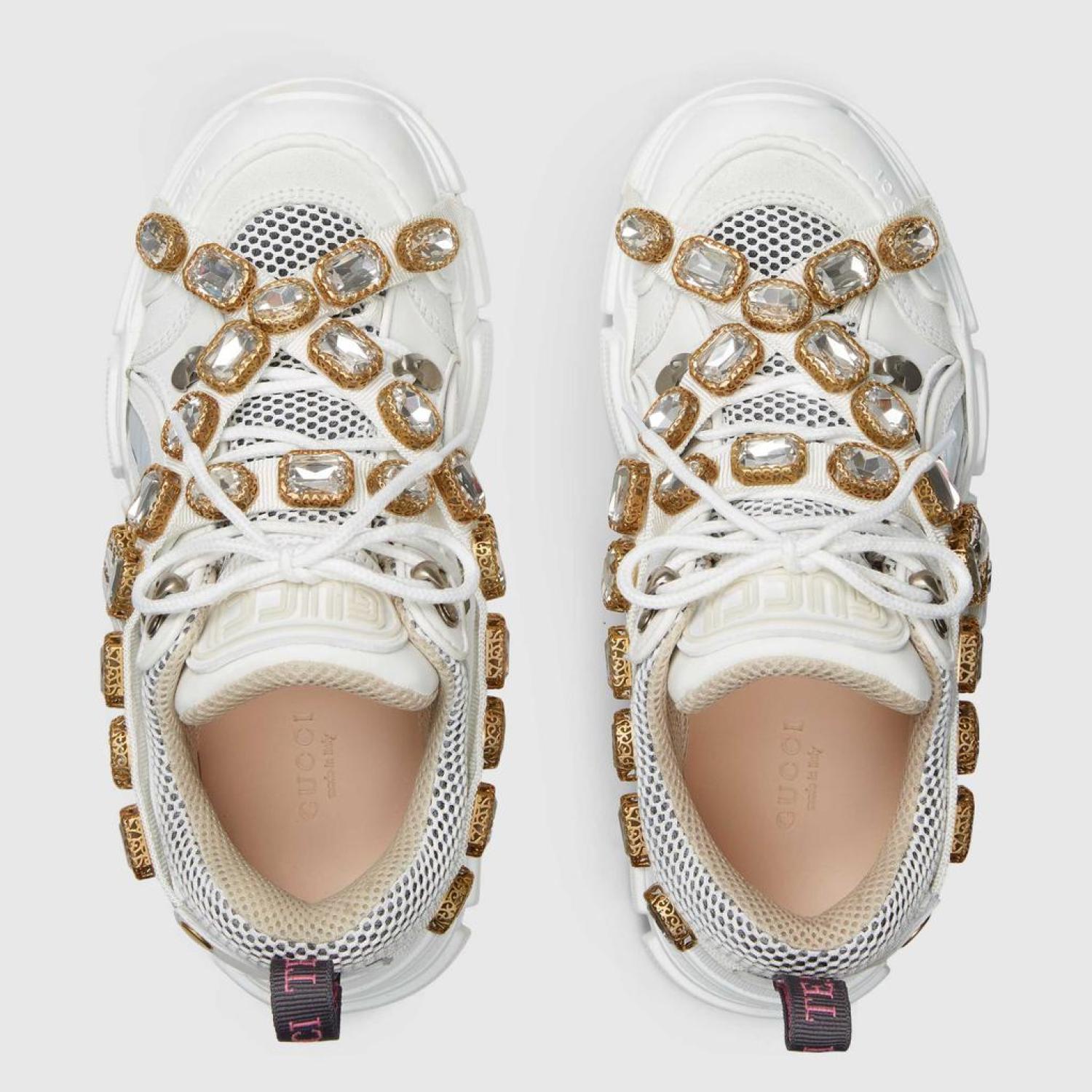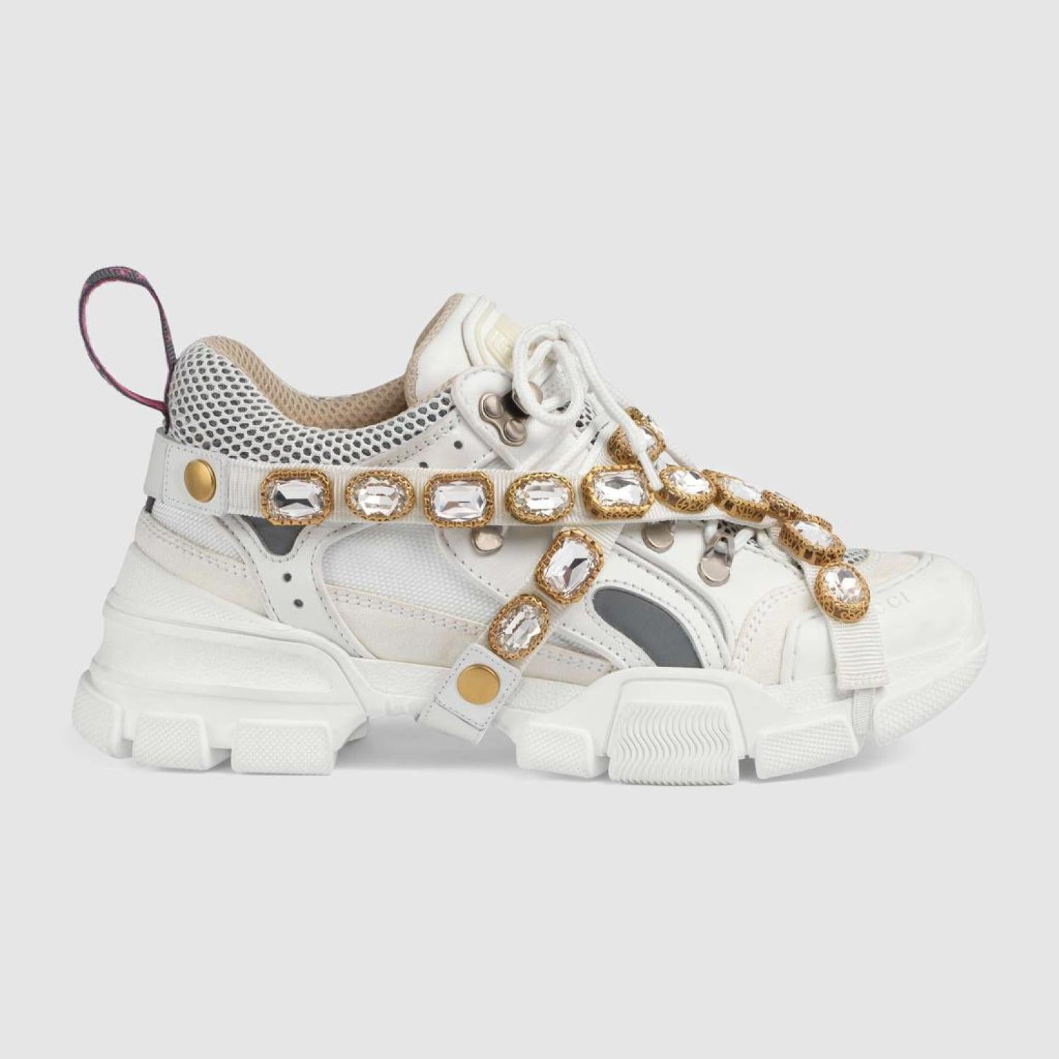 • Step into the future with the Gucci Flashtrek Leather & Mesh Sneaker, a fusion of luxury and functionality. Crafted with a low-top paneled leather upper and technical mesh trim, these sneakers boast a modern aesthetic that's both stylish and practical. The rubber trim features an embossed logo at the round toe, while the lace-up closure ensures a secure fit. A rubberized logo patch adorns the padded tongue, and a detachable textile trim with crystal-cut detailing adds a touch of glamour and versatility. Finished with a logo-woven pull-loop at the heel collar, technical mesh lining, sculpted rubber sole, and antiqued silver-tone hardware, these sneakers are the epitome of urban chic. Whether you're hitting the city streets or exploring the great outdoors, the Gucci Flashtrek Sneaker is sure to make a statement with its impeccable craftsmanship and distinctive design.