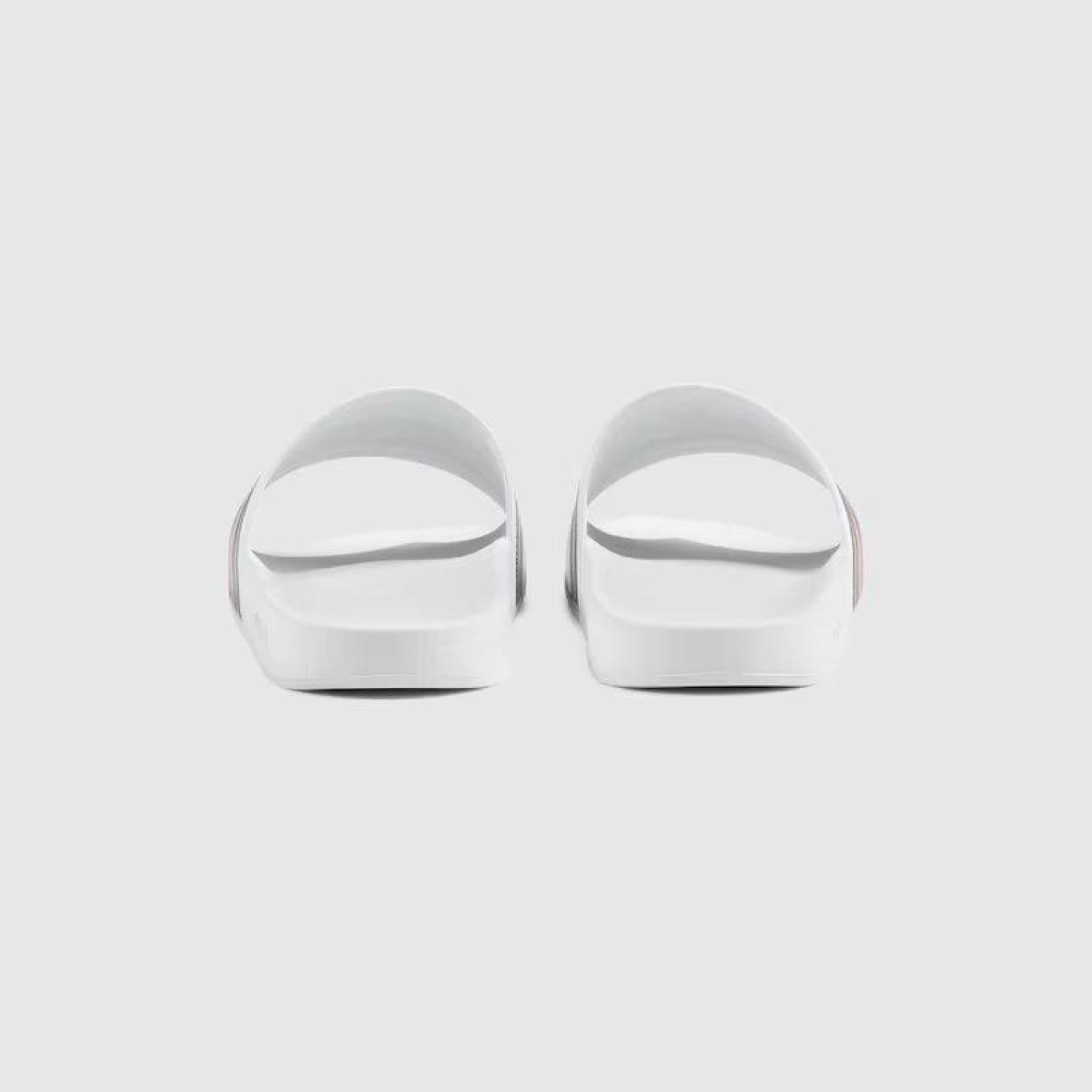 • A distinctive House code, the green and red Web is reimagined in a pop-inspired take on this flat sandal, a slip-on design crafted from black rubber. Embossed on the slide's sole is the Gucci logo.
