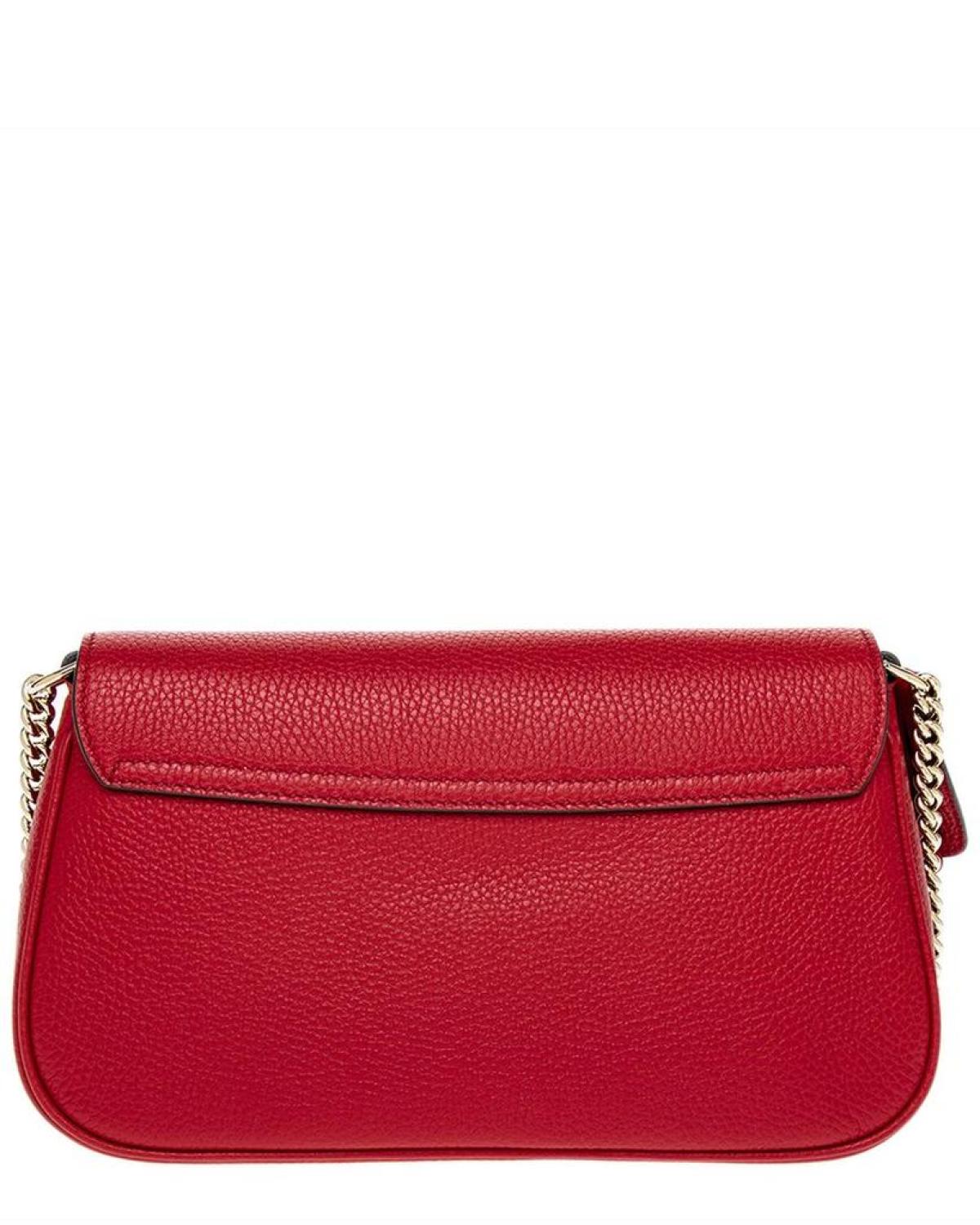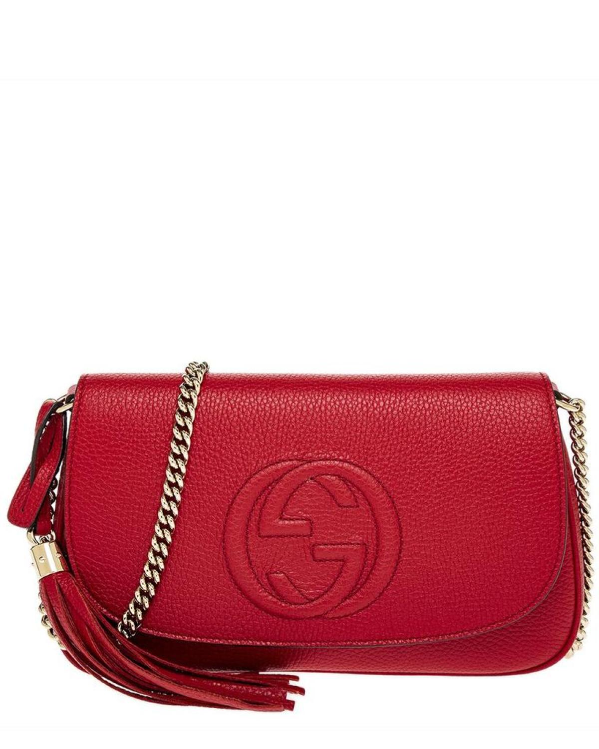 Elevate your style with the Gucci Soho Leather Crossbody. Made in Italy, this chic handbag features luxurious red leather and gold-tone hardware, with a grainy finish and embossed interlocking GG logo on the front. The interior boasts a zipped pocket and slip pocket for easy organization. The shoulder strap drops 21 inches, making it perfect for everyday wear. The fold-over flap with magnetic closure adds a touch of sophistication. Please note that all measurements are approximate. Trust in the authenticity of this 100% genuine Gucci product, purchased from trusted independent suppliers. Embrace Italian luxury redefined with this coveted piece from Gucci.