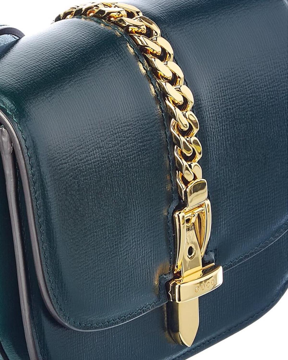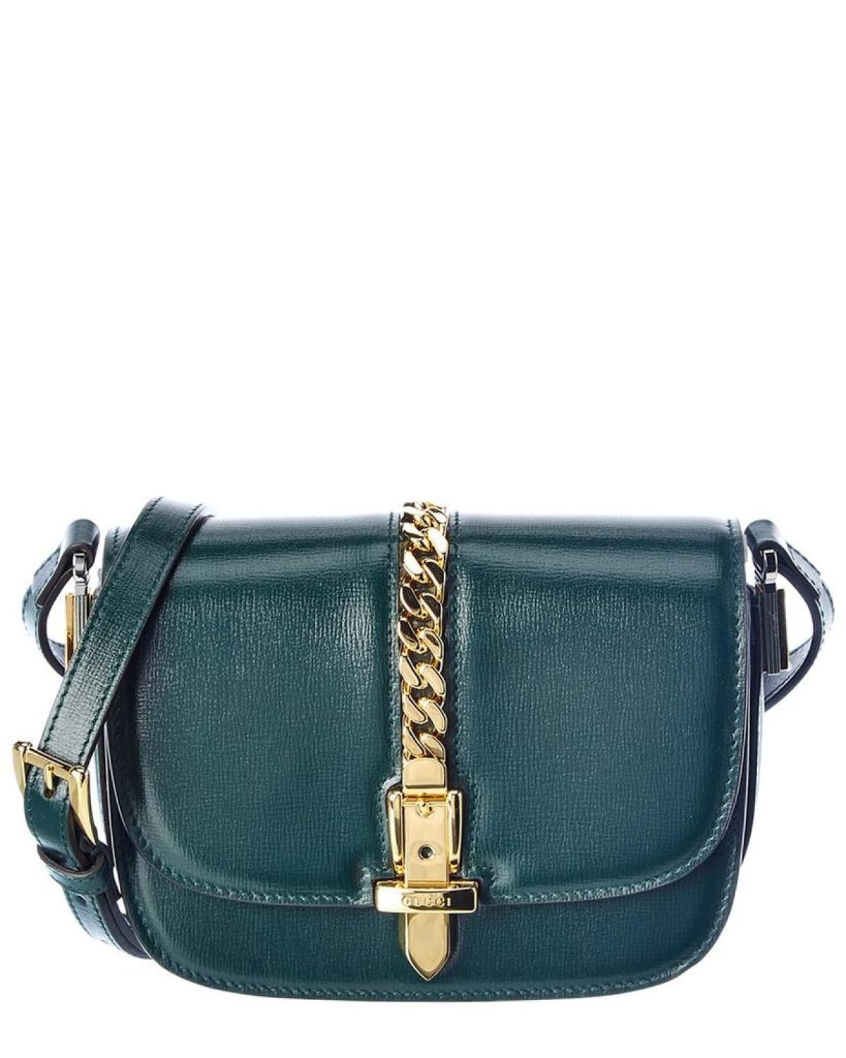 Elevate your outfit with the Gucci Sylvie 1969 Mini Leather Shoulder Bag. Made in Italy, this luxurious bag features green leather with light fine gold hardware and a chic chain accent. The interior is lined with fabric and includes a fold-over flap with a turnlock closure. The adjustable and removable shoulder strap allows for versatile styling, with a drop of 21 inches. Measuring 6.6 inches wide, 5 inches high, and 2.75 inches deep, this mini shoulder bag is the perfect statement piece for any fashion-forward woman. Authenticity is guaranteed, as we source our products from trusted independent suppliers. Experience Italian luxury redefined with Gucci.