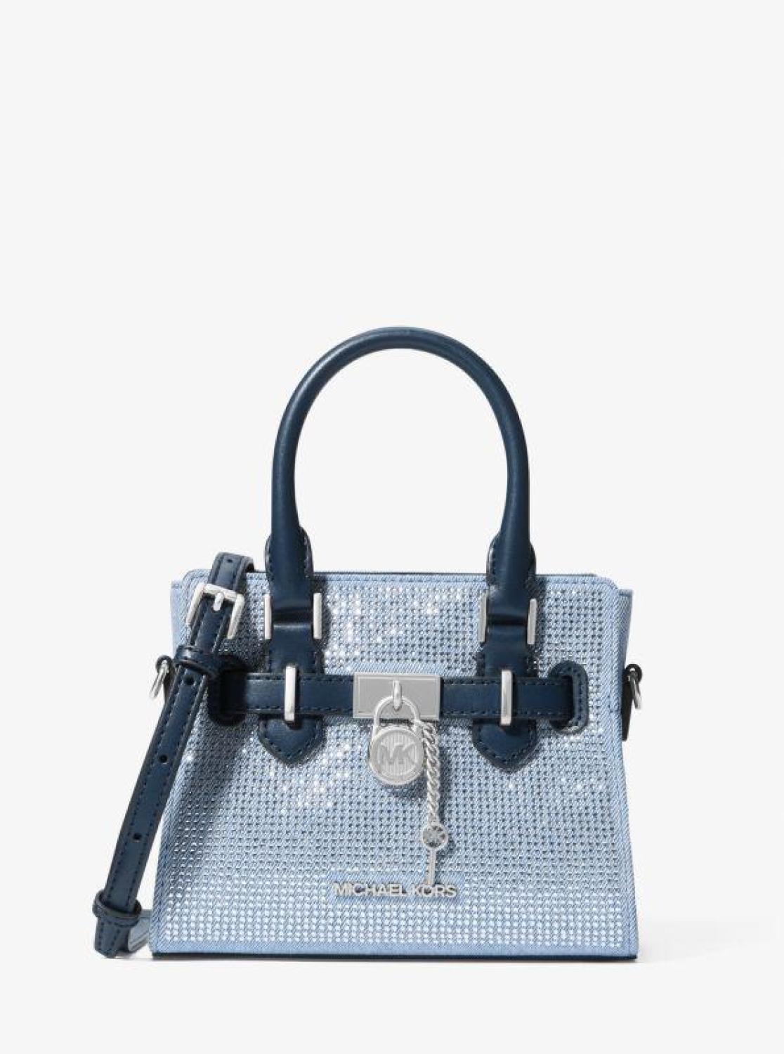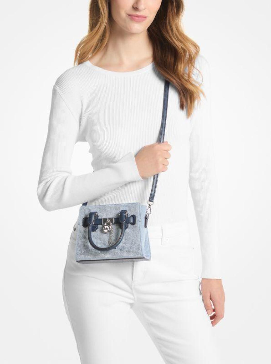 A mini bag with major style, this extra-small take on the denim Hamilton satchel is covered in light-catching crystals and finished with gleaming hardware. Inside slip pockets keep cards and cash organized, while the belted silhouette can be expanded to create additional storage. Match your jewelry to the decorative padlock charm. • Satchel • Denim • 100% cotton • Trim: 60% polyurethane/20% cotton/20% polyester • Silver-tone hardware • 7.25”W X 5.75”H X 3.5”D • Handle drop: 3.25” • Adjustable strap: 19.75”-23.5” • Interior details: 3 card slots • Lining: 100% polyester • Zip fastening • Dust bag not included • Imported • Satchel • Denim • 100% cotton • Trim: 60% polyurethane/20% cotton/20% polyester • Silver-tone hardware • 7.25”W X 5.75”H X 3.5”D • Handle drop: 3.25” • Adjustable strap: 19.75”-23.5” • Interior details: 3 card slots • Lining: 100% polyester • Zip fastening • Dust bag not included • Imported