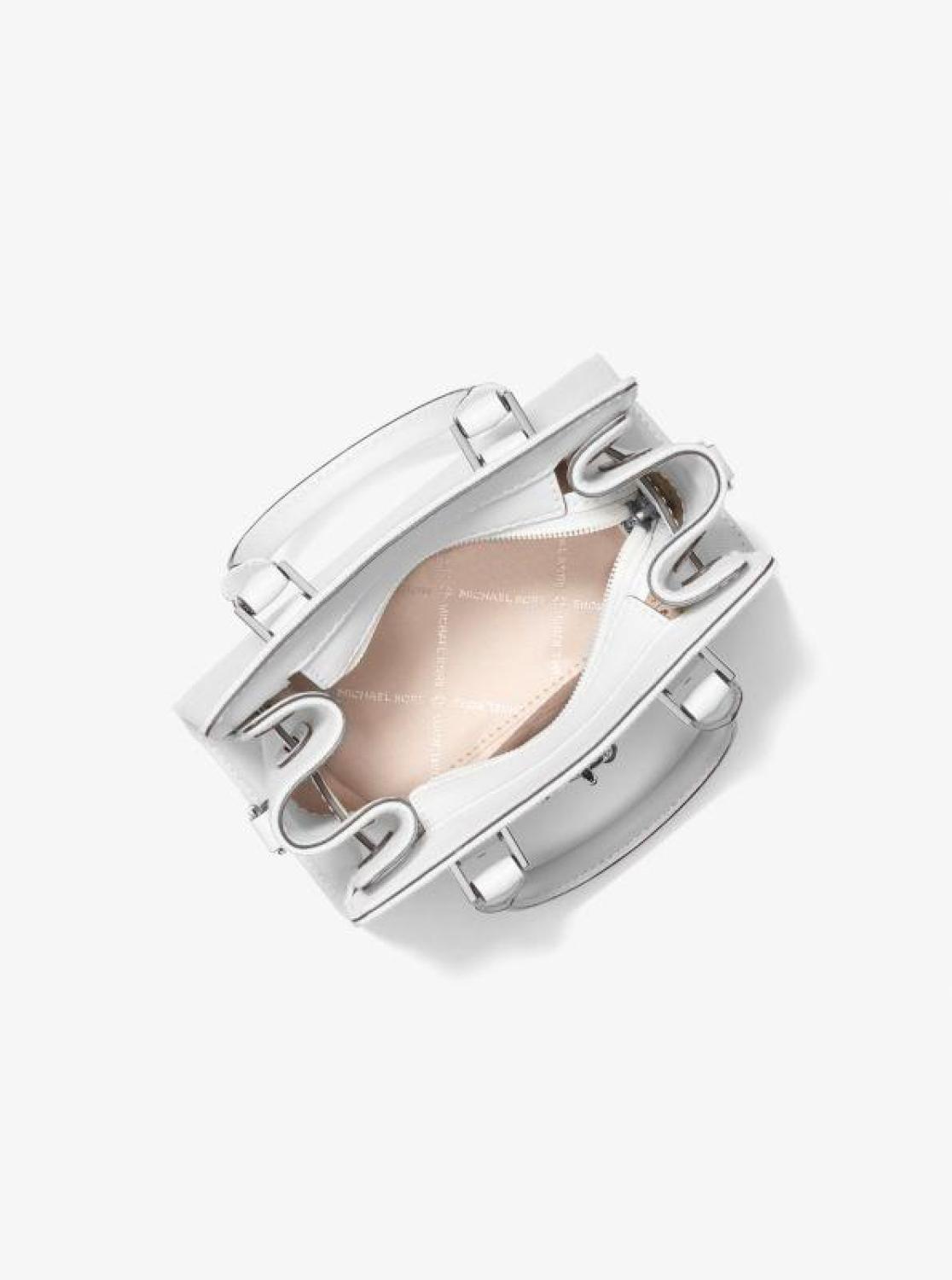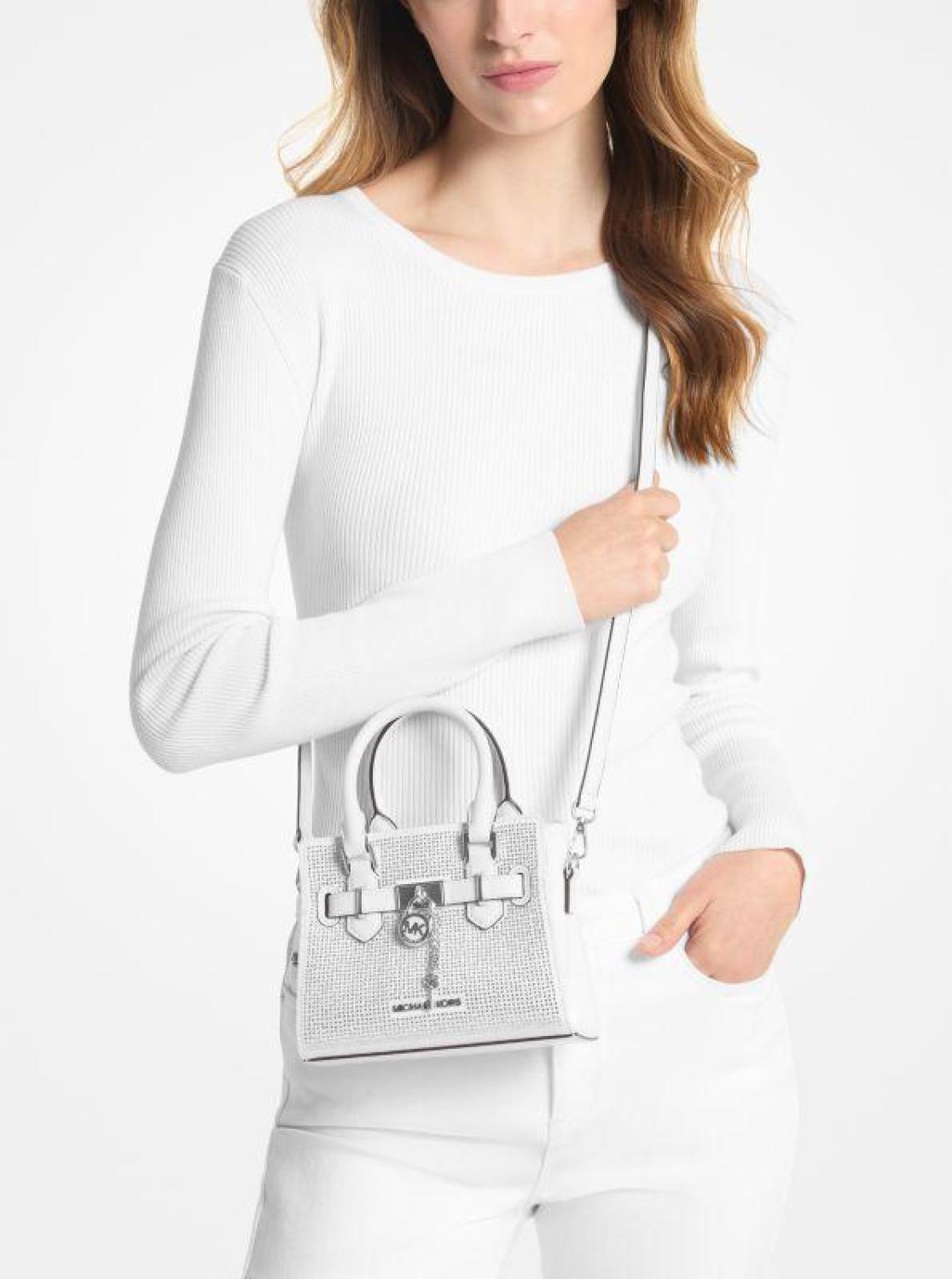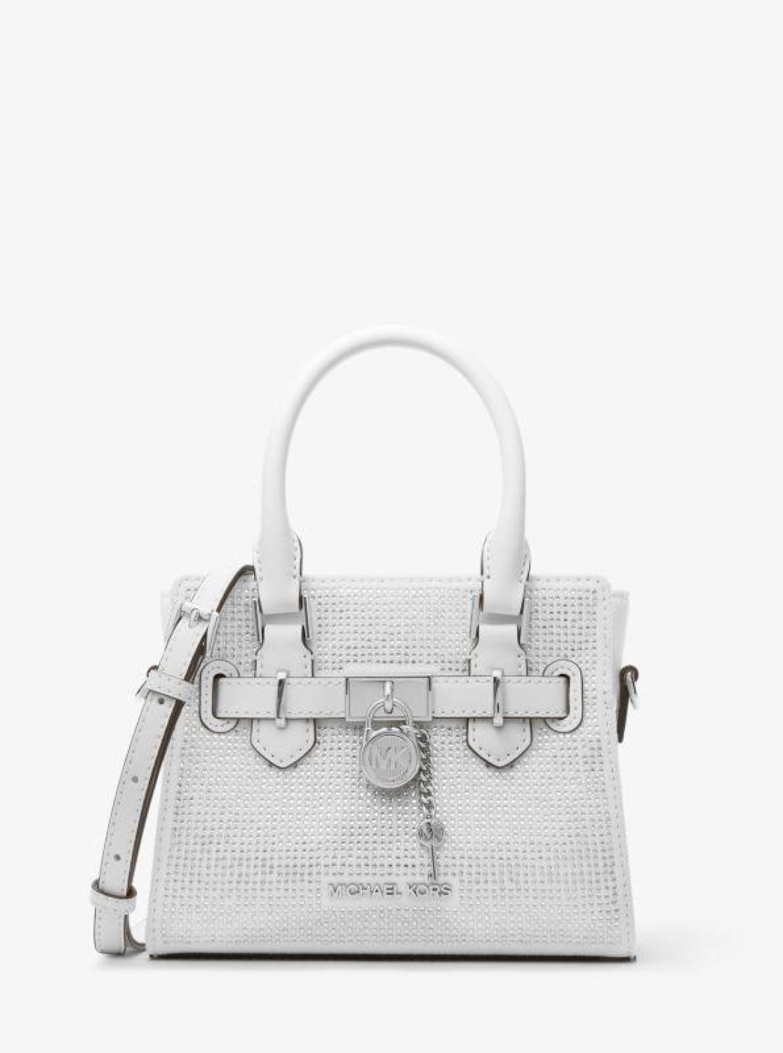 A mini bag with major style, this extra-small take on the denim Hamilton satchel is covered in light-catching crystals and finished with gleaming hardware. Inside slip pockets keep cards and cash organized, while the belted silhouette can be expanded to create additional storage. Match your jewelry to the decorative padlock charm.