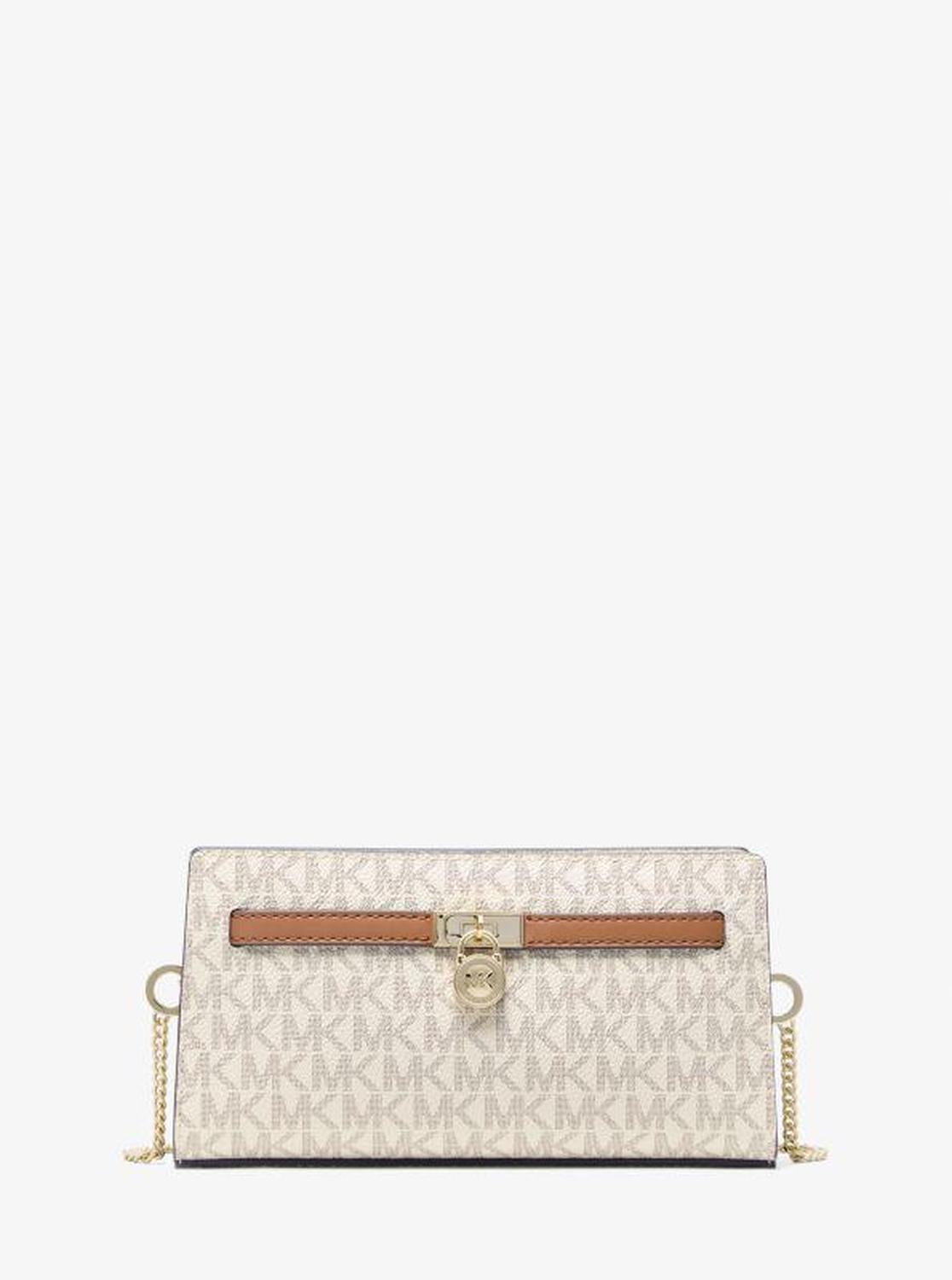 • A wallet so chic and sophisticated, you’ll want to wear it alone. Inspired by the brand’s most beloved bag, the Hamilton Moderne reimagines classic money pieces with a Signature logo-print finish, gleaming belted padlock and chain-link detail. Wear it by the detachable crossbody strap for on-the-go style or toss it into the matching tote bag as an everyday essential.