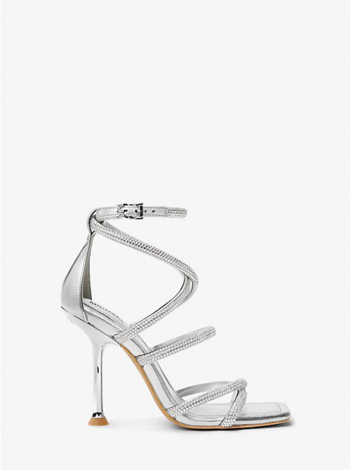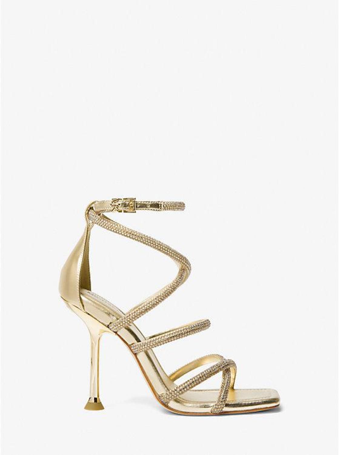 • Covered in glittering crystal embellishments, our Imani sandals feature slim, crossover straps that elegantly frame the shape of your feet. They’re crafted from metallic faux suede and rest on a lacquered heel. Consider them a chic companion to the season’s one-of-a-kind prints.