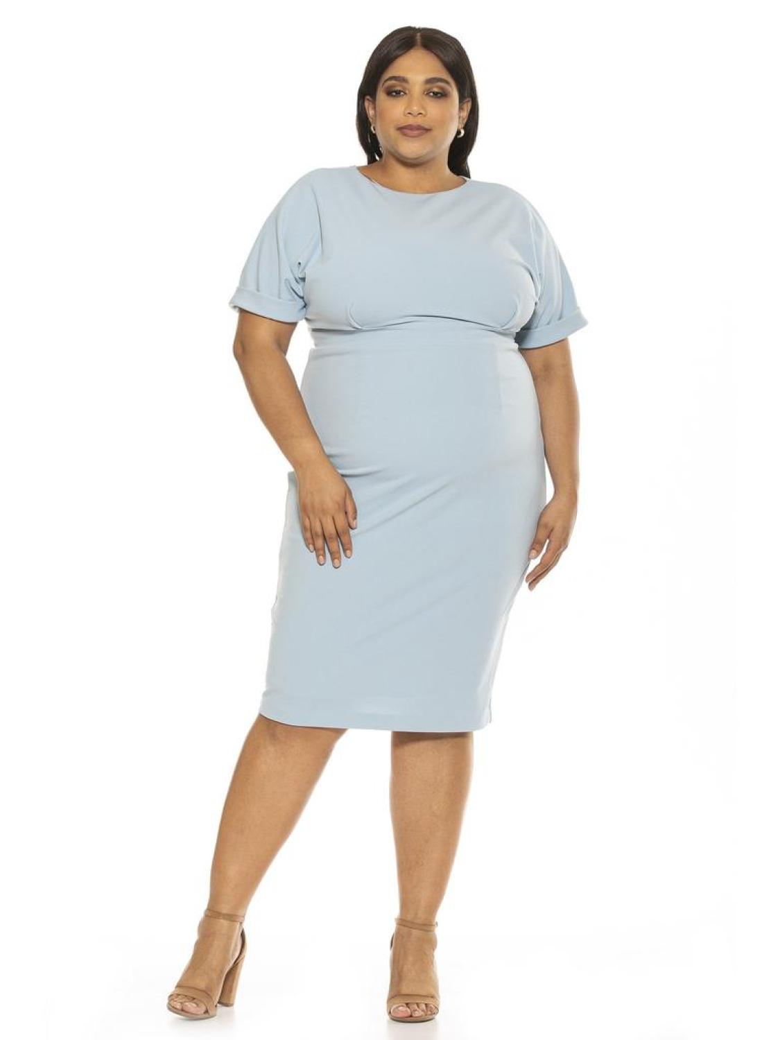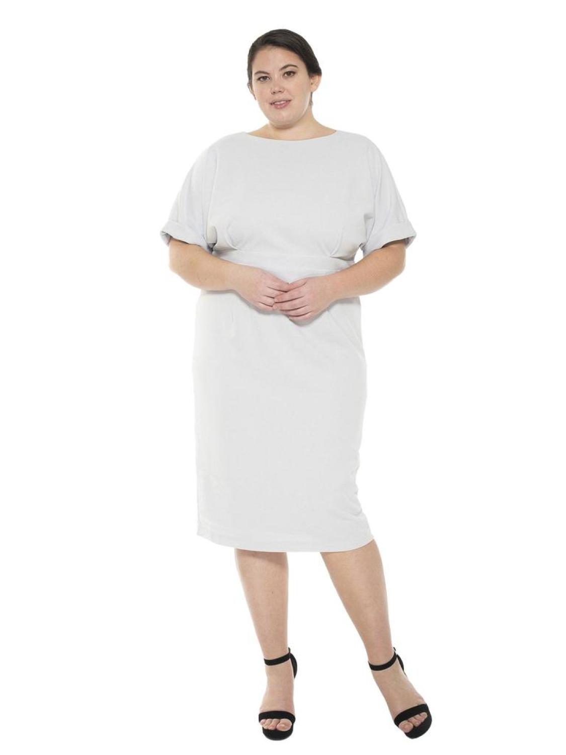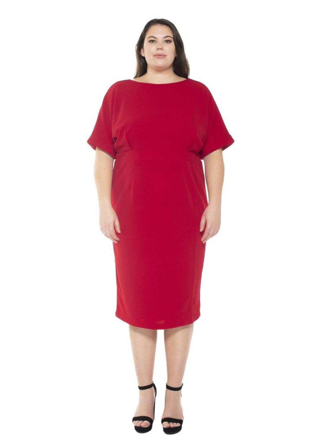 PRODUCT FEATURES Sheath Dress Dolman Sleeve Boat neckline Short dolman sleeves Below the knee midi length Scuba Crepe 95% Polyester, 5% Spandex Lined - 100% Polyester Machine wash, tumble dry low Imported Style D3396PLS