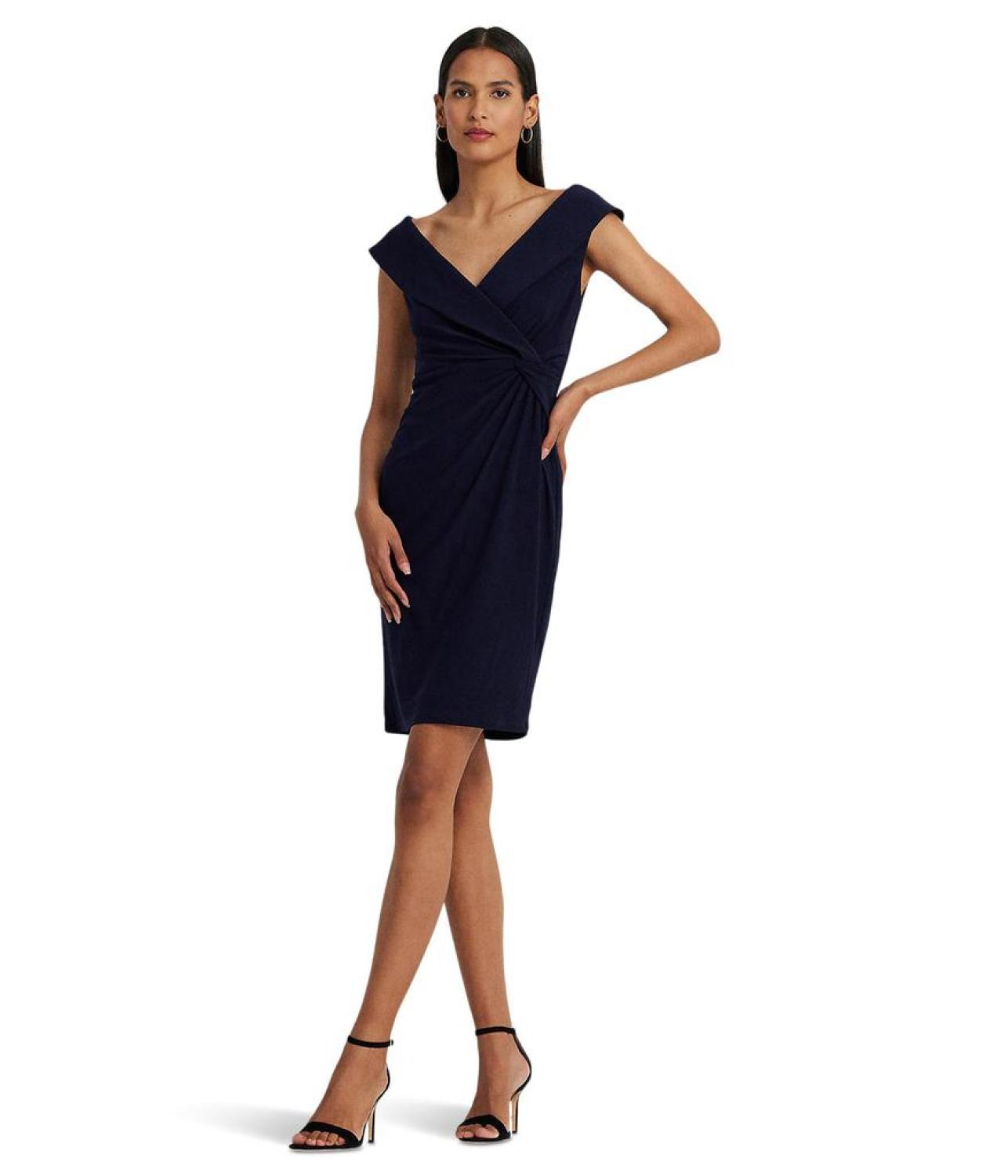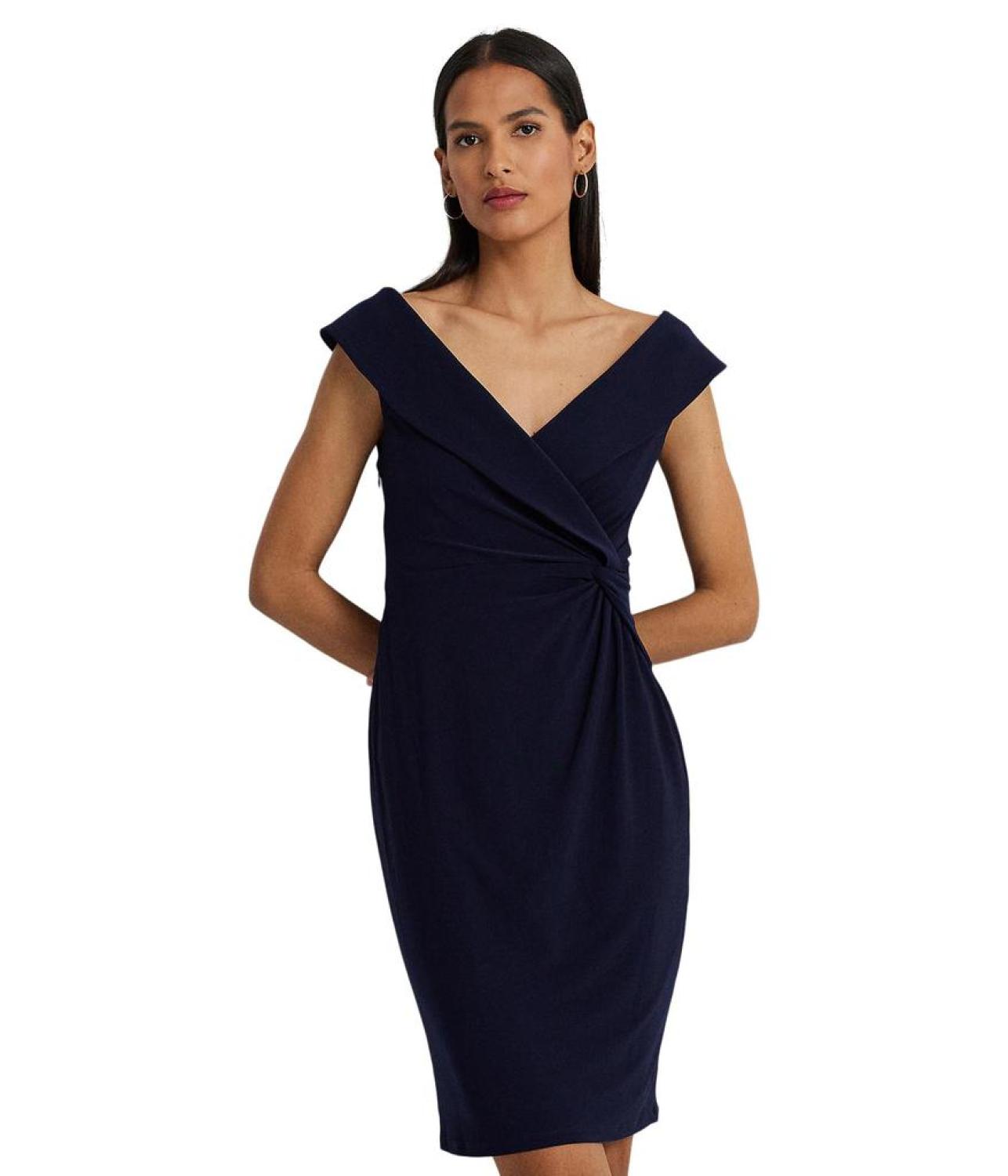 Be your own kind of beautiful wearing the LAUREN Ralph Lauren® Jersey Off-the-Shoulder Cocktail Dress. Tailored for the modern woman, it features foldover collar, sleeveless style, and twisted detail at waist that gives you a petite look.