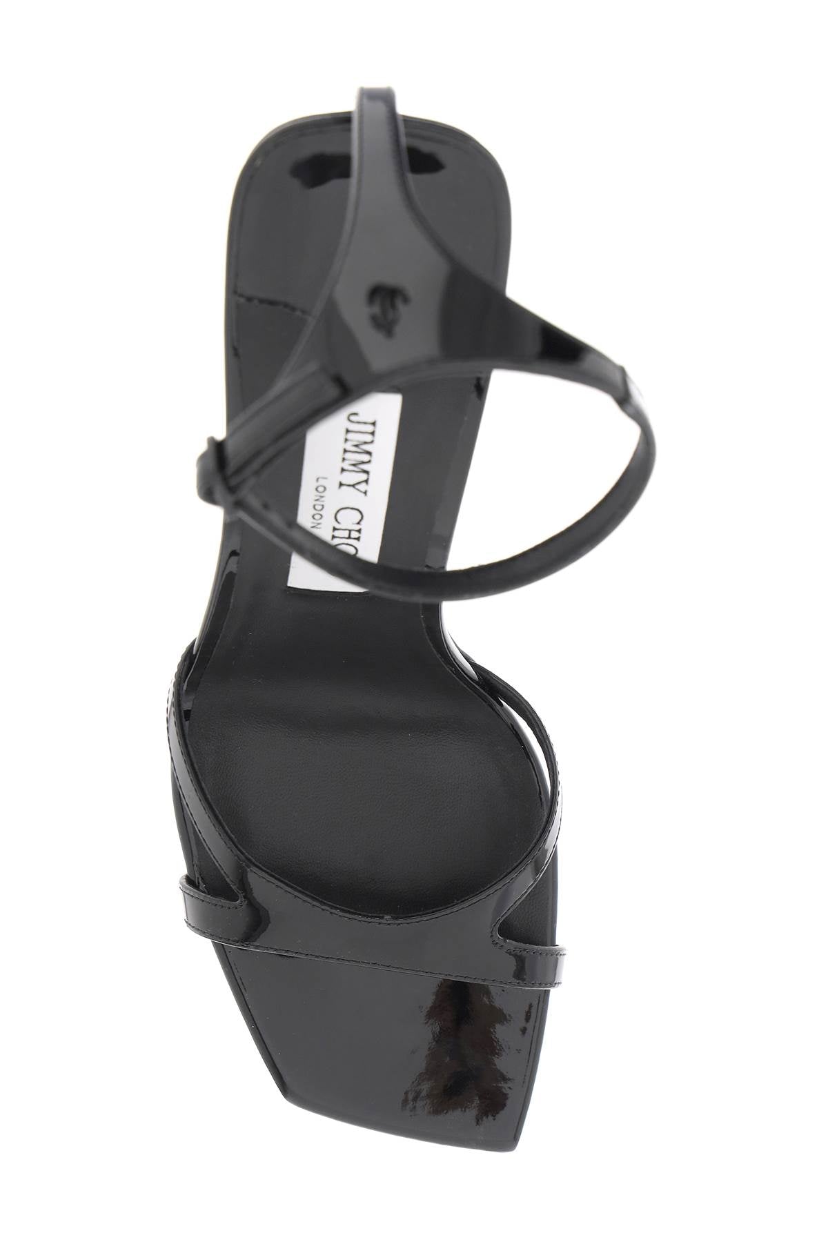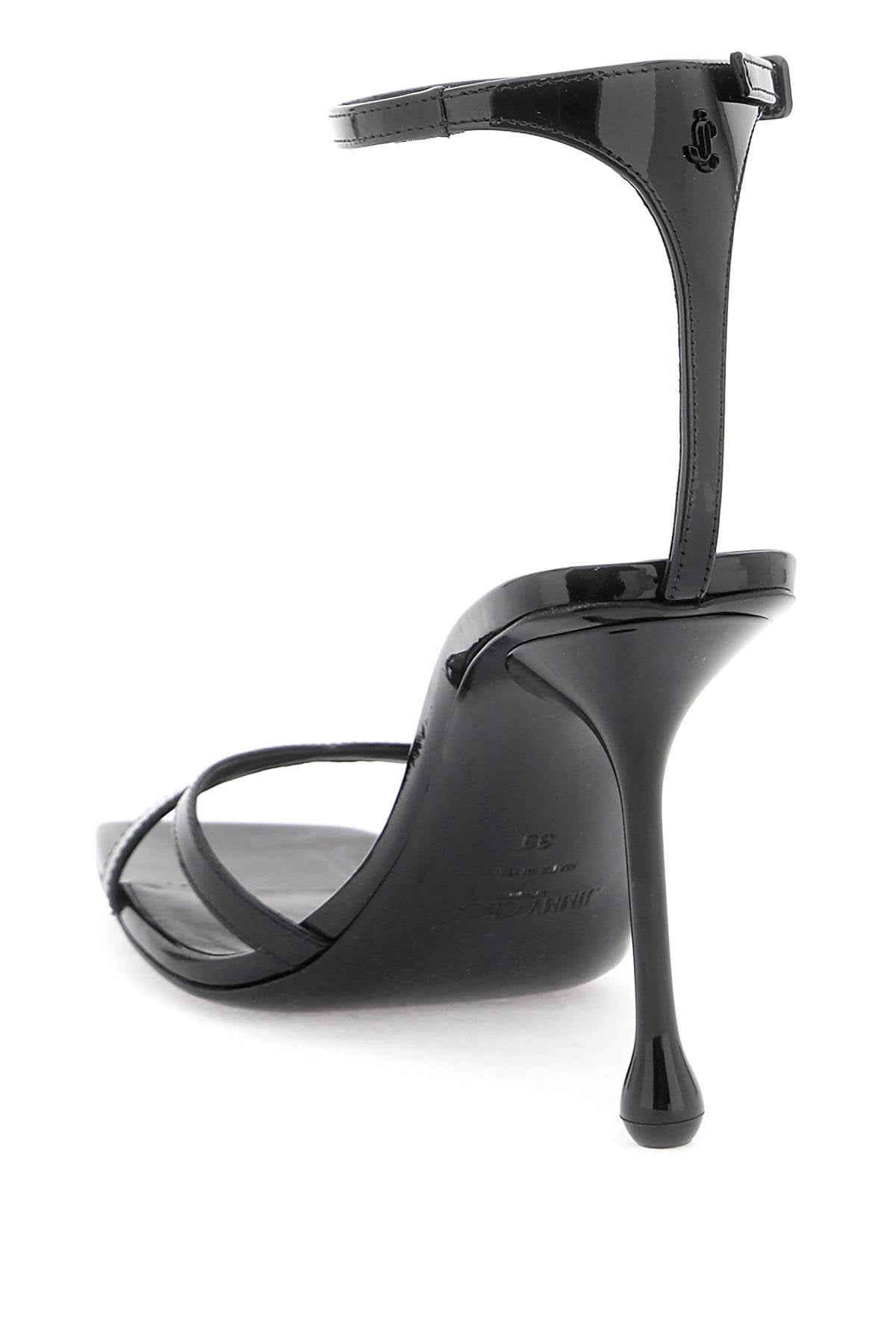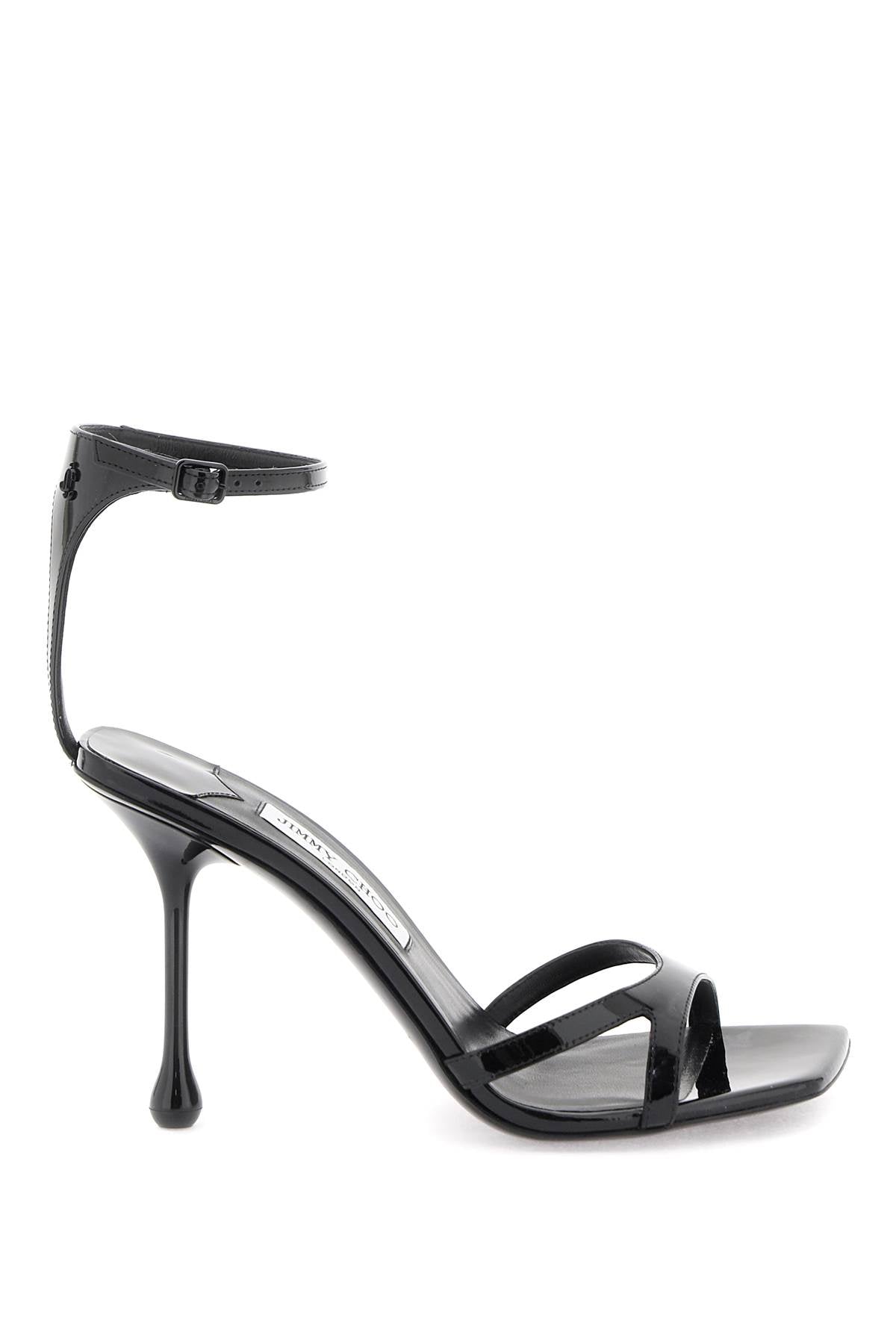 Ixia sandals by Jimmy Choo made of patent leather and featuring a high drop heel. Adjustable ankle strap, leather footbed and leather sole. Heel Height = 9,5 cm