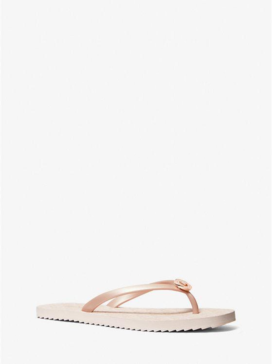 • Elevate your casual footwear with the Jinx flip flop. Set on a Signature print footbed, this pair features a serrated rubber sole and an of-the-moment square toe. Finished with an “MK” charm for added polish, we recommend wearing yours with swimsuits and cotton dresses alike.