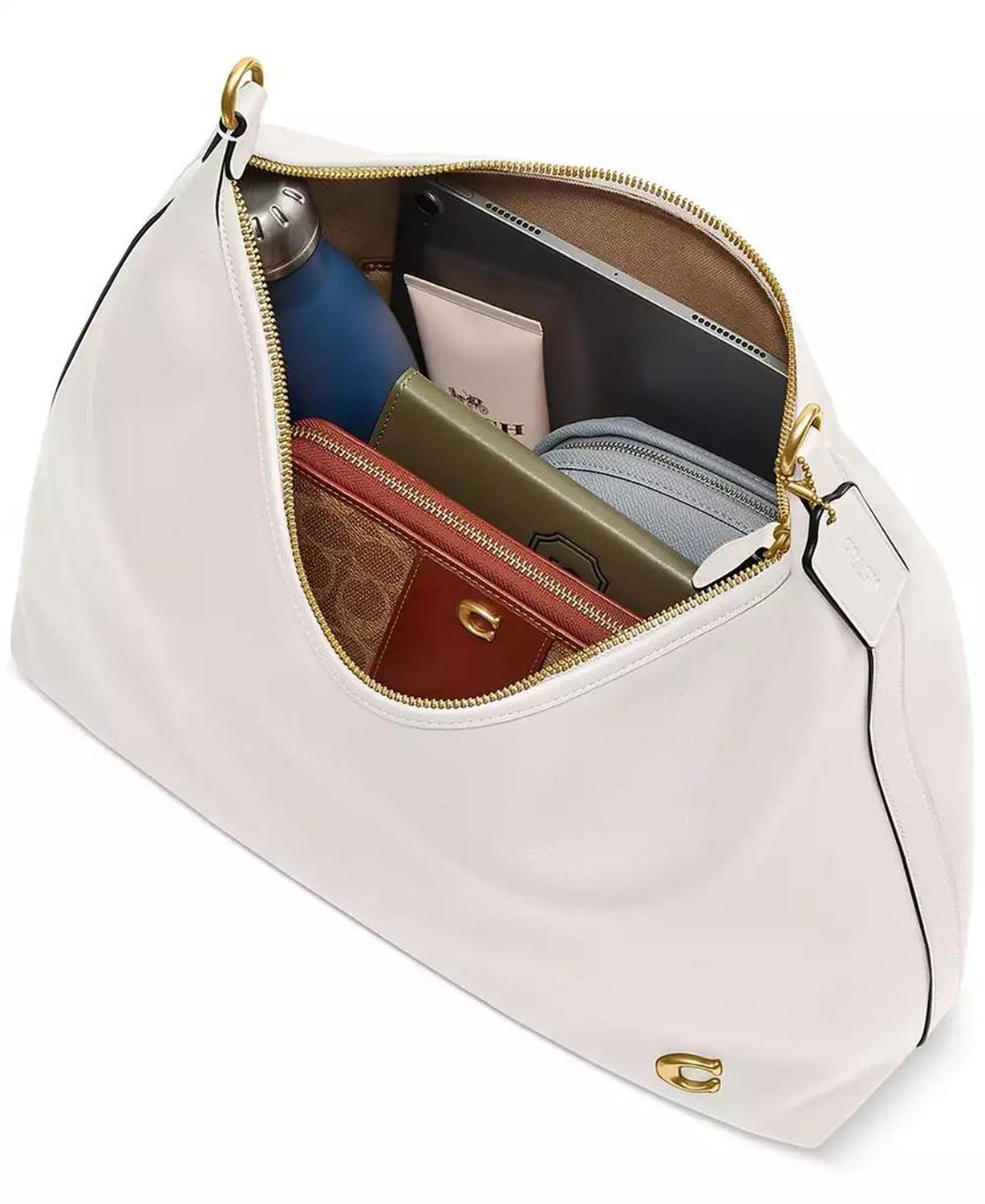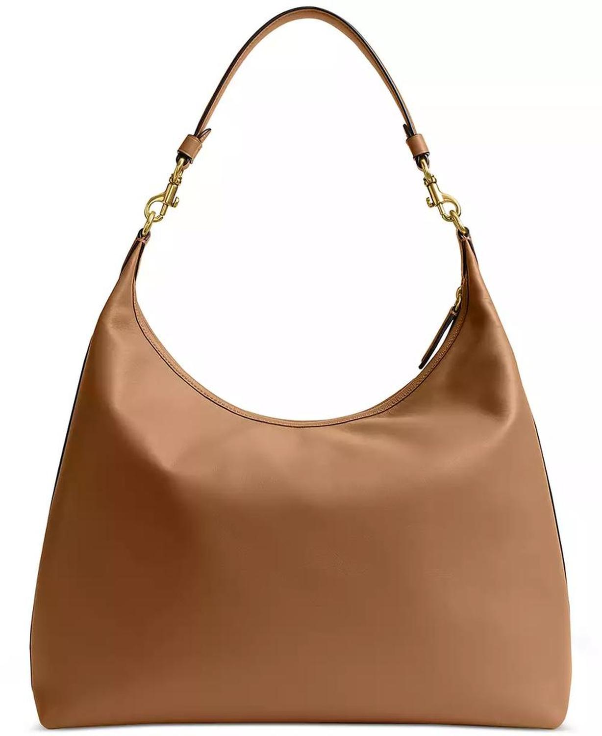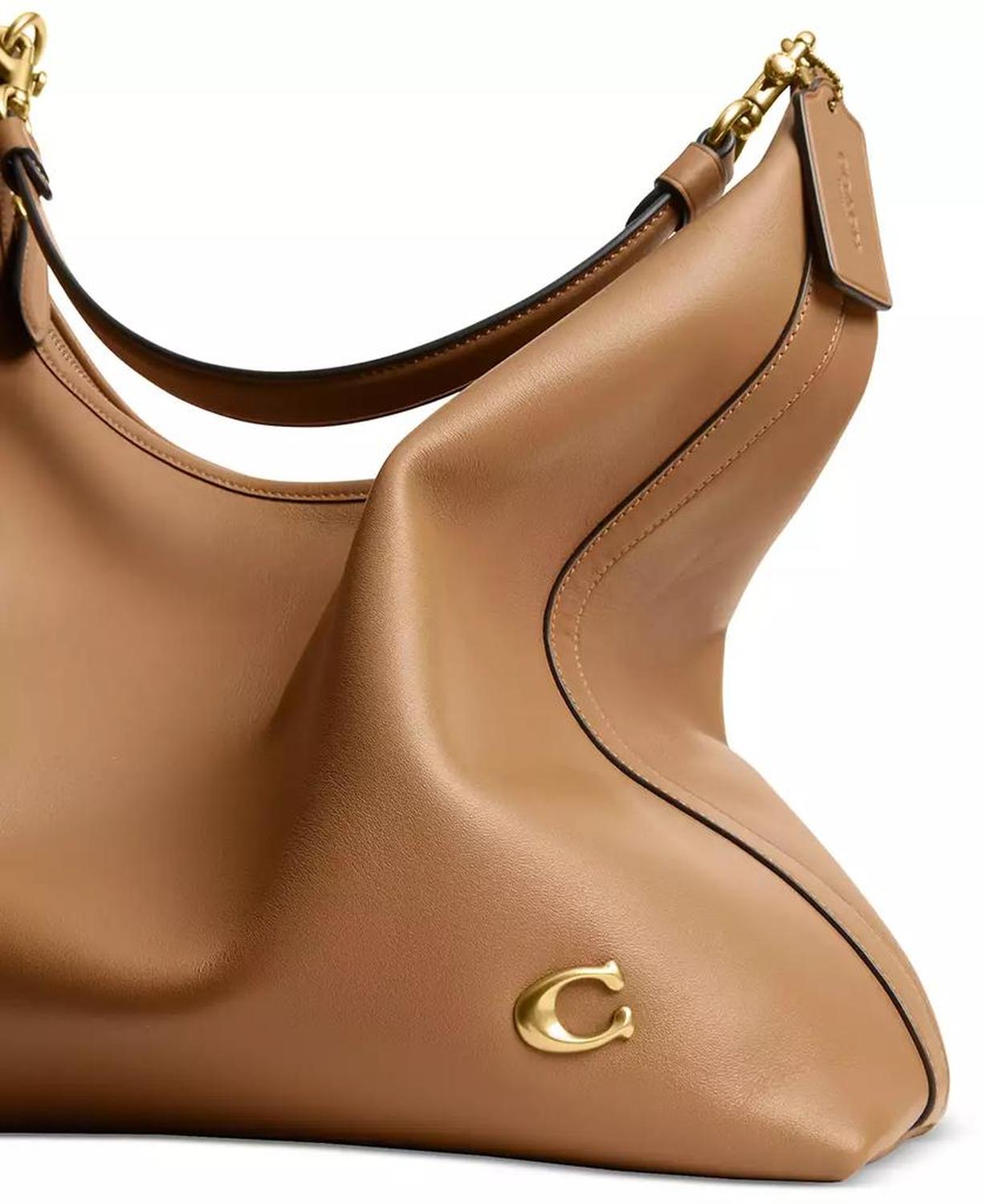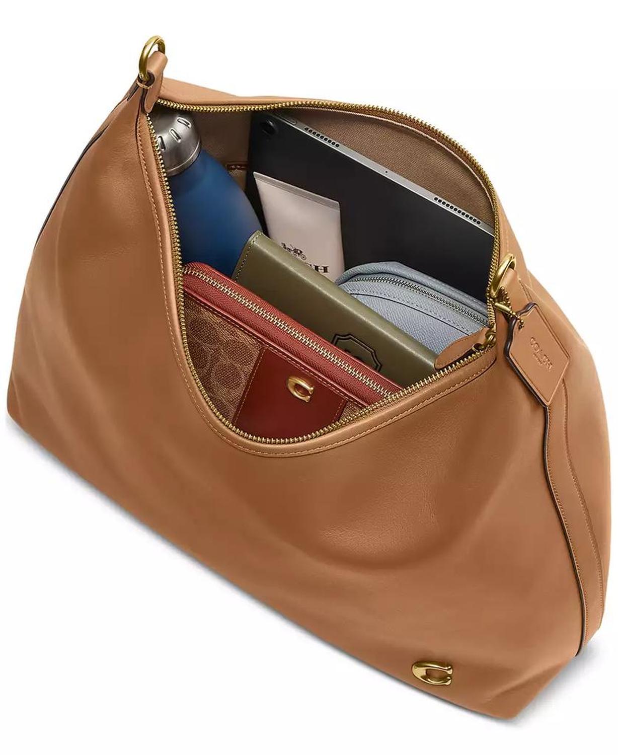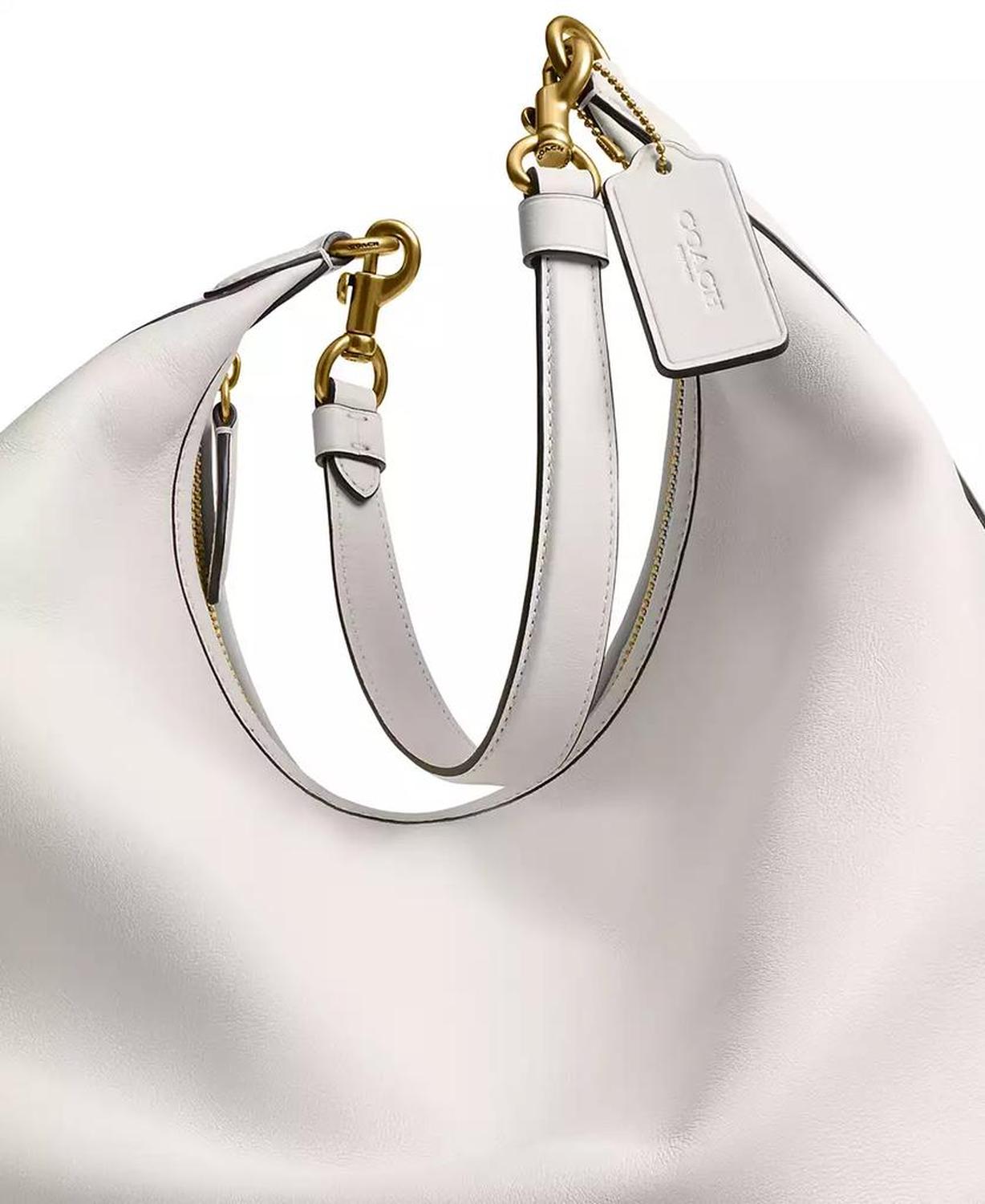 Timeless with a twist, the Juliet bag by COACH is a sophisticated style with a slouchy, relaxed shape. It's sleek, spacious, stylish, functional, and basically everything you want in a bag. Large sized bag; 15"W x 15"H x 5-1/4"D (width is measured across the bottom of handbag); 1.43 lb. approx. weight Silhouette is based on 5'9" model 12" L removable short strap Zip closure Brass exterior hardware; interior snap pocket Tablet compatible (std. size 8"-10") Fabric lining Glove-tanned leather Spot clean