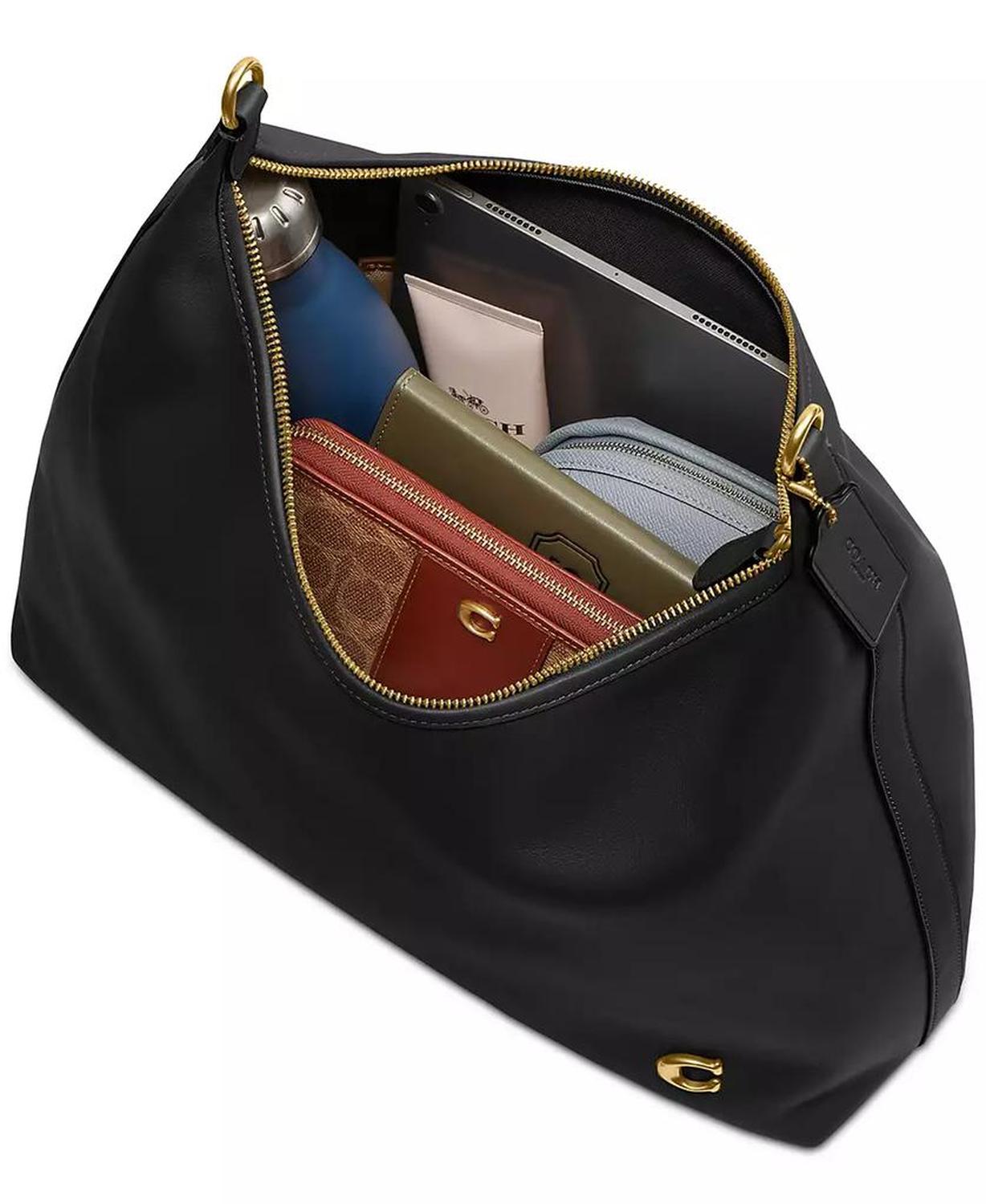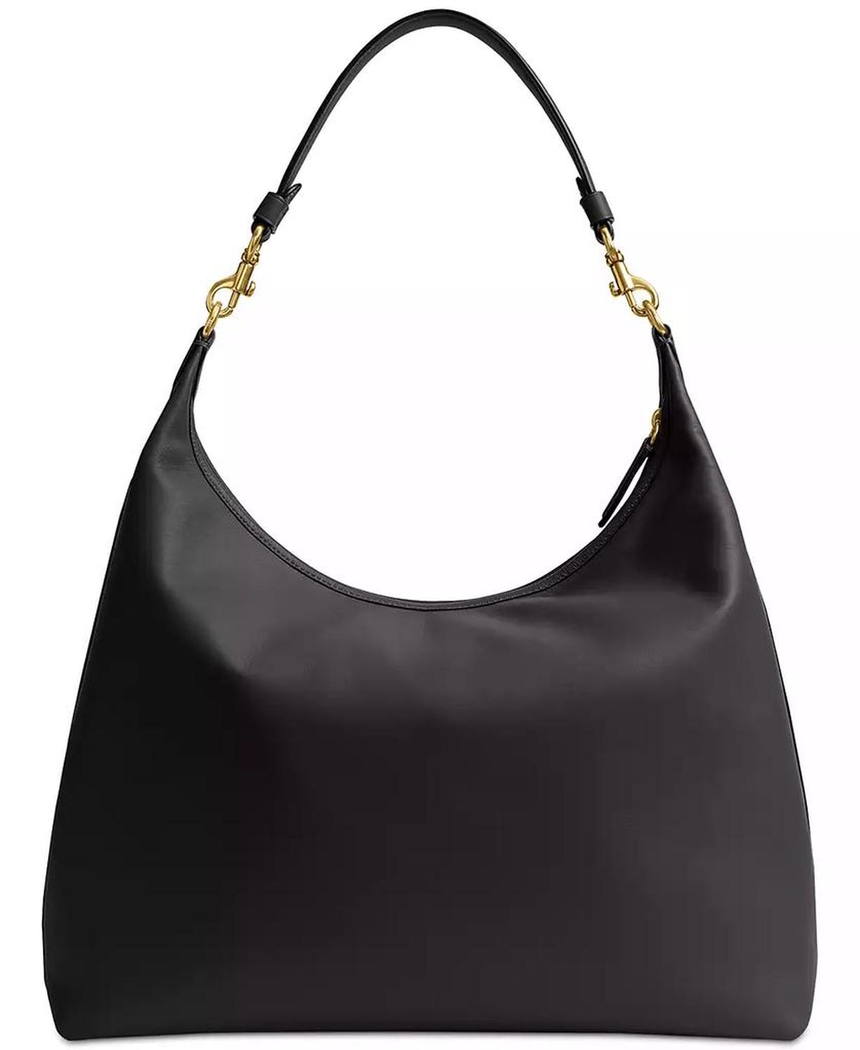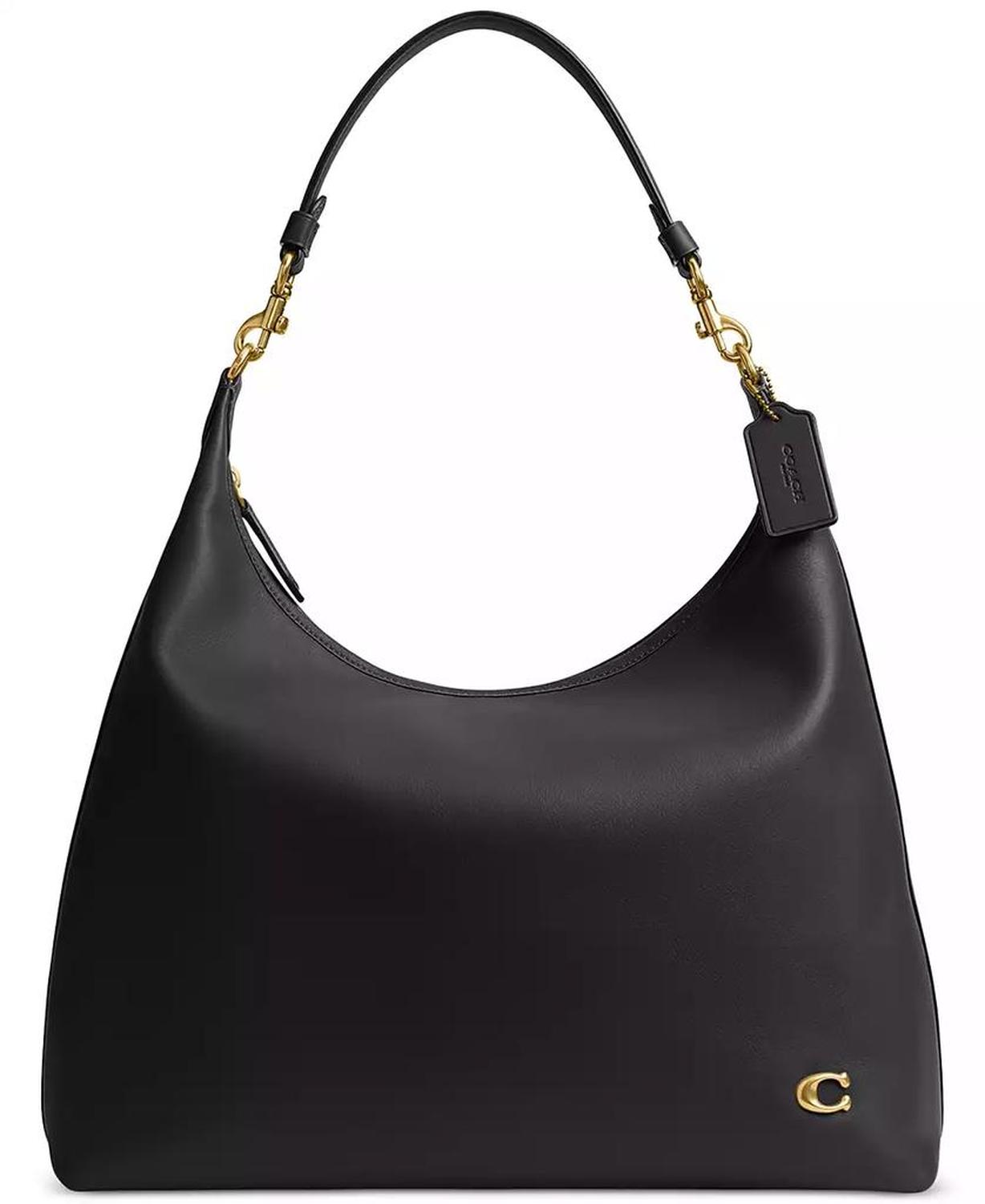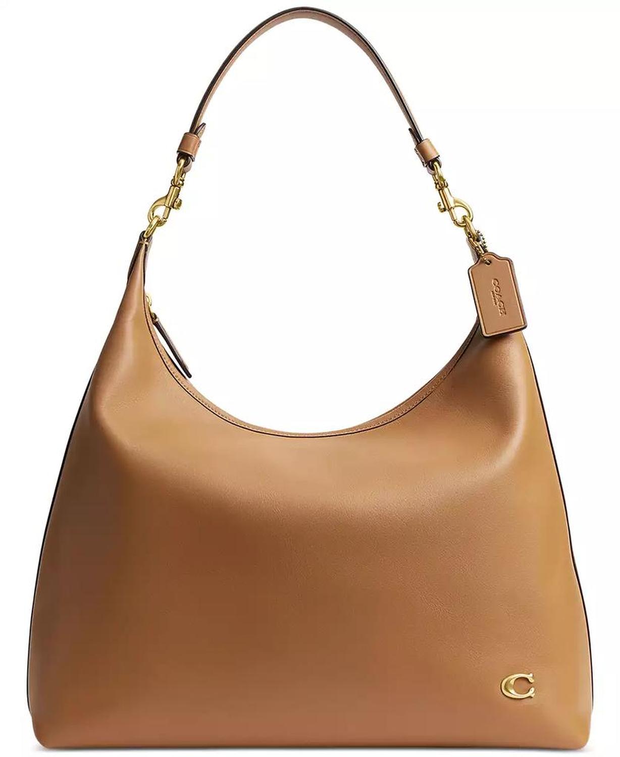 Timeless with a twist, the Juliet bag by COACH is a sophisticated style with a slouchy, relaxed shape. It's sleek, spacious, stylish, functional, and basically everything you want in a bag. Large sized bag; 15"W x 15"H x 5-1/4"D (width is measured across the bottom of handbag); 1.43 lb. approx. weight Silhouette is based on 5'9" model 12" L removable short strap Zip closure Brass exterior hardware; interior snap pocket Tablet compatible (std. size 8"-10") Fabric lining Glove-tanned leather Spot clean