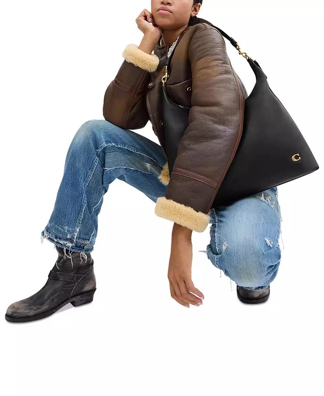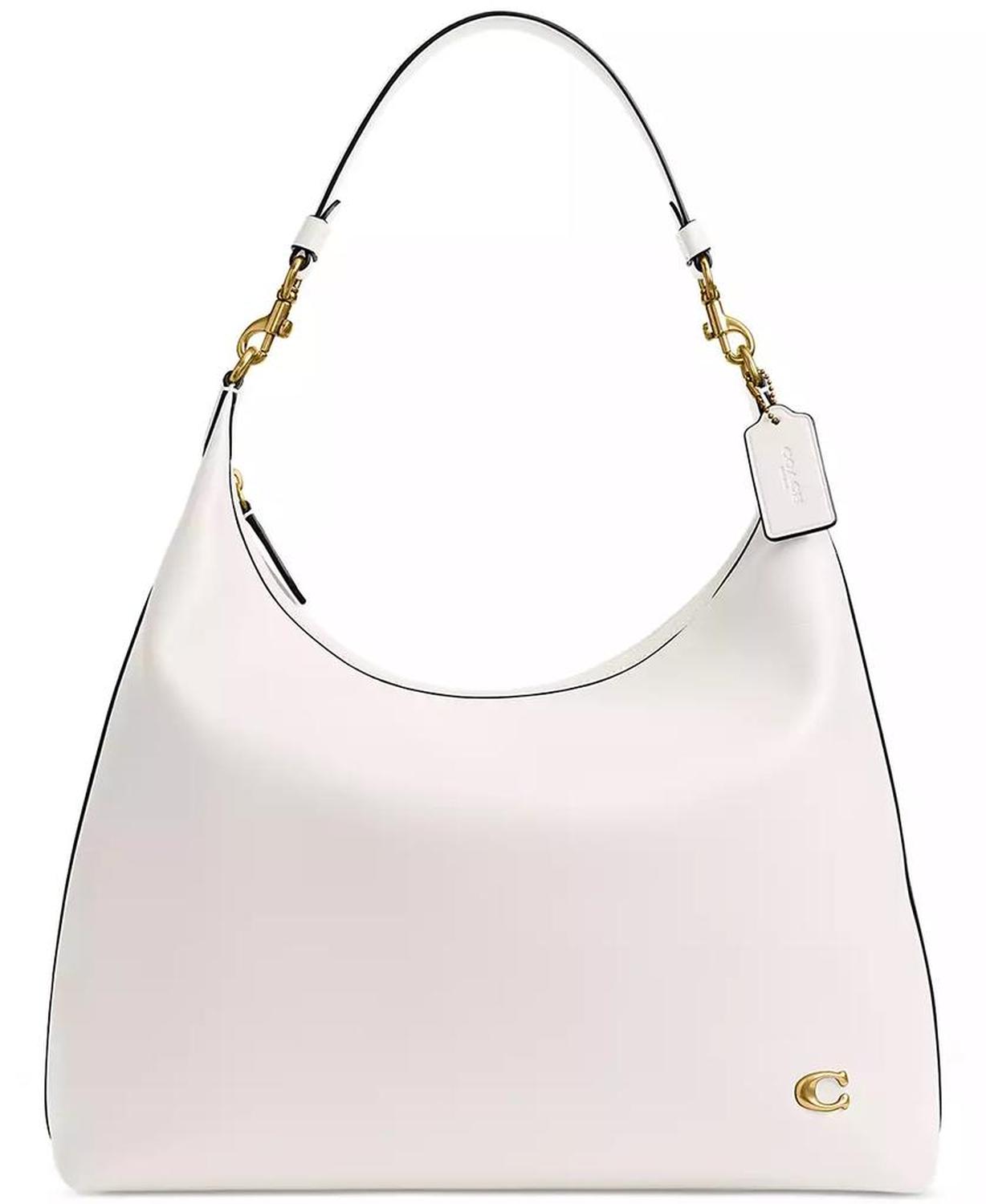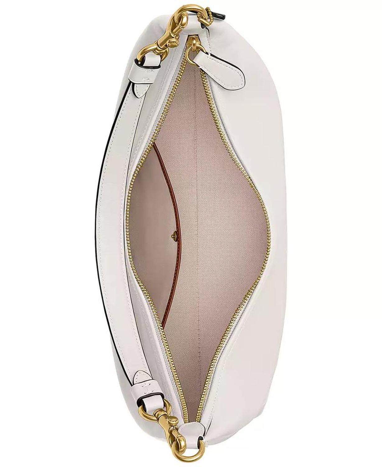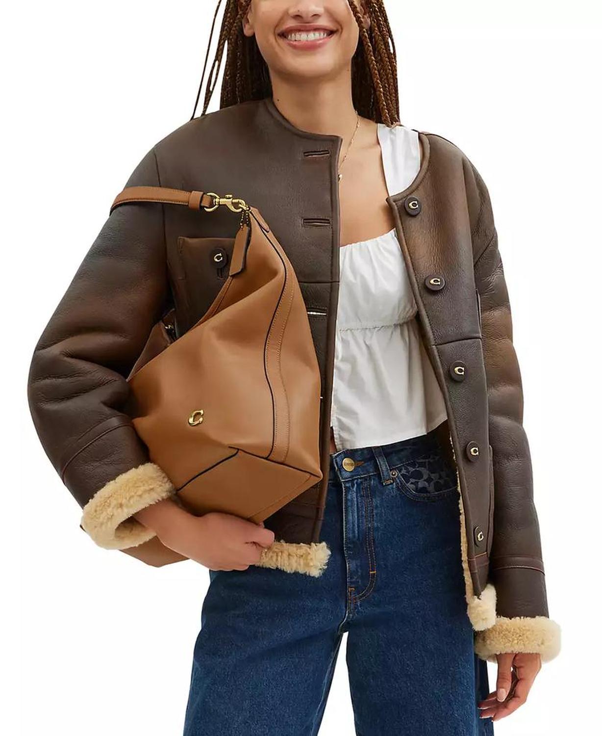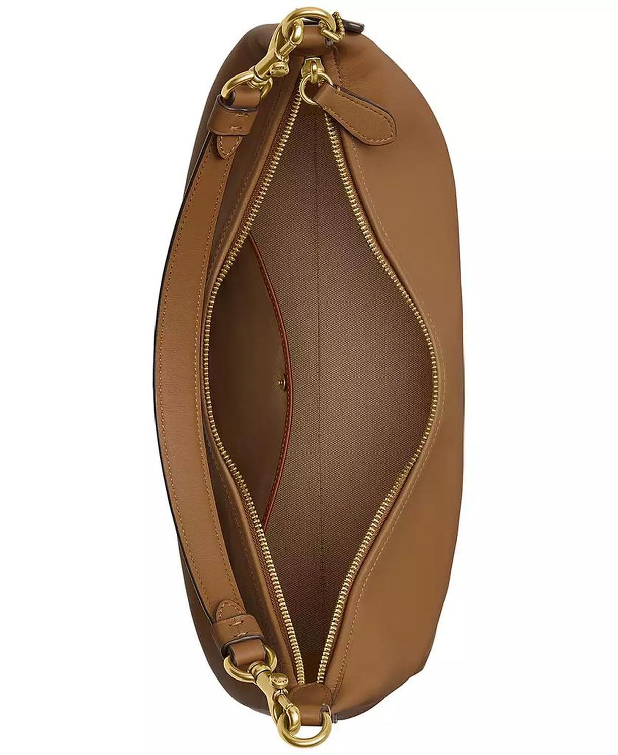 Timeless with a twist, the Juliet bag by COACH is a sophisticated style with a slouchy, relaxed shape. It's sleek, spacious, stylish, functional, and basically everything you want in a bag. Large sized bag; 15"W x 15"H x 5-1/4"D (width is measured across the bottom of handbag); 1.43 lb. approx. weight Silhouette is based on 5'9" model 12" L removable short strap Zip closure Brass exterior hardware; interior snap pocket Tablet compatible (std. size 8"-10") Fabric lining Glove-tanned leather Spot clean
