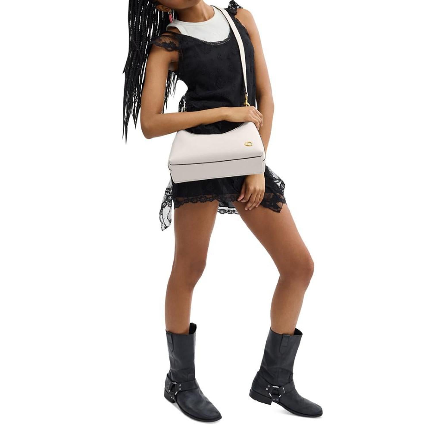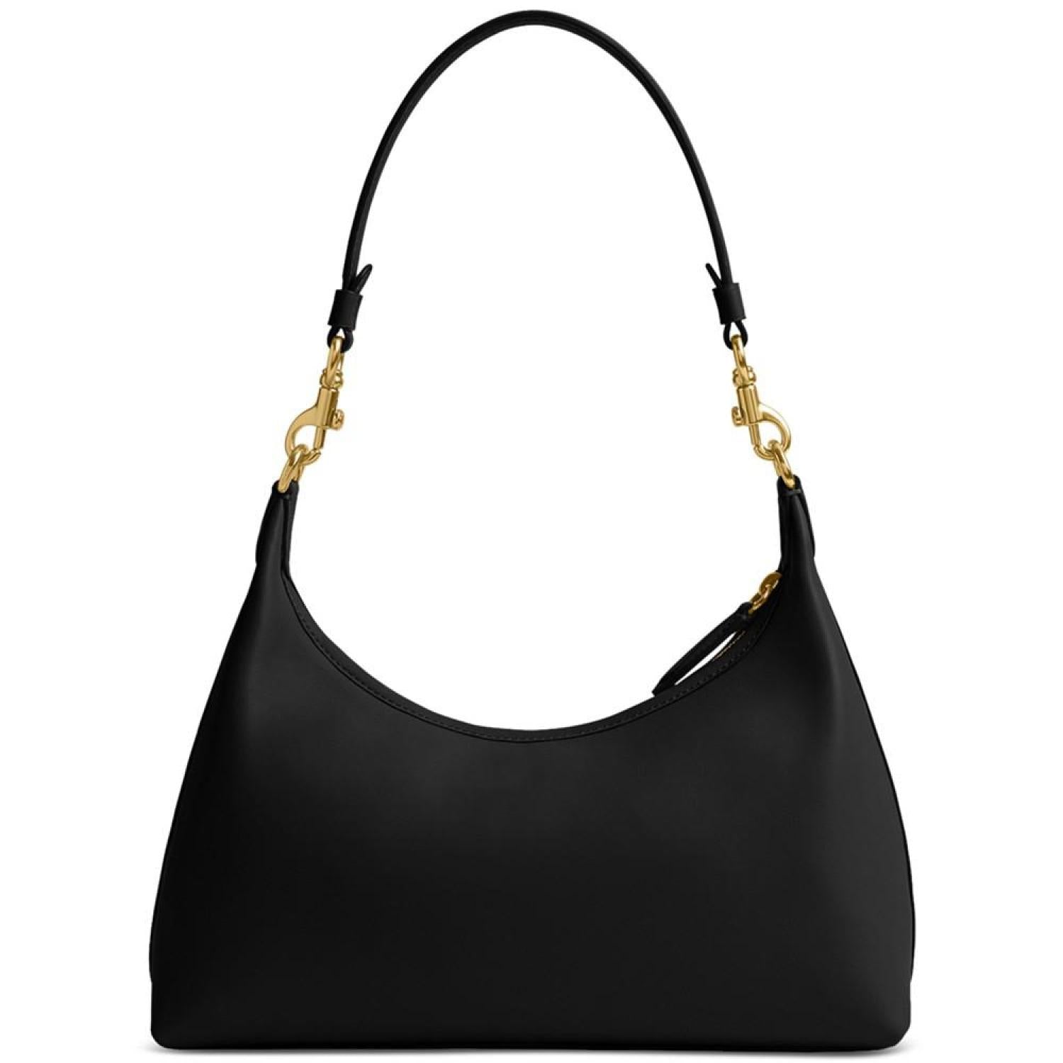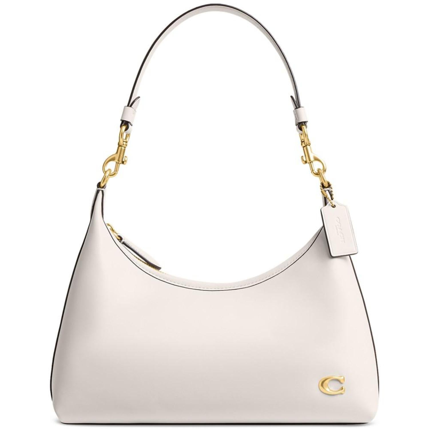 This leather handbag by COACH is the perfect everyday accessory. Complimenting anything you pair it with, the removable strap and handle offers style versatility while the metal logo lends an iconic finish. Medium sized bag; 12"W x 8-3/4"H x 4-1/2"D (width is measured across the bottom of handbag) Silhouette is based off 5'9" model 11"L removable handle; 21-1/2"L removable strap Zippered closure Gold-tone hardware & metal logo, interior slip snap pocket Leather Spot clean Imported