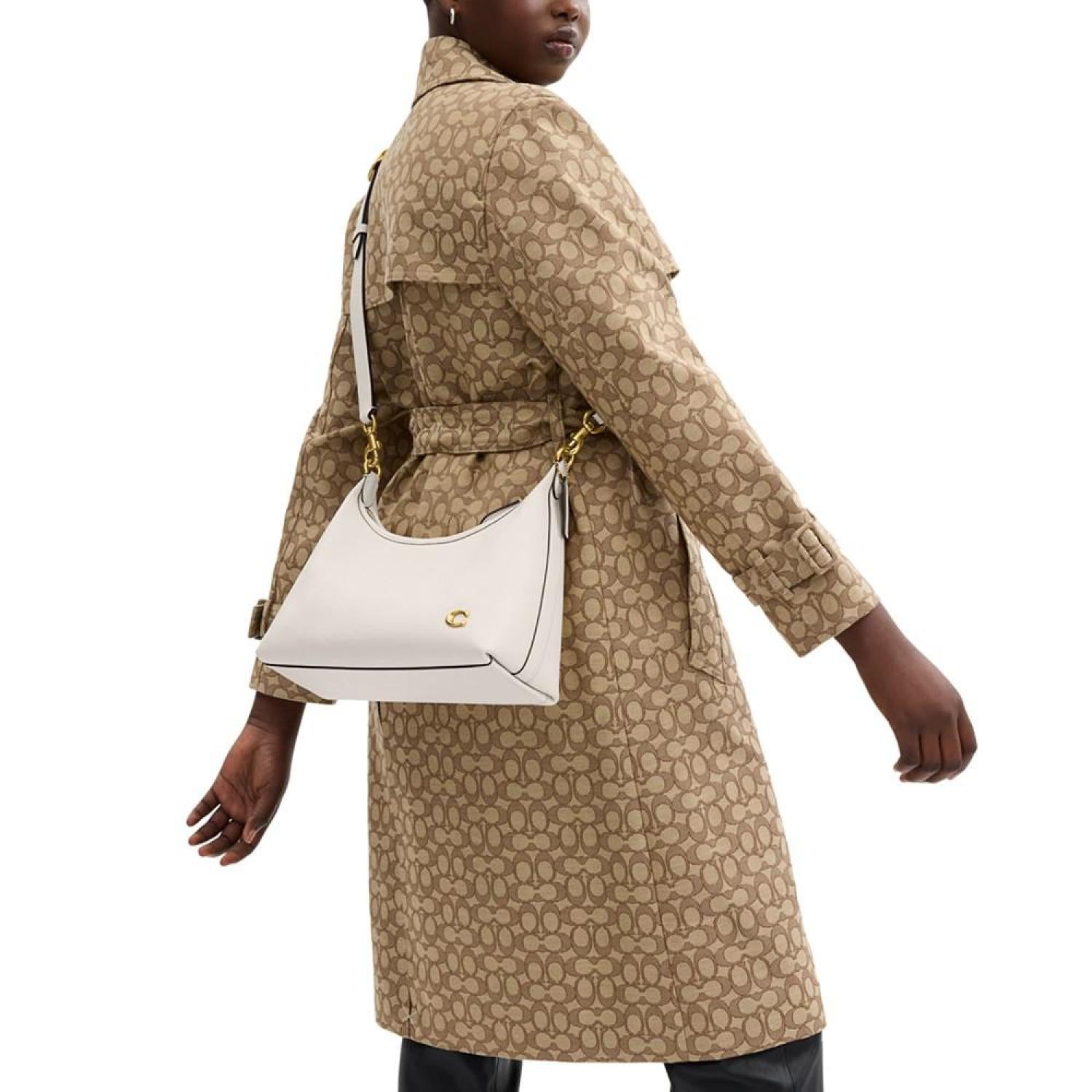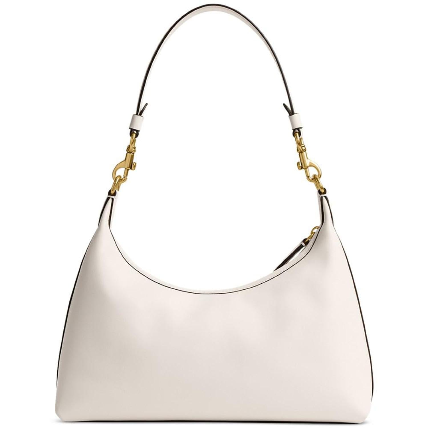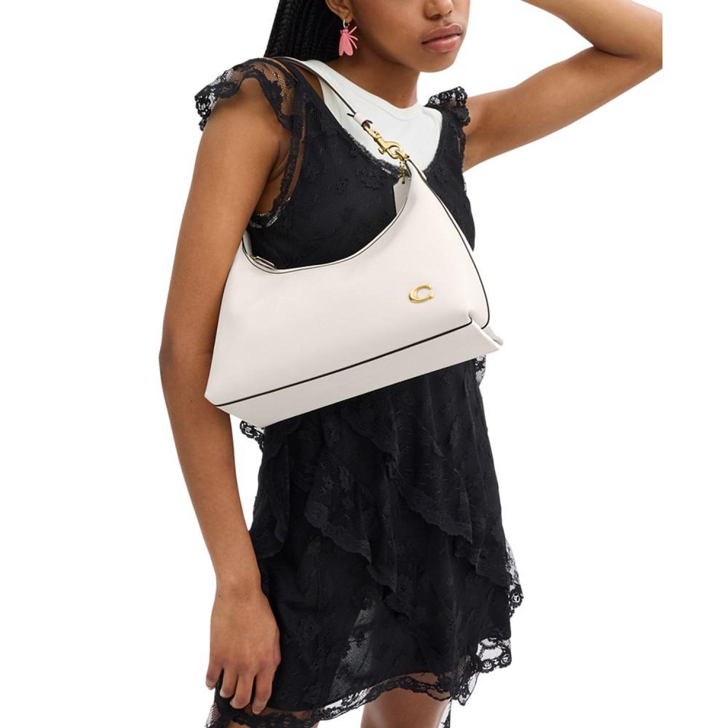 This leather handbag by COACH is the perfect everyday accessory. Complimenting anything you pair it with, the removable strap and handle offers style versatility while the metal logo lends an iconic finish. Medium sized bag; 12"W x 8-3/4"H x 4-1/2"D (width is measured across the bottom of handbag) Silhouette is based off 5'9" model 11"L removable handle; 21-1/2"L removable strap Zippered closure Gold-tone hardware & metal logo, interior slip snap pocket Leather Spot clean Imported