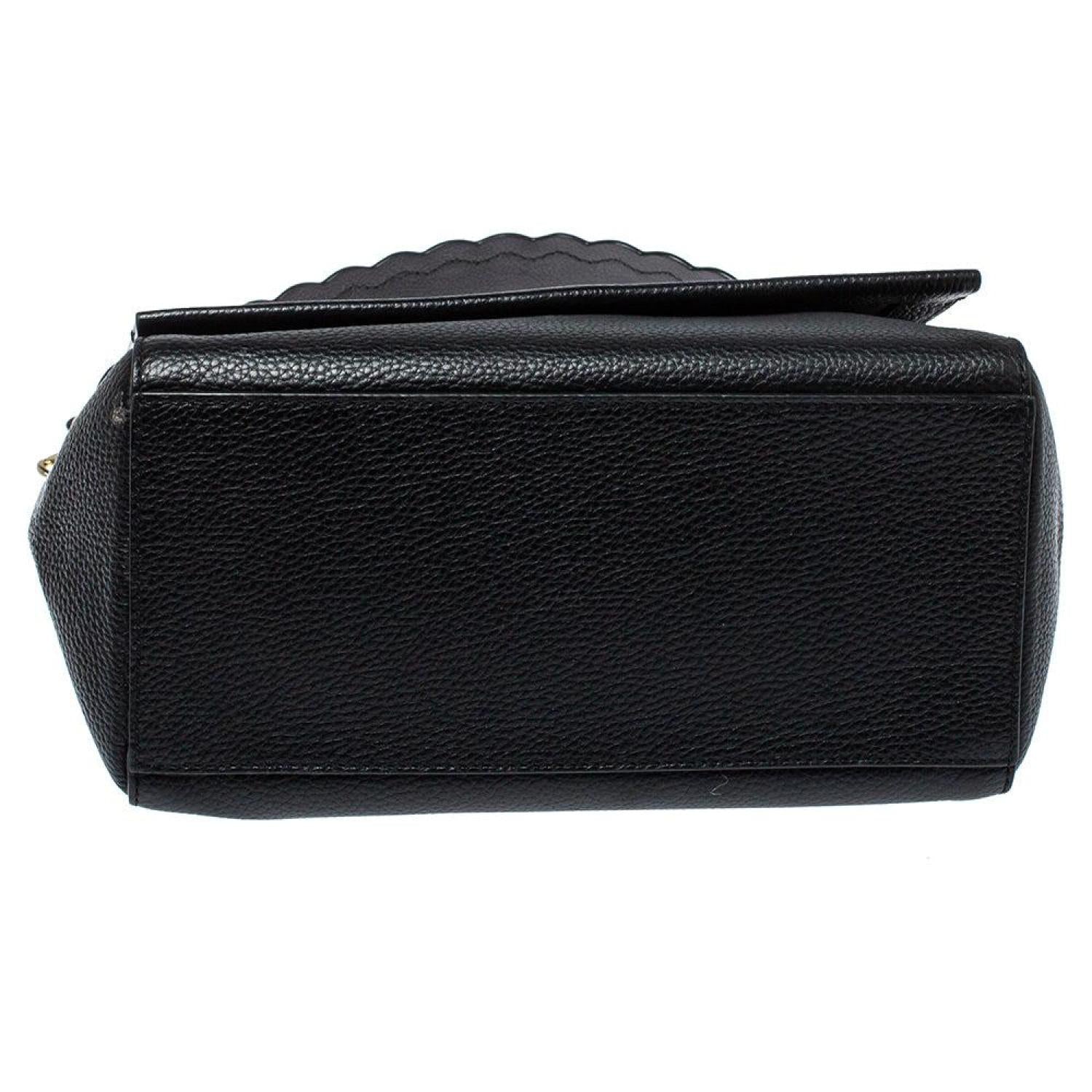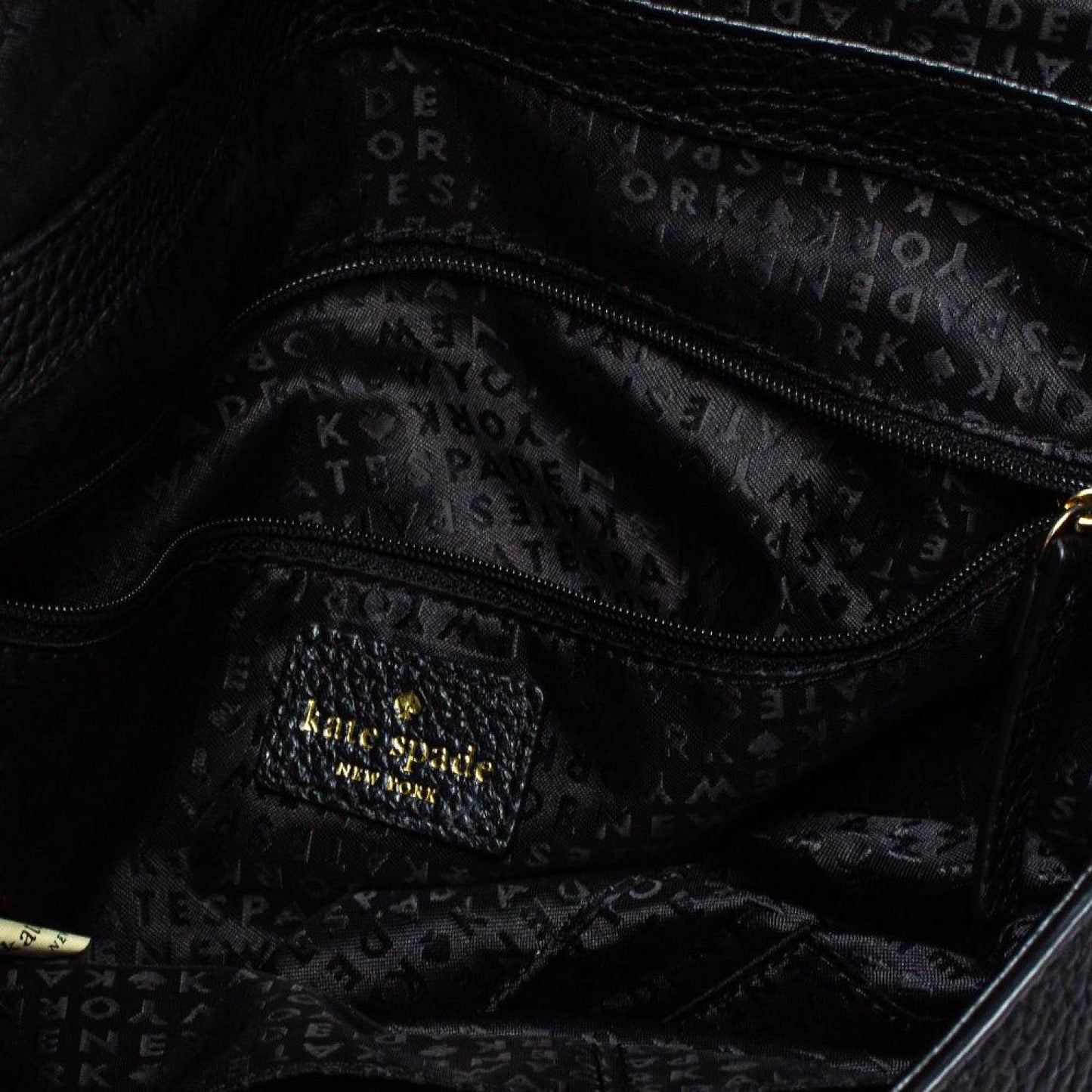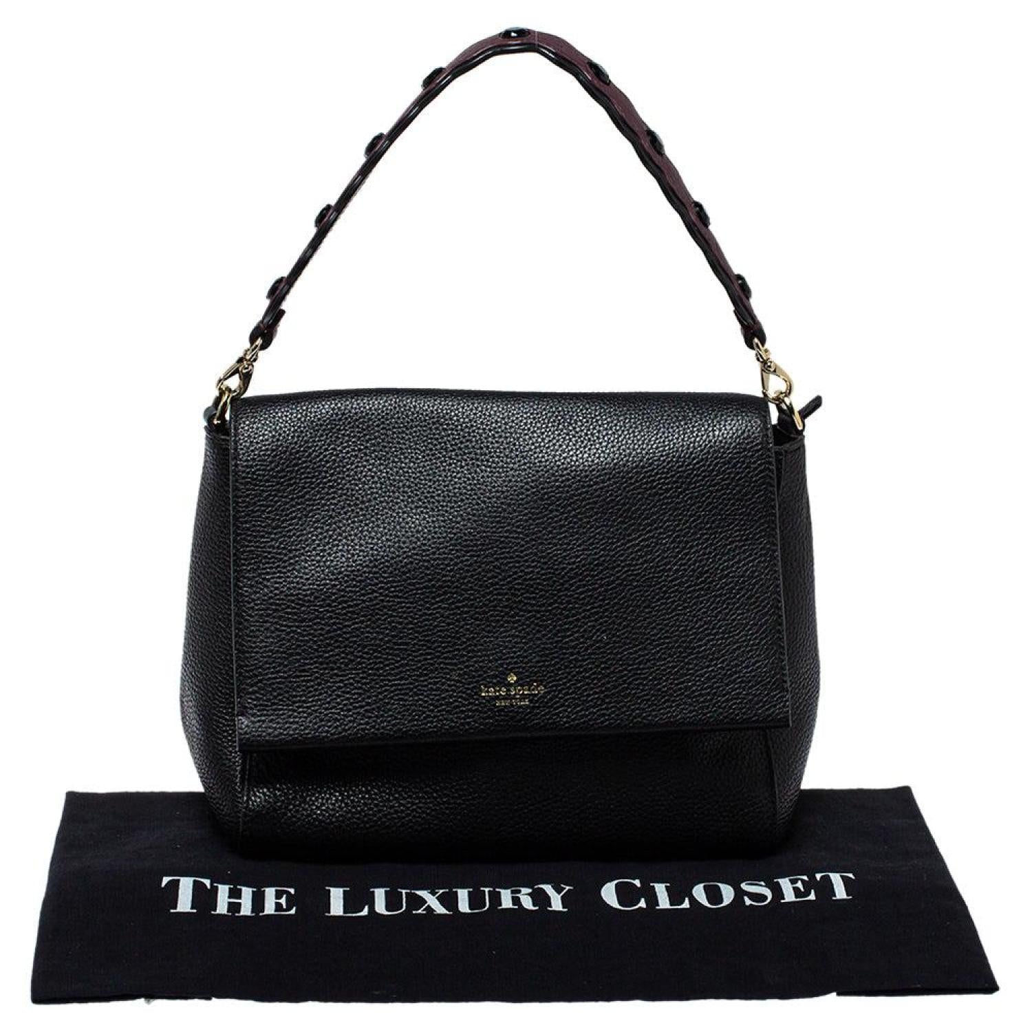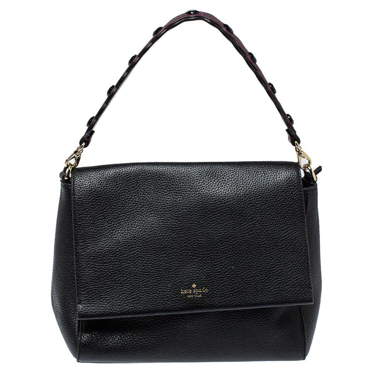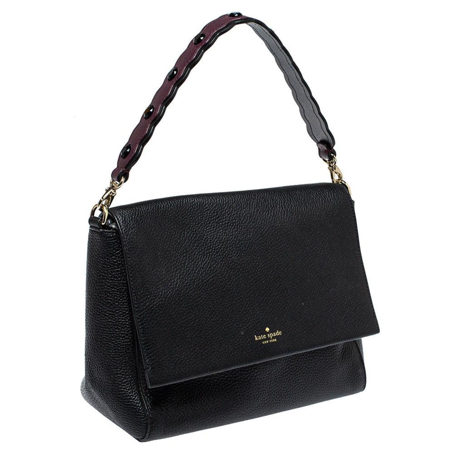 • This fine looking satchel bag is by Kate Spade. It has been crafted from quality leather and carries a classy shade of black. The bag has a front flap with the logo and it opens to a fabric lined interior. The satchel is held by a scalloped shoulder handle and finished with gold tone hardware.