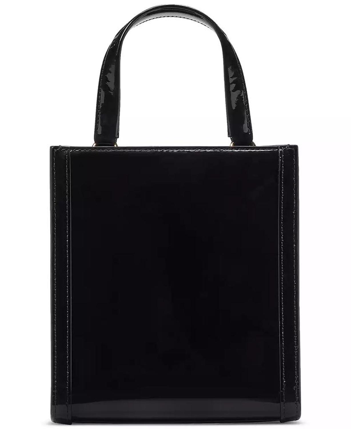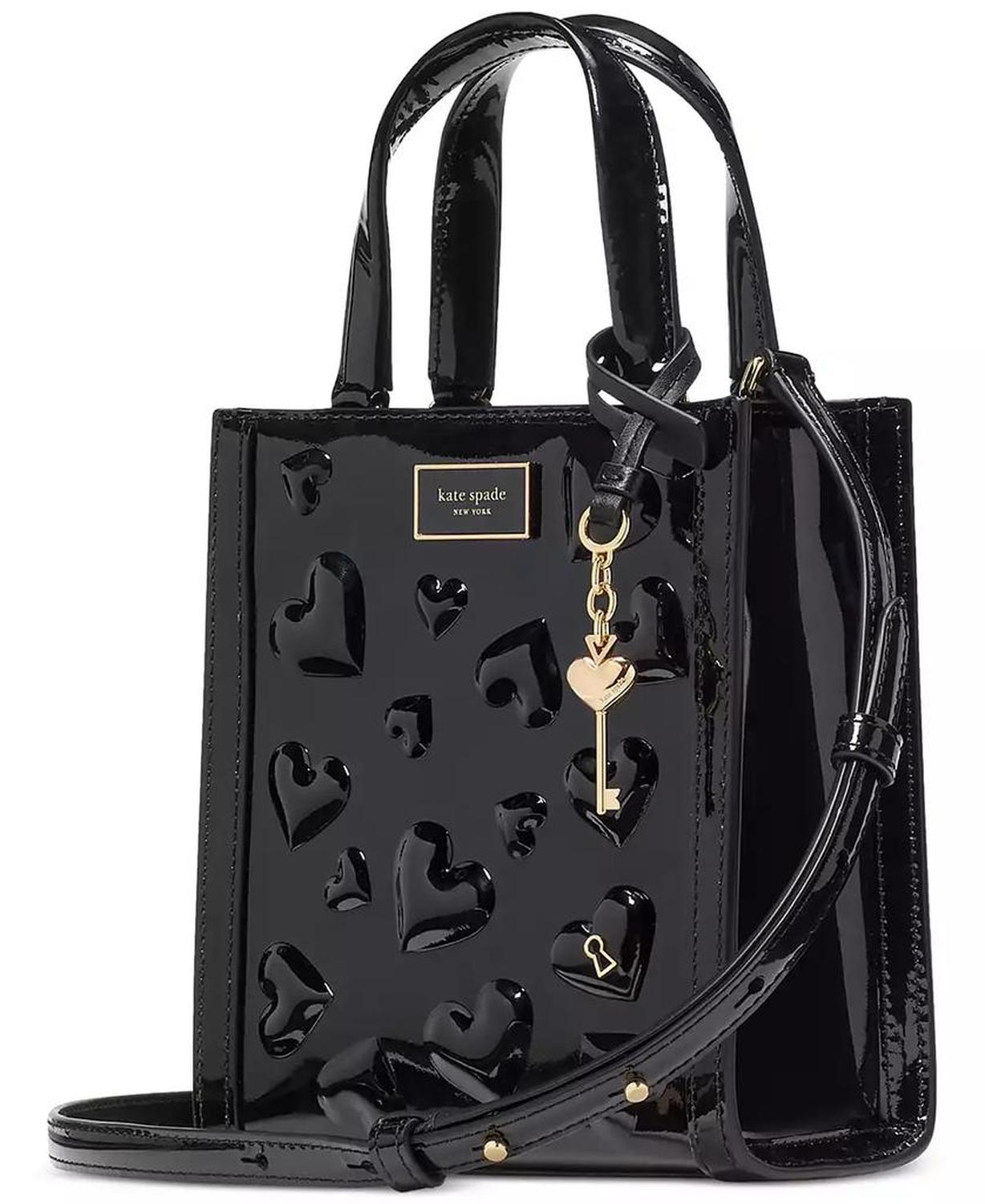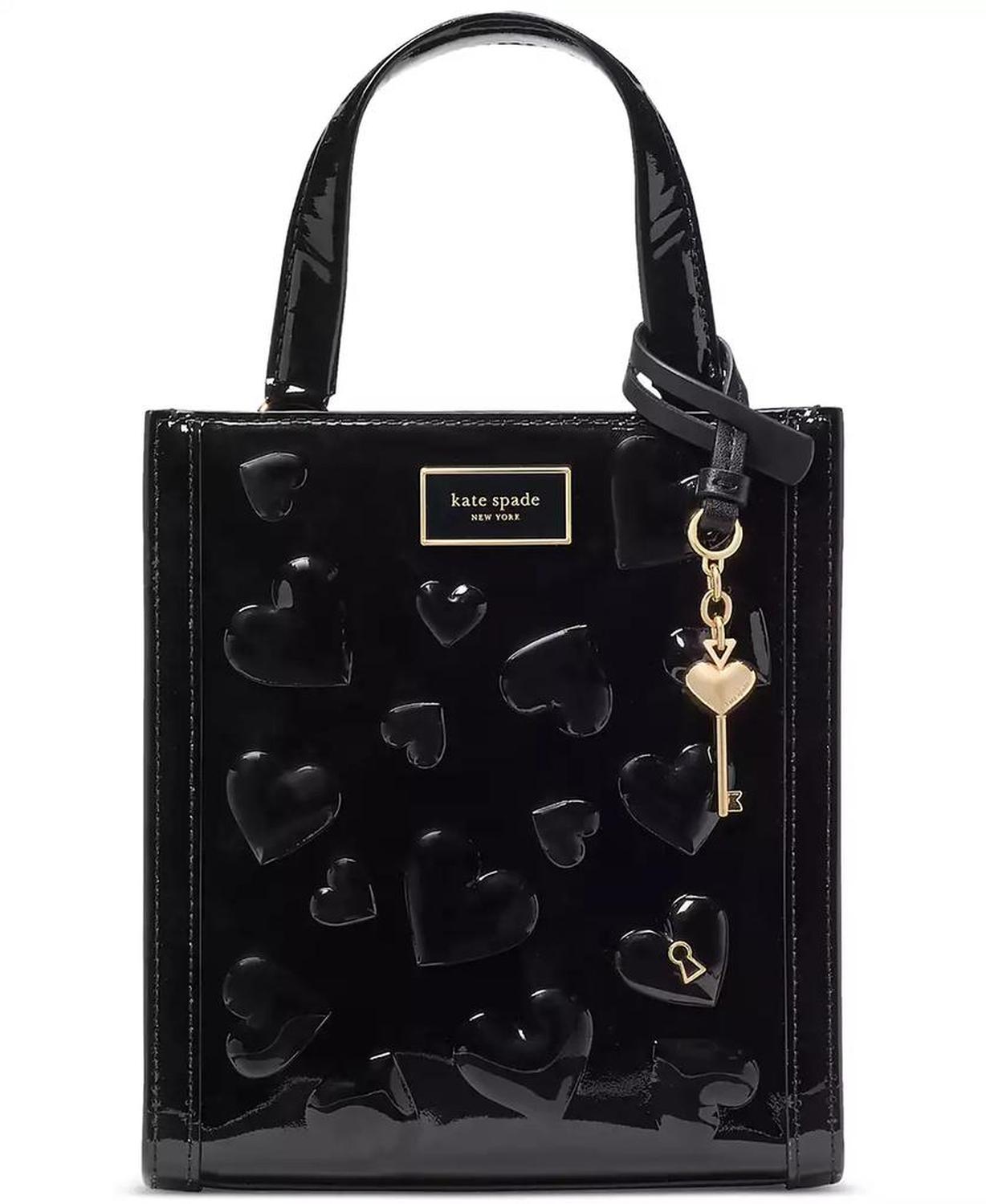 Luminous patent leather and signature accents come together to steal your heart with this tote by kate spade new york. Mini-sized bag; 7-2/5"W x 6-1/5"H x 3"D (width is measured across the bottom of handbag); 1 lbs. approx. weight Silhouette is based off 5'9" model 3-1/2"L handles; adjustable, removable strap Dog-clip closure Gold-tone hardware, logo plaque & key charm Leather Spot clean Imported