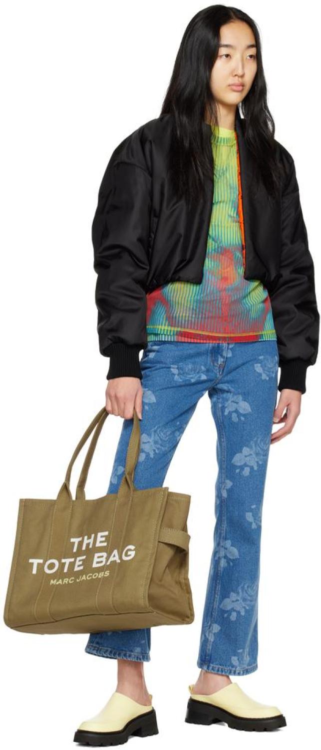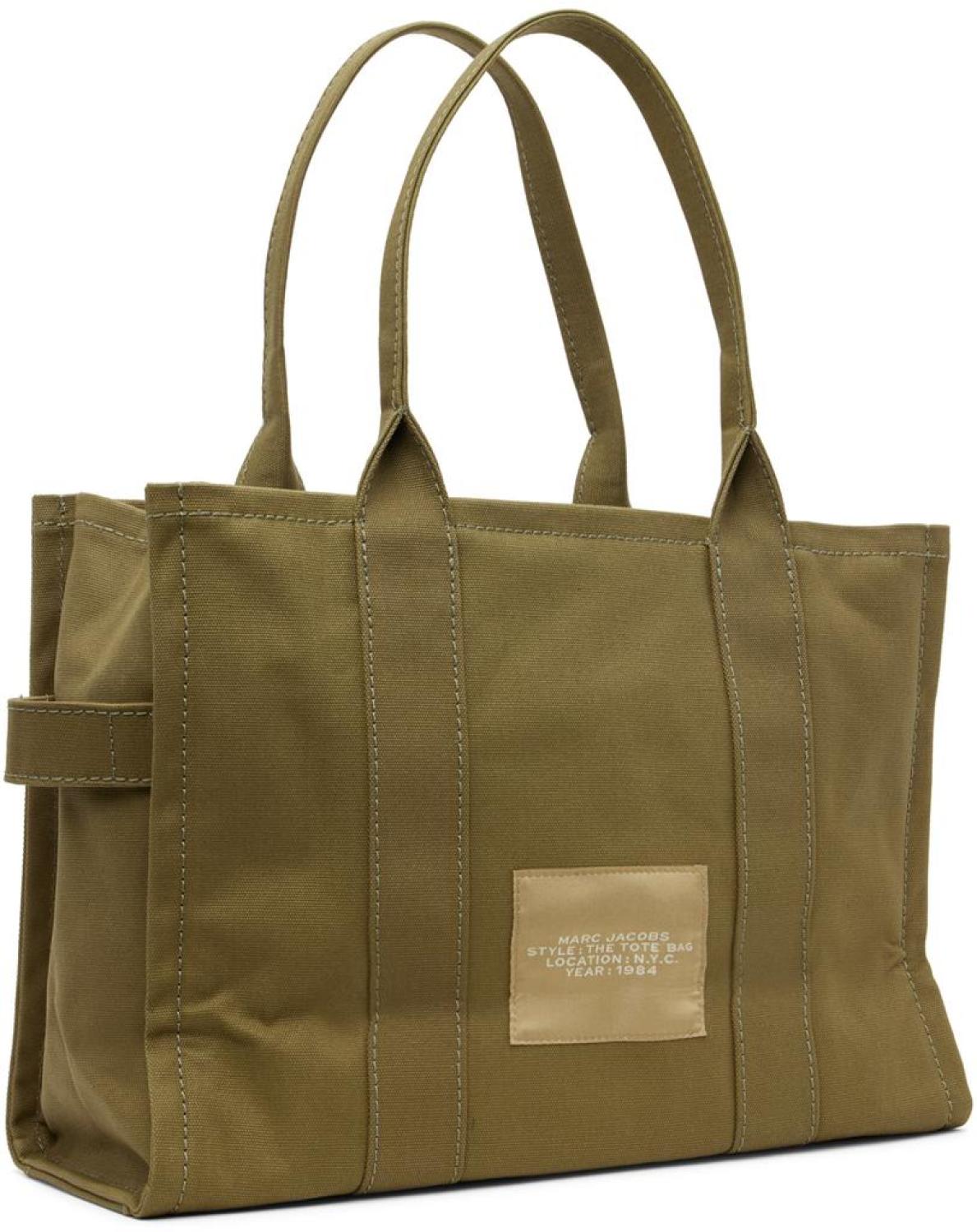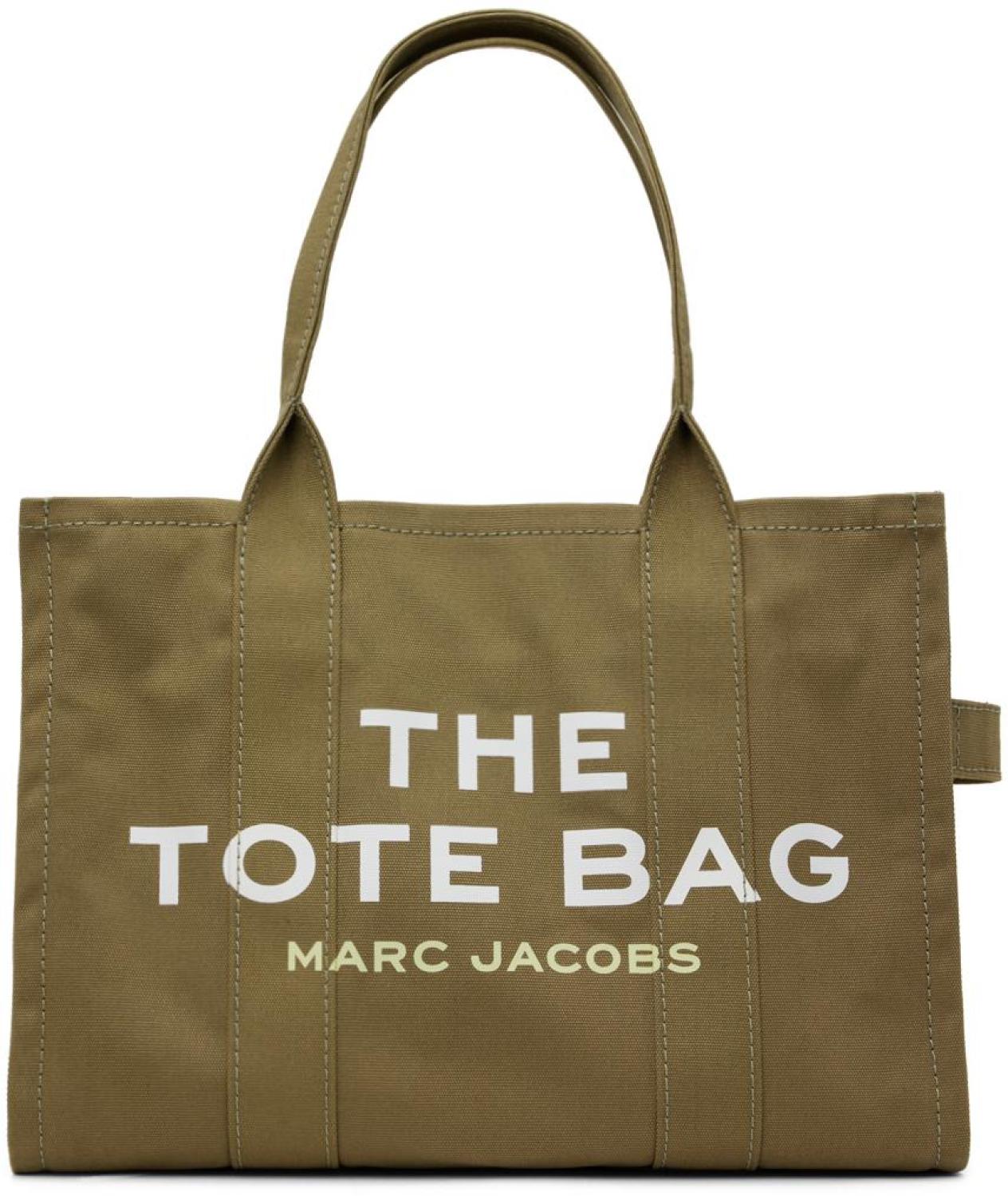 Marc Jacobs Khaki 'The Large Tote Bag' Tote Cotton canvas tote in khaki. · Twin rolled carry handles · Text and logo printed at face · Textile logo patch at back face · Carry handle at side · Zip closure · Zip pocket and patch pockets at interior · Unlined · H13 x W17 x D6 in Supplier color: Slate green Textile. Made in Viet Nam. 231190F049006