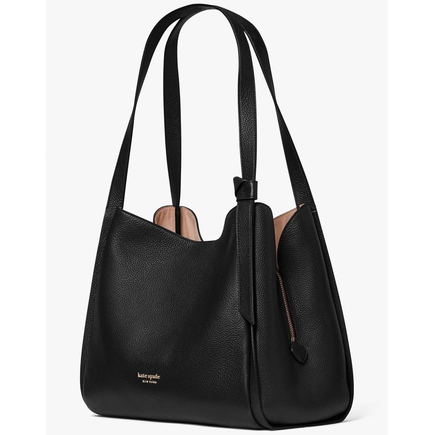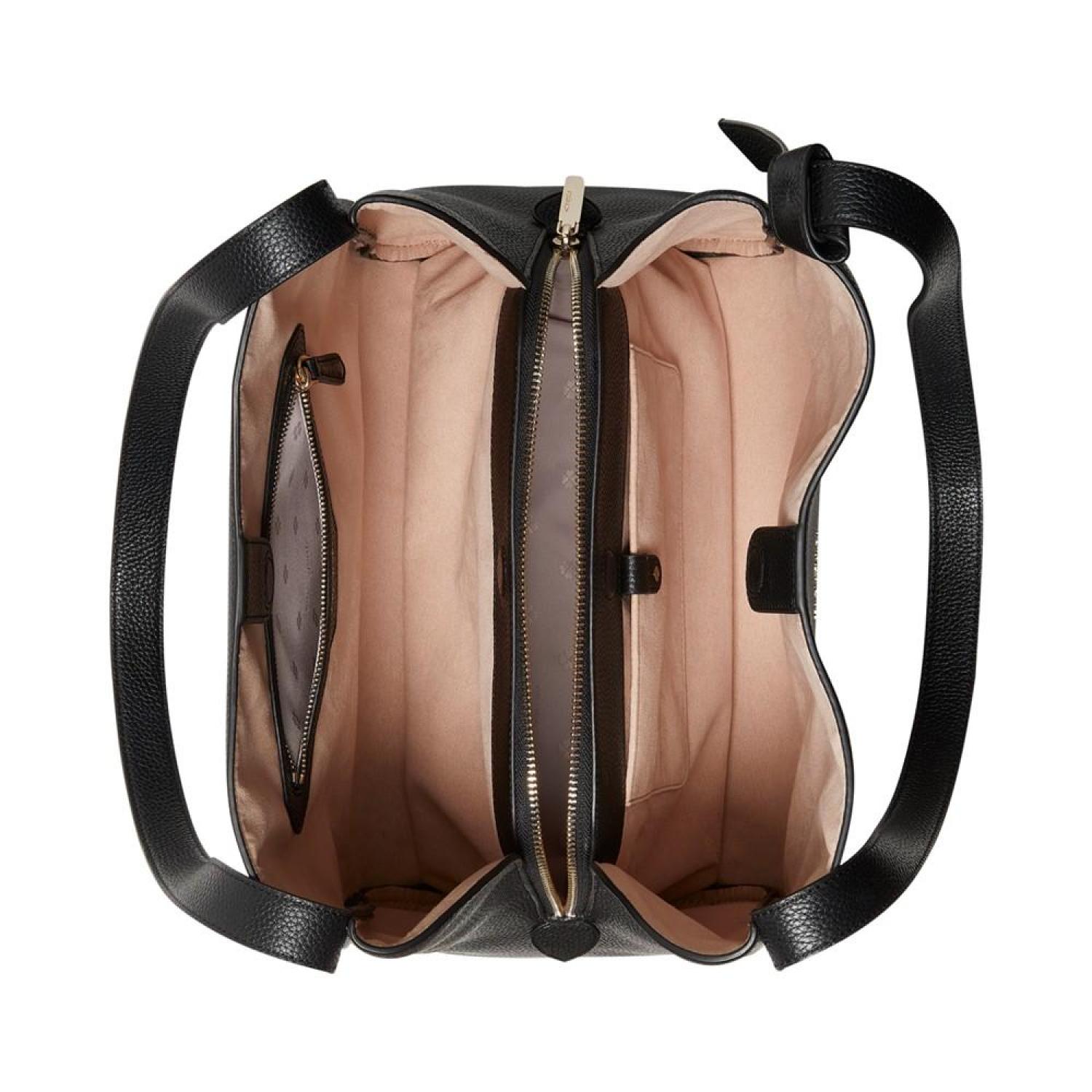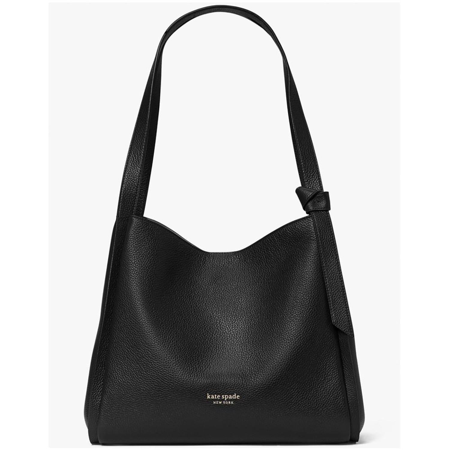 A softly structured silhouette is endlessly versatile with Kate Spade New York's luxe pebbled leather shoulder bag featuring a triple-compartment interior. Large sized bag; 12-1/2"W x 11"H x 7-1/2"D (width is measured across the bottom of handbag) Silhouette is based off 5'9" model 12"L handles Magnetic closures Gold-tone exterior hardware & logo 1 interior zip pocket, 1 snap pocket & 1 center zip compartment Fits iPhone Max, iPad, A4 binder or smaller; Laptop compatible (std. size 13") Pebbled leather Wipe clean Imported