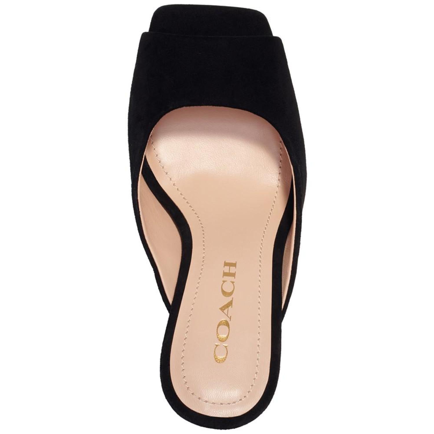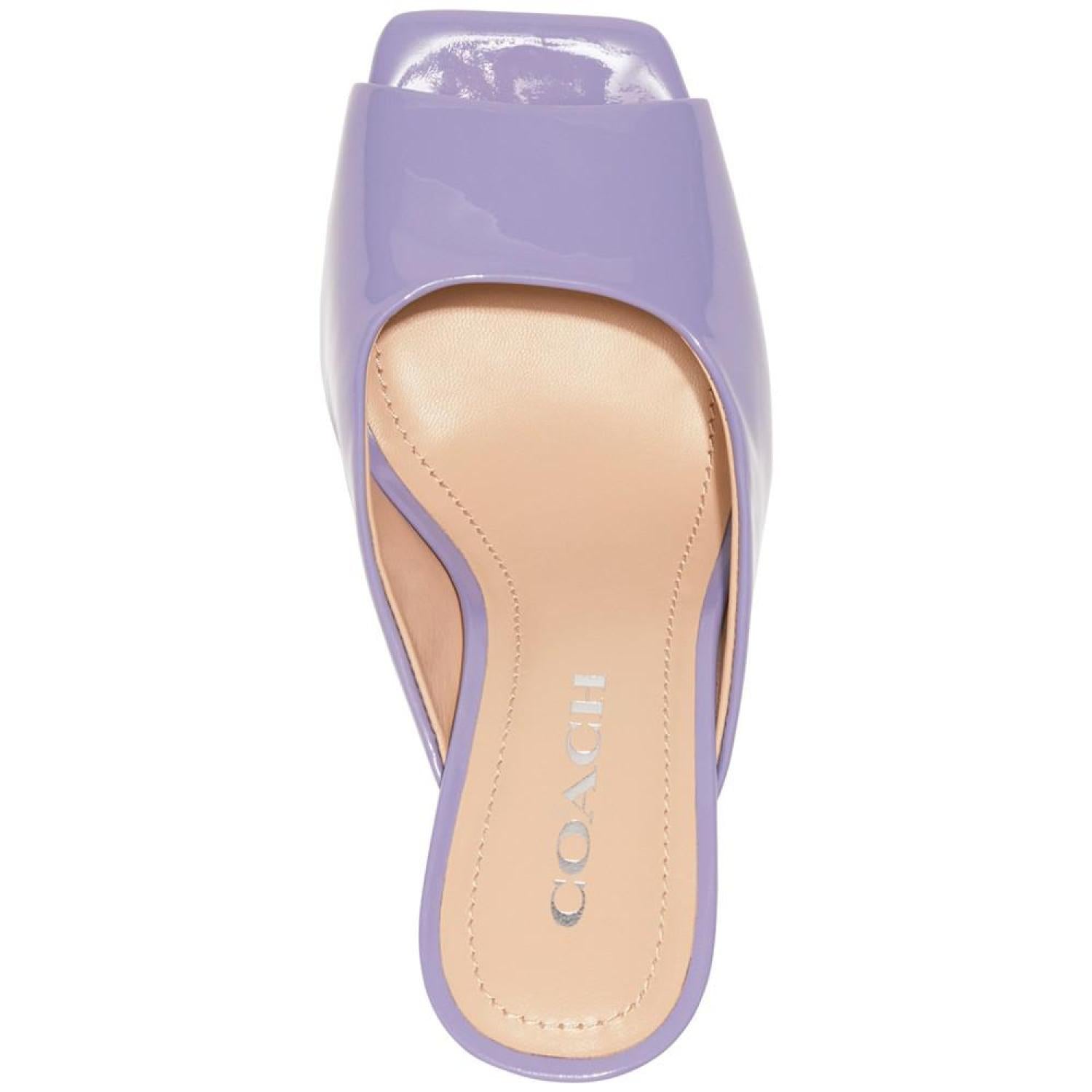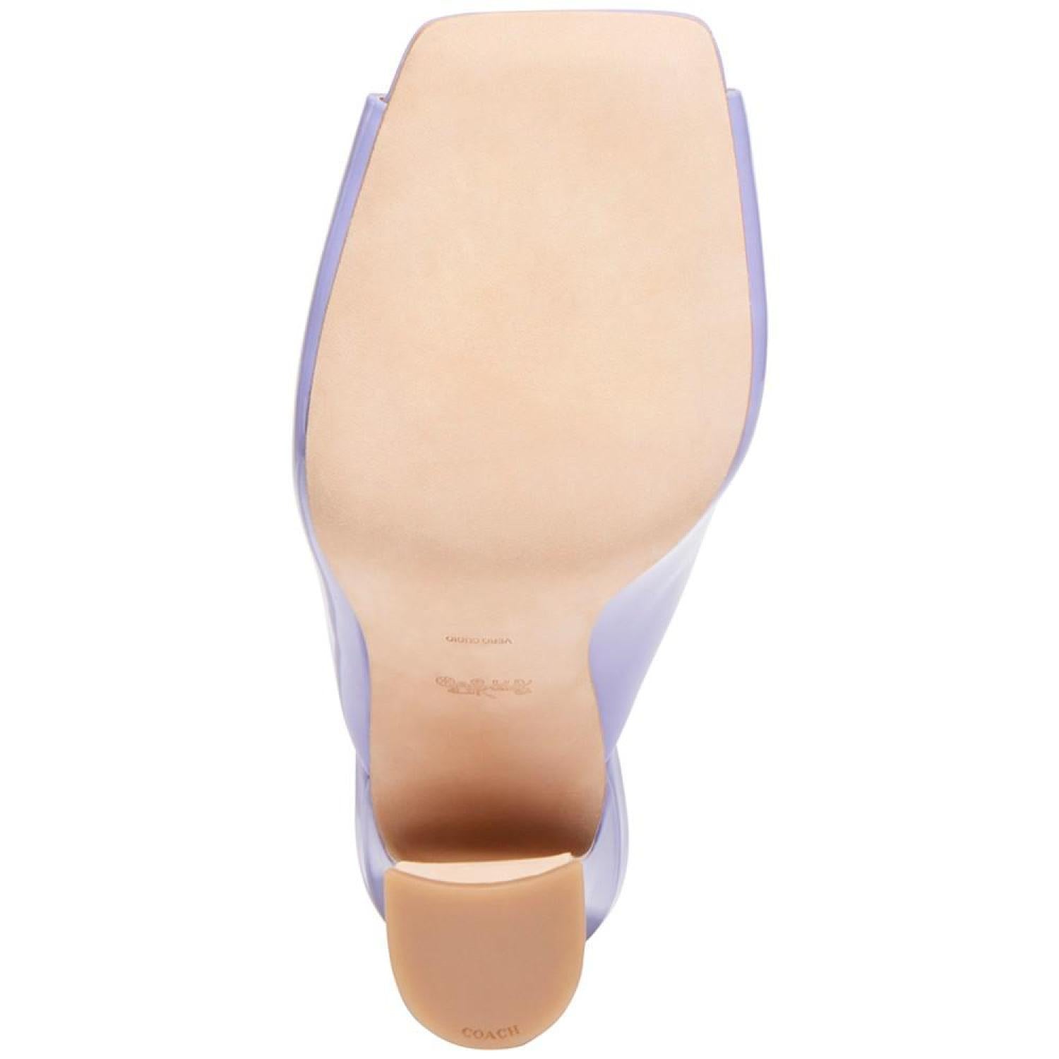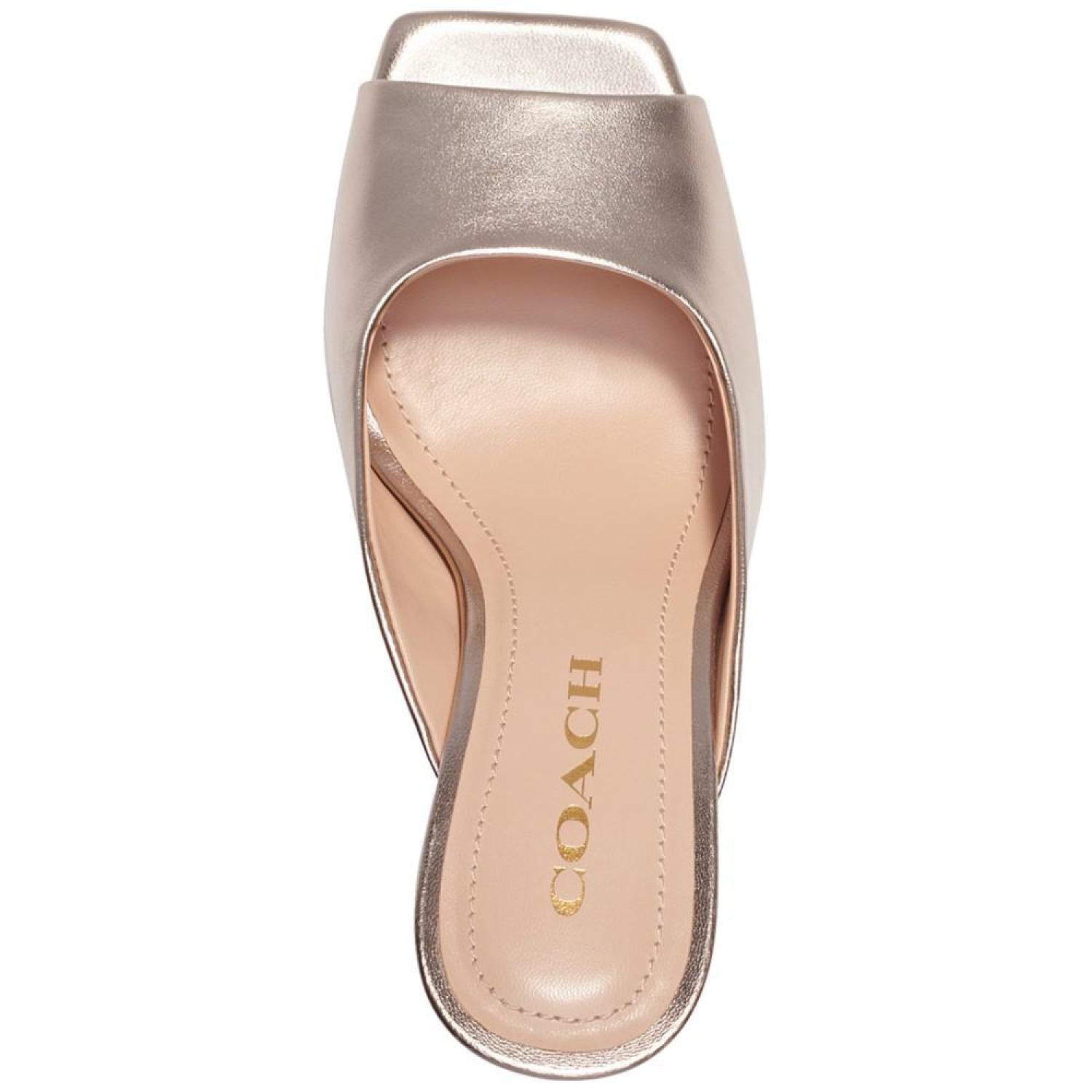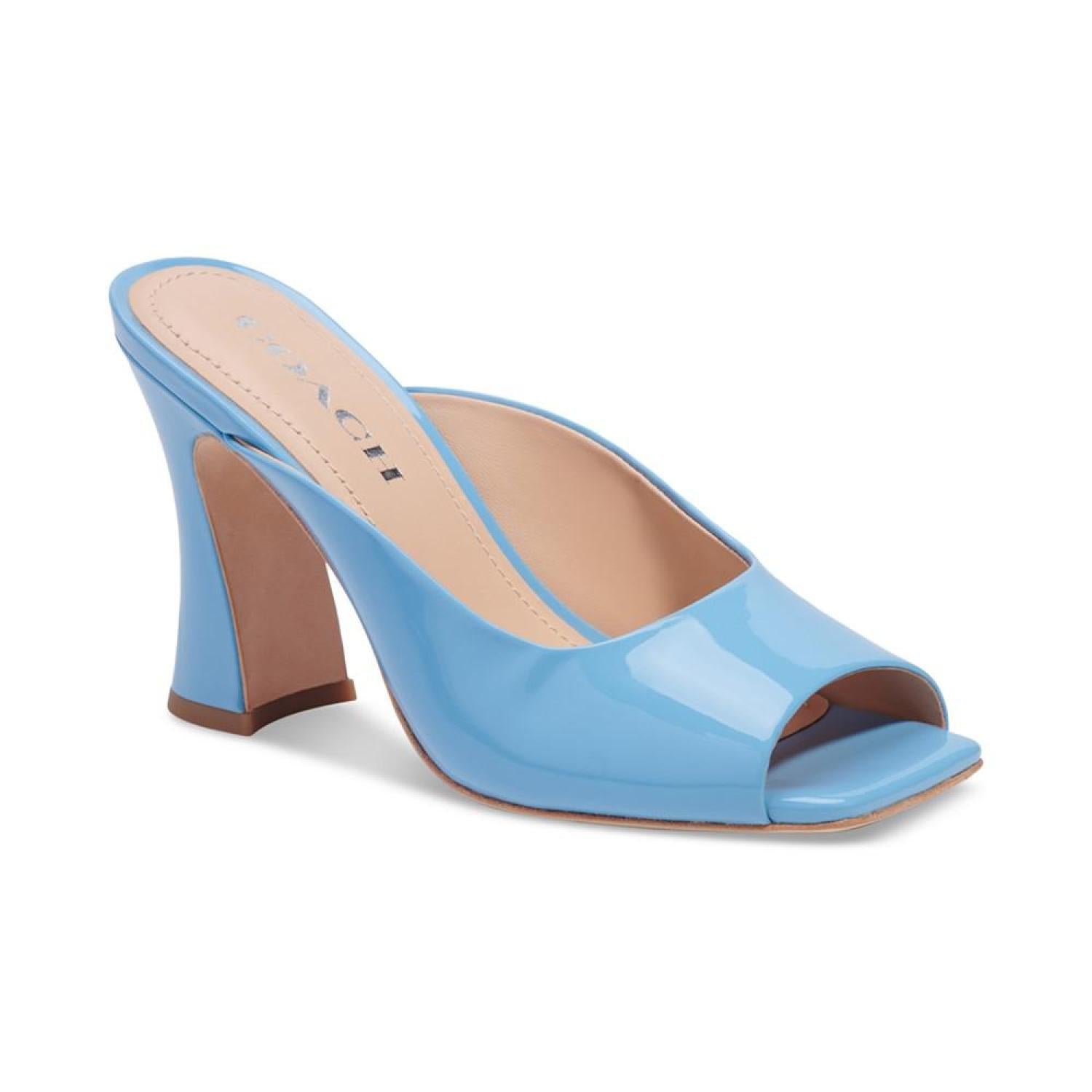 Square toes and sculpted heels update a sophisticated slide silhouette in the elegant curves of the Laurence sandals by COACH. 3-1/2" sculpted architectural heel; 1/4" platform Style No. CI230: Patent leather Style No. CI228: Suede Style No. CJ265: Metallic leather Leather sole Imported