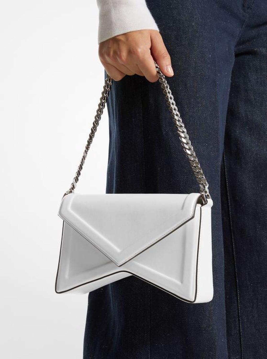 “When I think about a bag that symbolizes New York City, it's always going to be a bag that you can put with anything in your closet and rush out the door," says Michael Kors. The shapely Manhatta is crafted from premium calf leather with smooth painted trim that speaks to its fine Italian craftsmanship. Finished with a chain-trim strap for tough-luxe appeal, it will add a sense of refined edge to sharp tailoring, fluid gowns and casual separates. • Shoulder bag • Leather • 100% leather • Silver-tone hardware • 8.6"W X 6.2"H X 2.3"D • Handle drop: 5.5” • Interior details: slip pocket • Lining: 100% suede • Snap fastening • Made in Italy • Shoulder bag • Leather • 100% leather • Silver-tone hardware • 8.6"W X 6.2"H X 2.3"D • Handle drop: 5.5” • Interior details: slip pocket • Lining: 100% suede • Snap fastening • Made in Italy