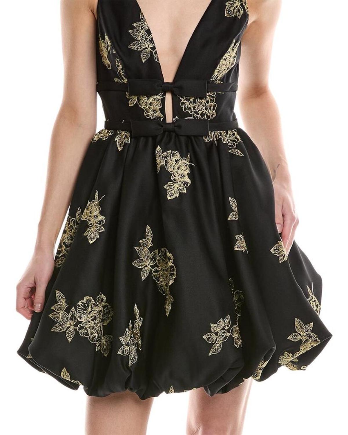 Elevate your evening look with the Marchesa Notte Mini Cocktail Dress. This stunning dress features a black and gold heavy duchess satin design, a plunging neckline, an open back, side seam pockets, and a bubble hem for a touch of flair. Measuring approximately 36 inches from shoulder to hem, this dress is perfect for those special occasions where you want to make a statement. The side seam zipper ensures a secure fit, while the 80% polyester and 20% metallic fabric blend adds a touch of luxury.Whether you're attending a cocktail party or a fancy dinner, this Mini Cocktail Dress from Marchesa Notte is sure to turn heads. Dry clean only. Imported.