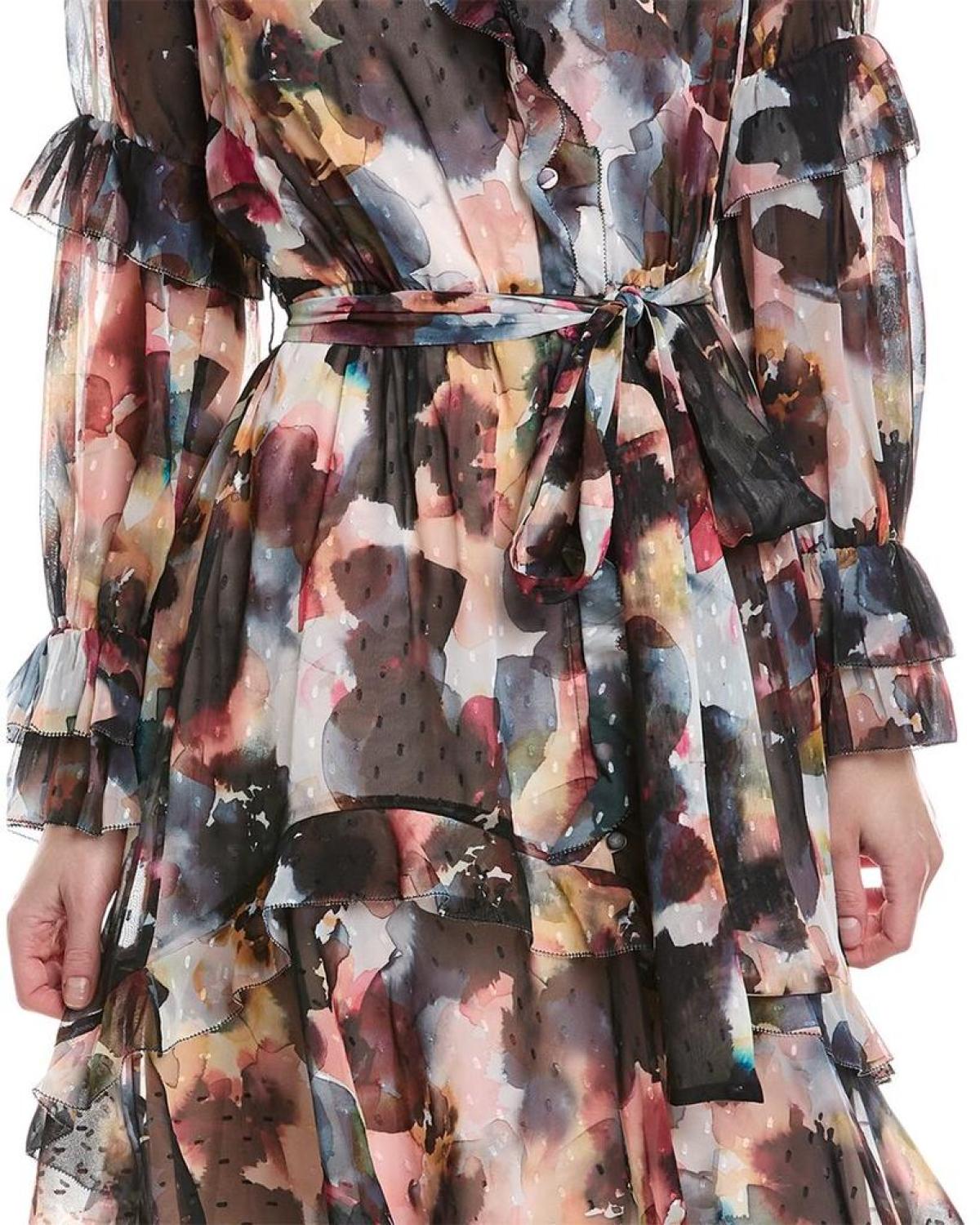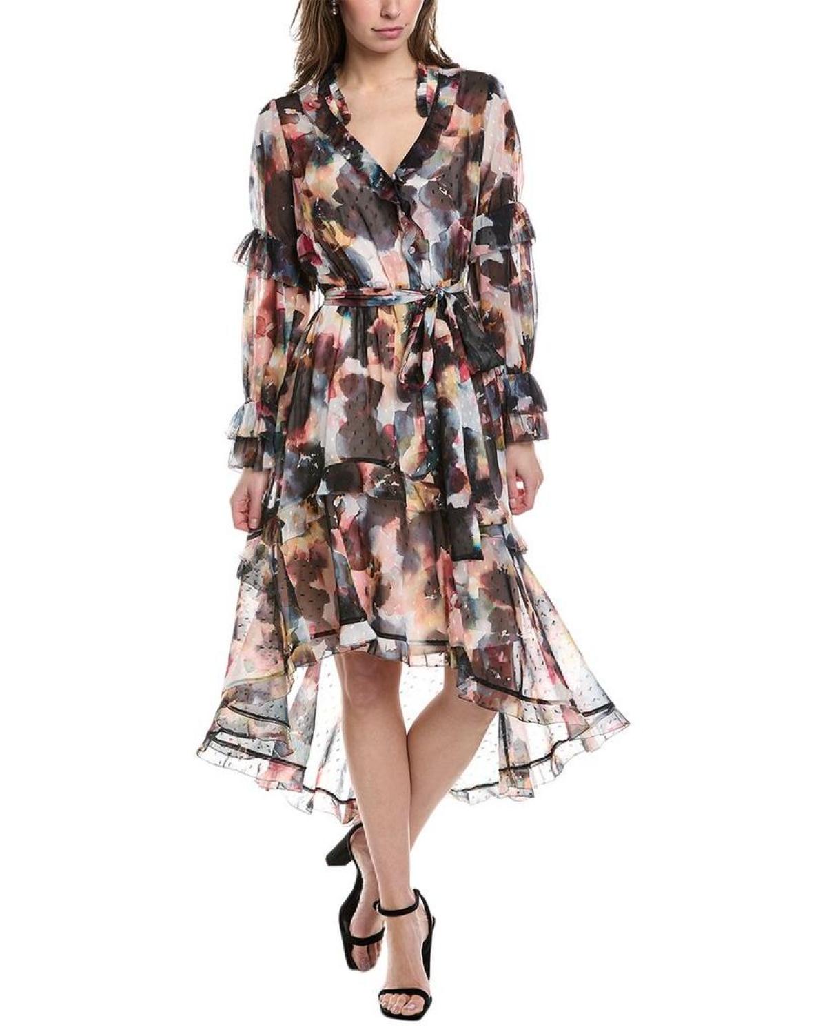 Elevate your evening look with the Marchesa Notte Oleander Maxi Dress. This stunning gown features a billowy long sleeve and high-low asymmetrical ruffled hem, making it the perfect choice for a special night out. The ink multicolor design adds a touch of elegance, while the button front detailing adds a modern twist. Made from 100% polyester, this dress is both luxurious and comfortable. Whether you're attending a formal event or a cocktail party, this dress is sure to turn heads. Add this statement piece to your wardrobe for a truly unforgettable ensemble.