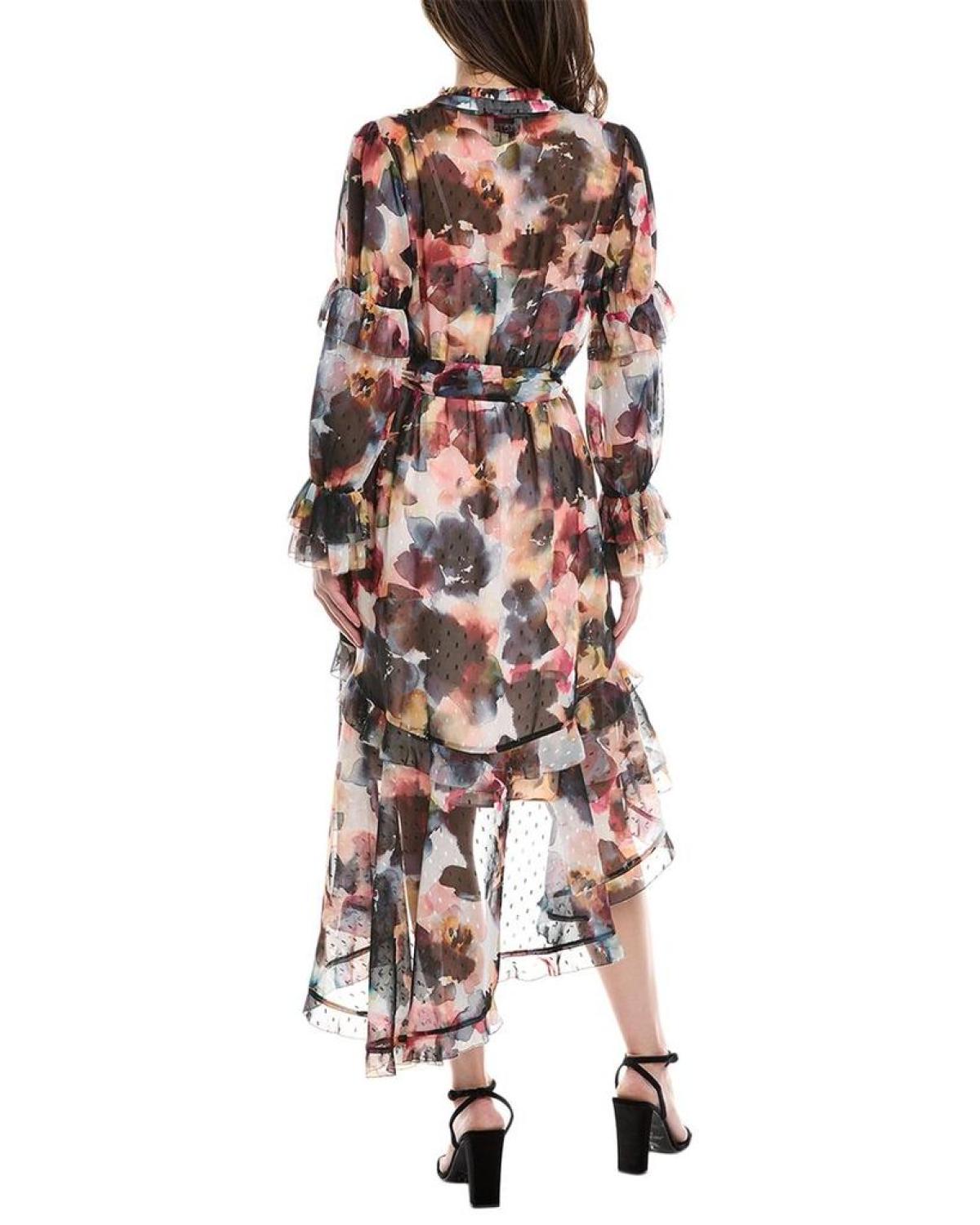 • Elevate your evening look with the Marchesa Notte Oleander Maxi Dress. This stunning gown features a billowy long sleeve and high-low asymmetrical ruffled hem, making it the perfect choice for a special night out. The ink multicolor design adds a touch of elegance, while the button front detailing adds a modern twist. Made from 100% polyester, this dress is both luxurious and comfortable. Whether you're attending a formal event or a cocktail party, this dress is sure to turn heads. Add this statement piece to your wardrobe for a truly unforgettable ensemble.