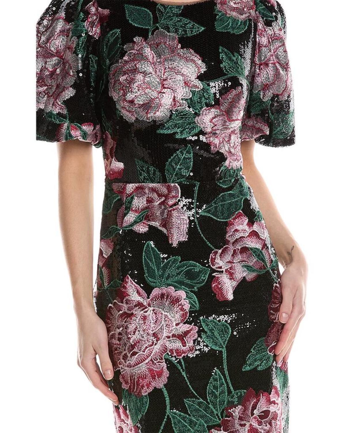 Elevate your evening look with the stunning Marchesa Notte Sequined Midi Dress. This exquisite black dress features a shiny Degournay garland sequin fabrication that catches the light beautifully. The open back, bubble sleeves, and center back slit at the hem add a touch of glamour to this elegant piece. Measuring approximately 55 inches from shoulder to hem, this dress is perfect for a special night out. The center back zipper with hook-and-eye closure ensures a secure fit. Crafted from 100% polyester, this dress should be dry cleaned only to maintain its quality. Marchesa Notte is known for their luxurious gowns and cocktail dresses, making this Sequined Midi Dress a must-have for your wardrobe. Make a statement in this dazzling piece and turn heads wherever you go. Order now to guarantee delivery in time for Mother's Day.