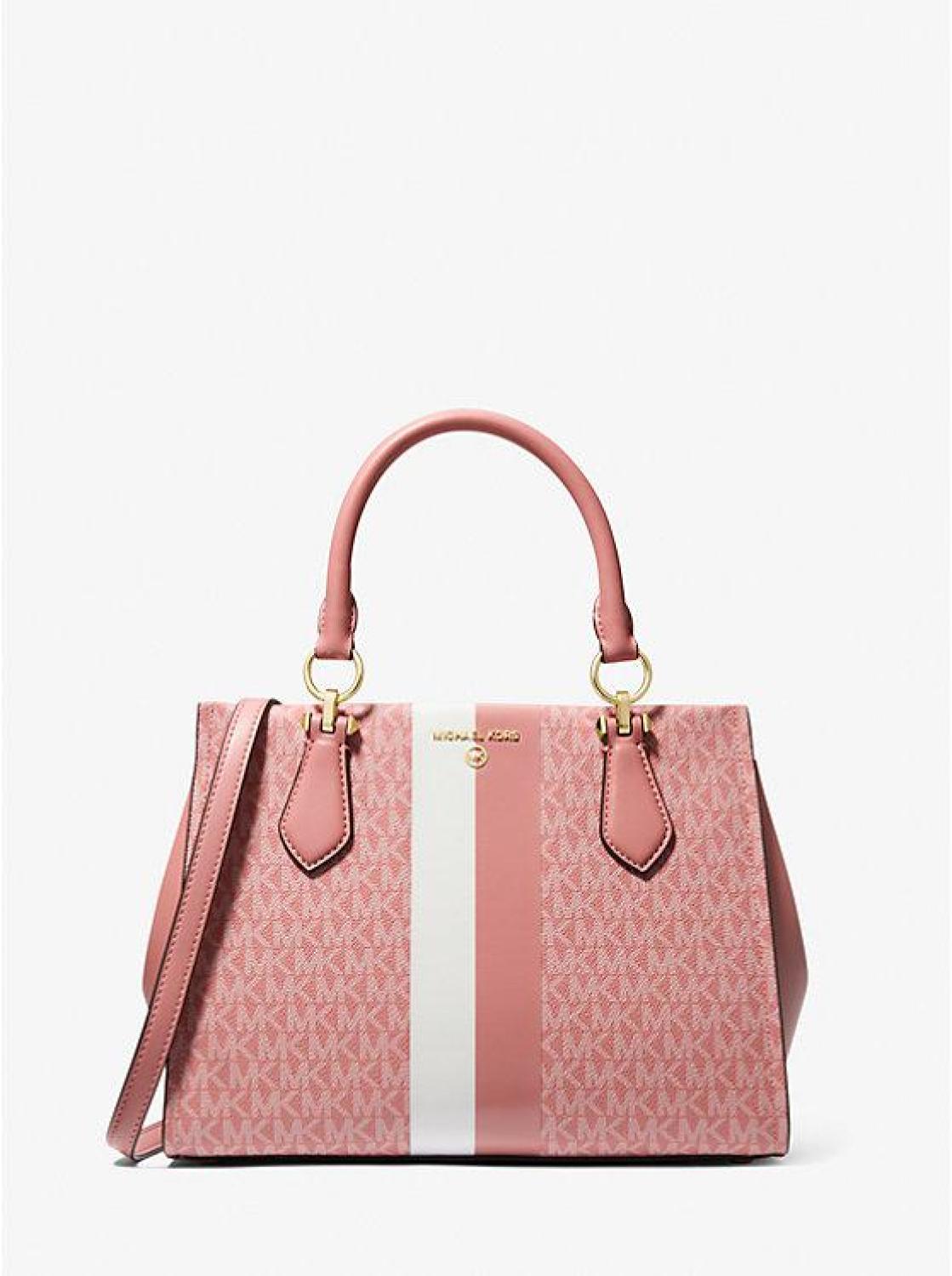 A compact companion with enough room for everything, our striped Marilyn satchel is the epitome of polished ease. It features the brand’s initials and opens to a lined interior with dedicated pockets for your phone, wallet and other small items. Attach the smooth leather strap to wear it crossbody. • Satchel • Logo-print canvas • 89.4% coated canvas/9.6% polyester/1% polyurethane • Gold-tone hardware • 11.25”W X 8.25”H X 5.5”D • Handle drop: 4.5” • Exterior details: back and front slip pockets • Interior details: back zip pocket, 2 front slip pockets • Lining: 100% polyester • Zip fastening • Imported • Satchel • Logo-print canvas • 89.4% coated canvas/9.6% polyester/1% polyurethane • Gold-tone hardware • 11.25”W X 8.25”H X 5.5”D • Handle drop: 4.5” • Exterior details: back and front slip pockets • Interior details: back zip pocket, 2 front slip pockets • Lining: 100% polyester • Zip fastening • Imported