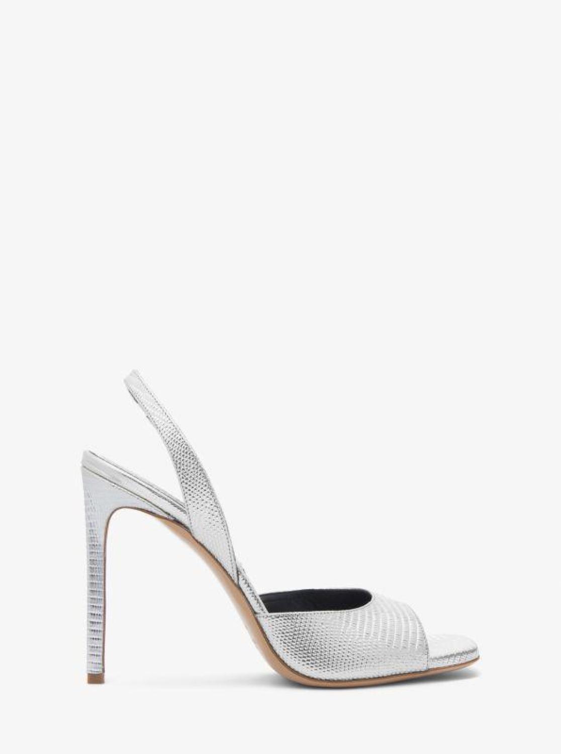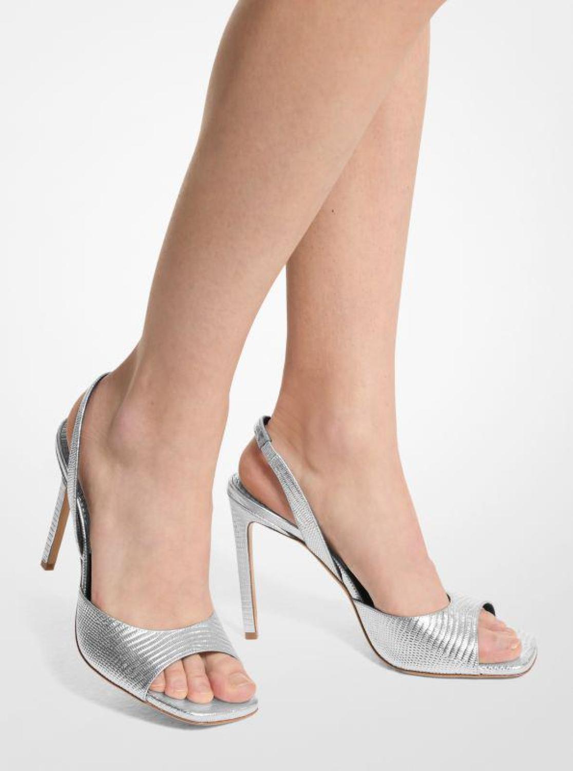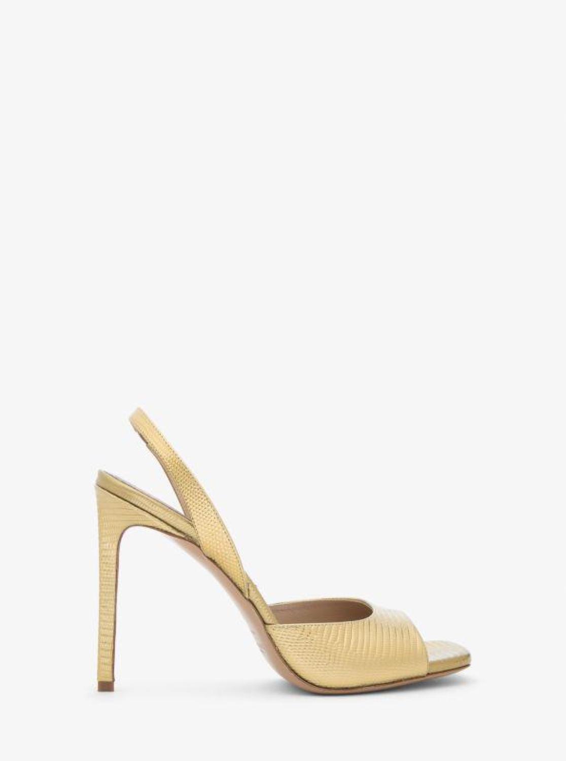 • The Marisa sandal is a feminine silhouette faceted with slim straps for an effortlessly chic finish. Crafted from lizard-embossed leather, this metallic slingback offers an understated yet sophisticated accent to every ensemble. For a vintage-inspired look, style them with a mid-length skirt for easy elegance. Made in Italy.