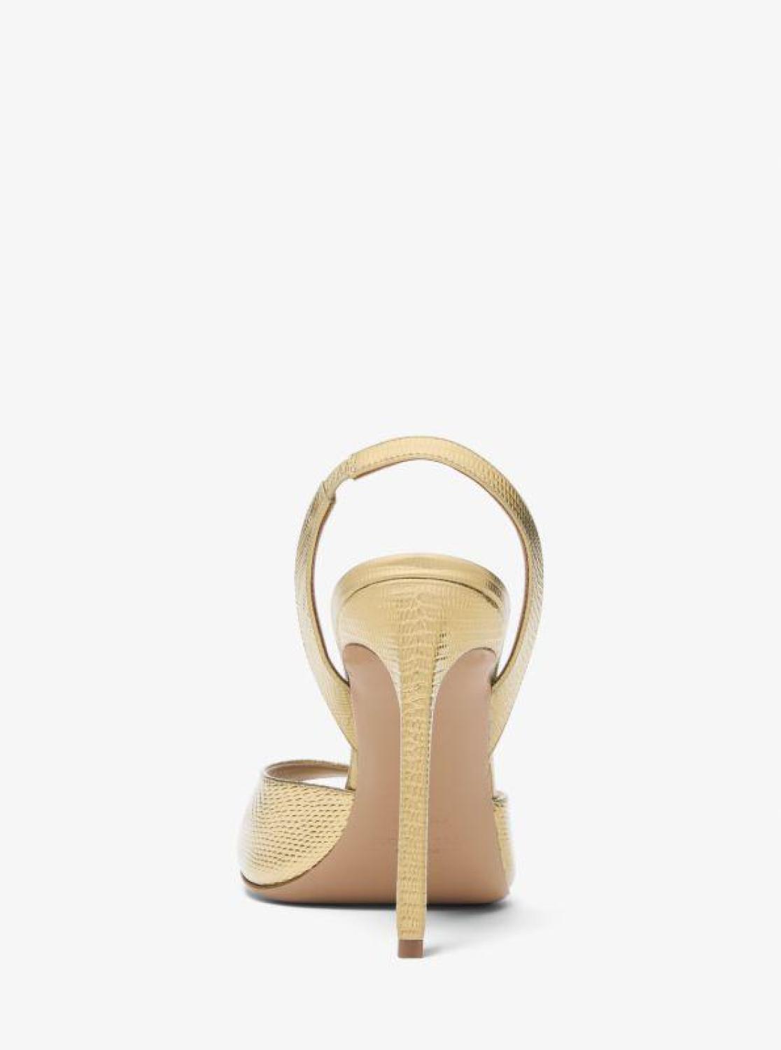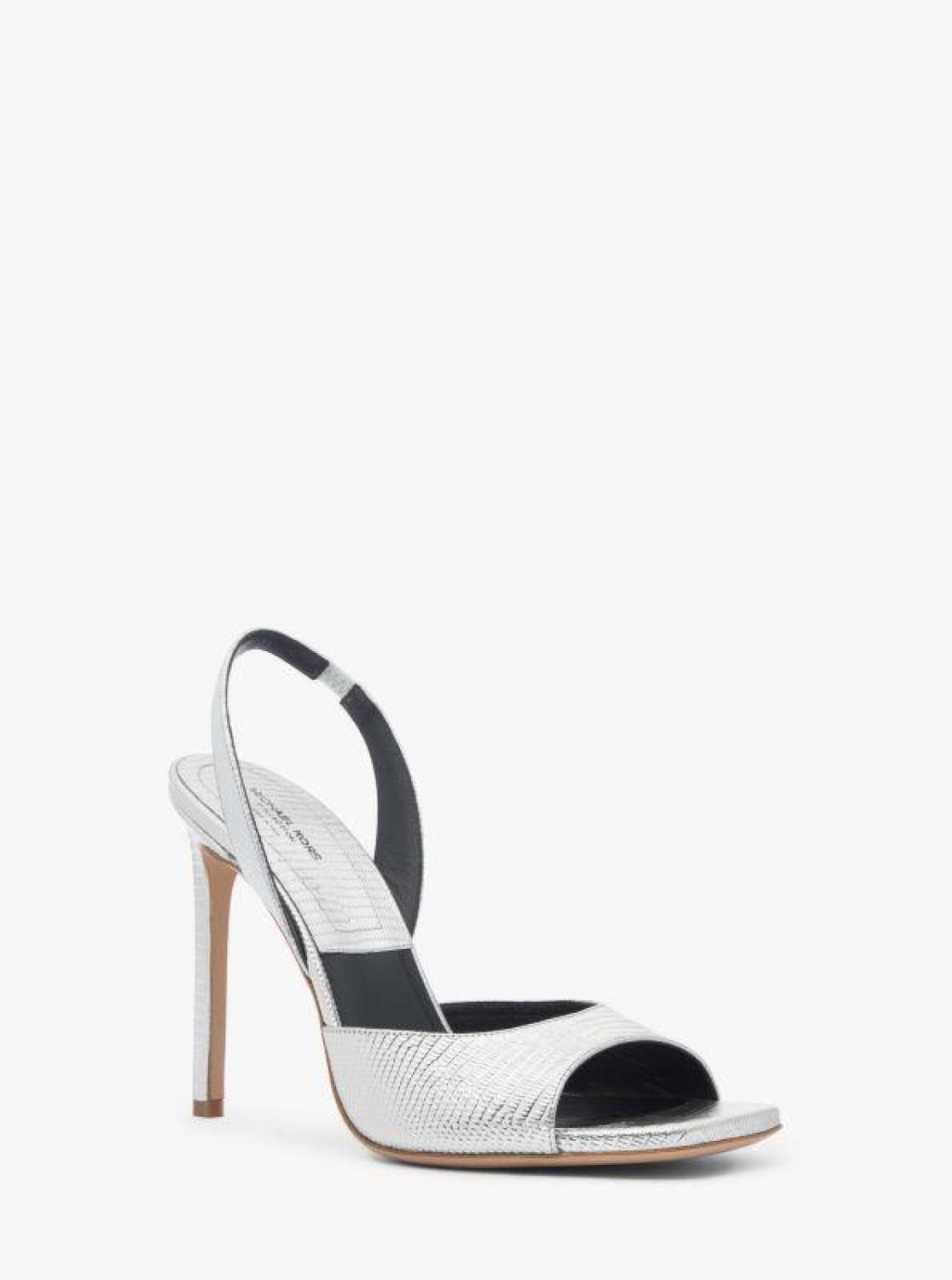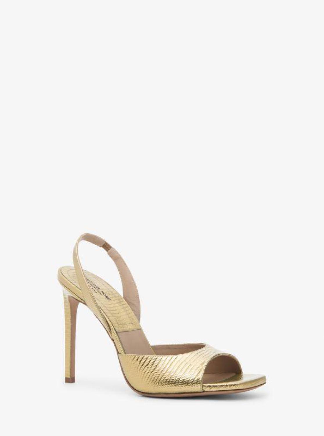 • The Marisa sandal is a feminine silhouette faceted with slim straps for an effortlessly chic finish. Crafted from lizard-embossed leather, this metallic slingback offers an understated yet sophisticated accent to every ensemble. For a vintage-inspired look, style them with a mid-length skirt for easy elegance. Made in Italy.