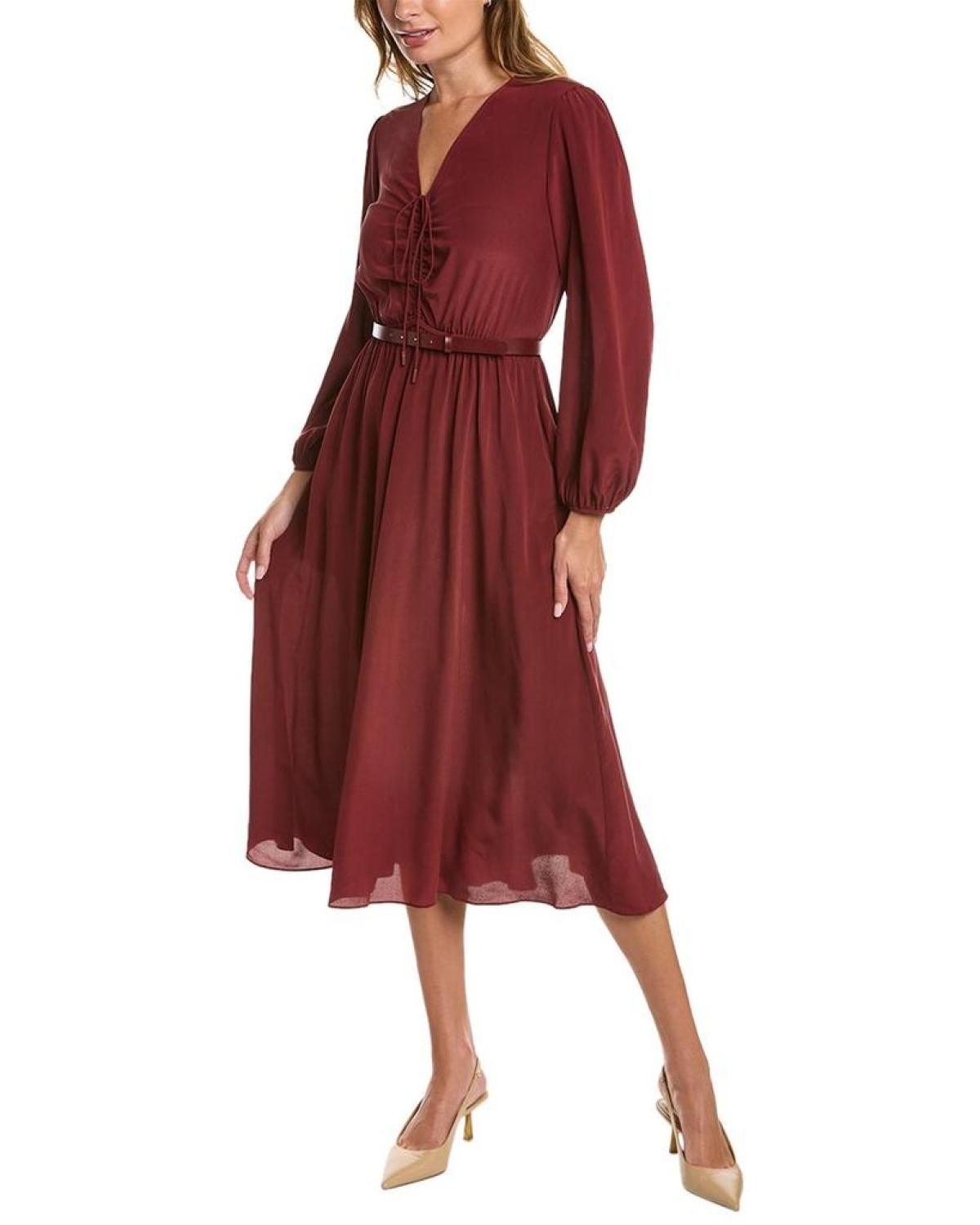 Introducing the Max Mara Studio Campo Silk Midi Dress; a stunning addition to any wardrobe. Crafted from 100% silk, this dress exudes luxurious sophistication. With its elegant burgundy color, the dress is perfect for making a stylish statement. The V-neck design adds a touch of femininity, while the ruched drawstring accent adds a modern twist. The elastic waist, accompanied by a removable belt, ensures a flattering fit for all body types. The dress features convenient dual side seam pockets, perfect for keeping your essentials close at hand. The gathered cuffs add a subtle detail, creating a refined and polished look. With a length of approximately 51 inches from shoulder to hem, this midi dress is designed to flatter and elongate the silhouette. Slip-on styling makes this dress effortless to wear, and the model is 5'11' and wearing a size 4. Please note, measurements may slightly vary by size. To keep this exquisite garment in top condition, hand wash is recommended. Imported from the renowned brand, Max Mara, this dress embodies the label's commitment to quality and impeccable style. Upgrade your wardrobe with the Max Mara Studio Campo Silk Midi Dress and experience timeless elegance like never before.