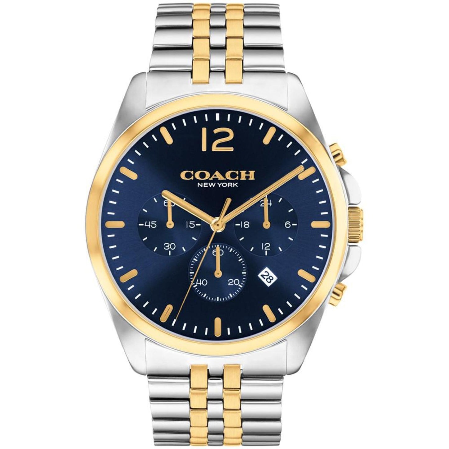 • The epitome of refined sophistication, Greyson is a polished, go-everywhere timepiece. This two-tone stainless steel and gold-tone chronograph features a blue sunray dial with a date window and three subdials marking seconds, minutes and hours. Style #14602659.