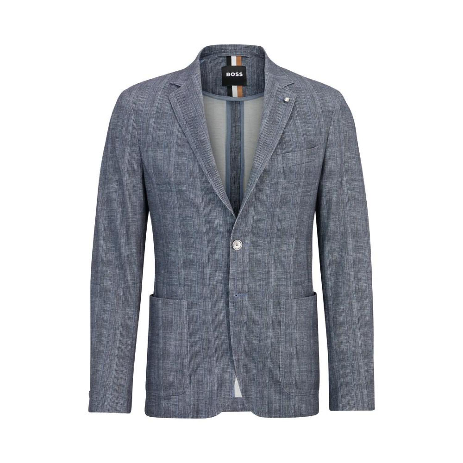 A slim-fitting jacket in checked stretch cotton with a signature-stripe lapel pin by BOSS Menswear.