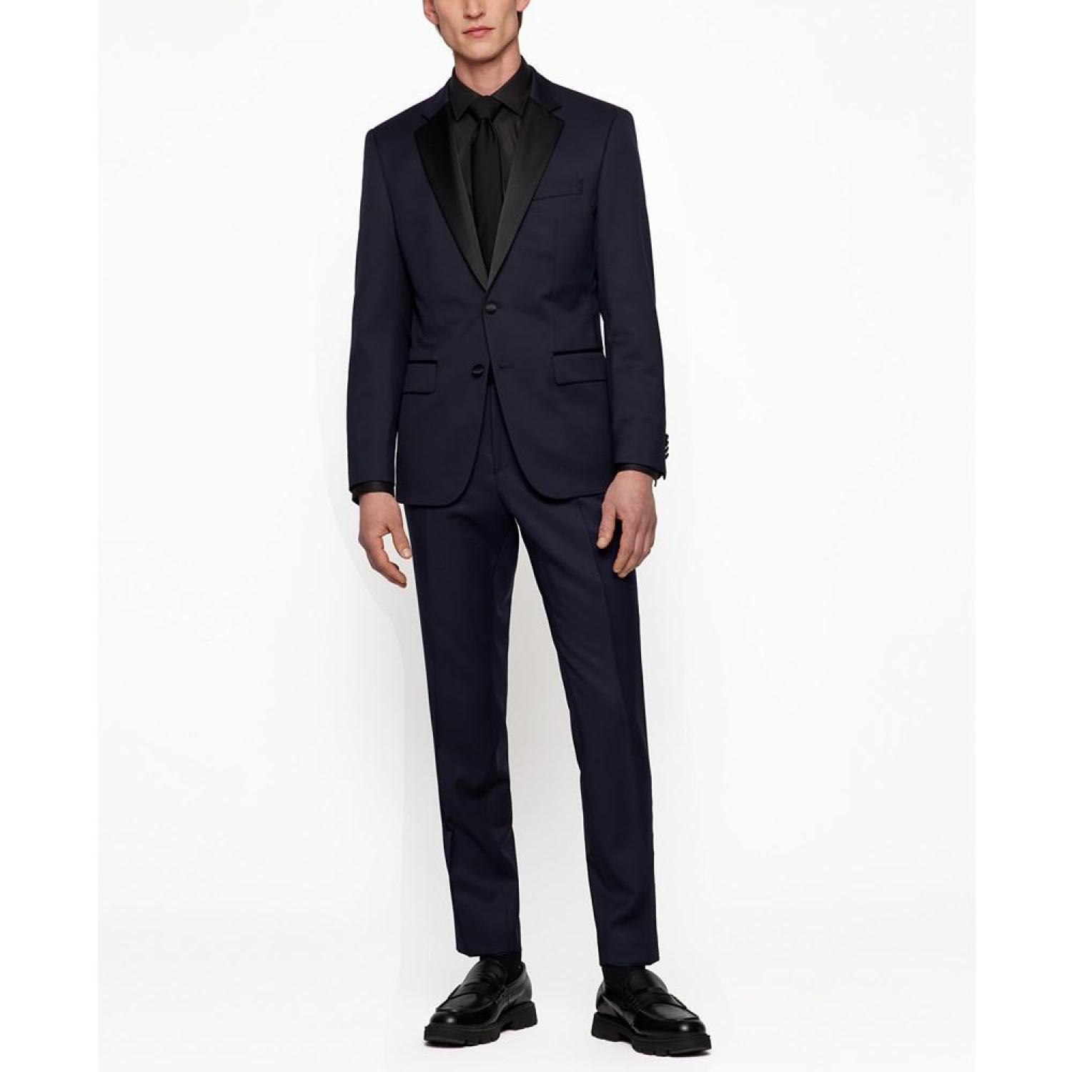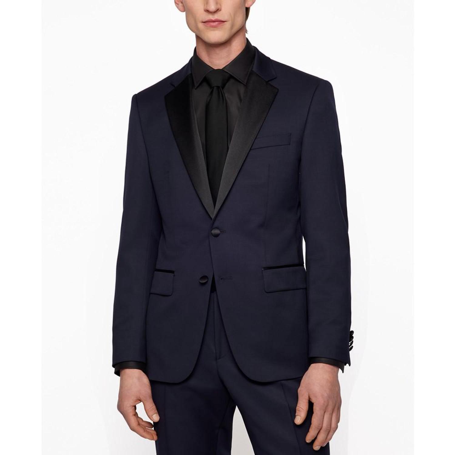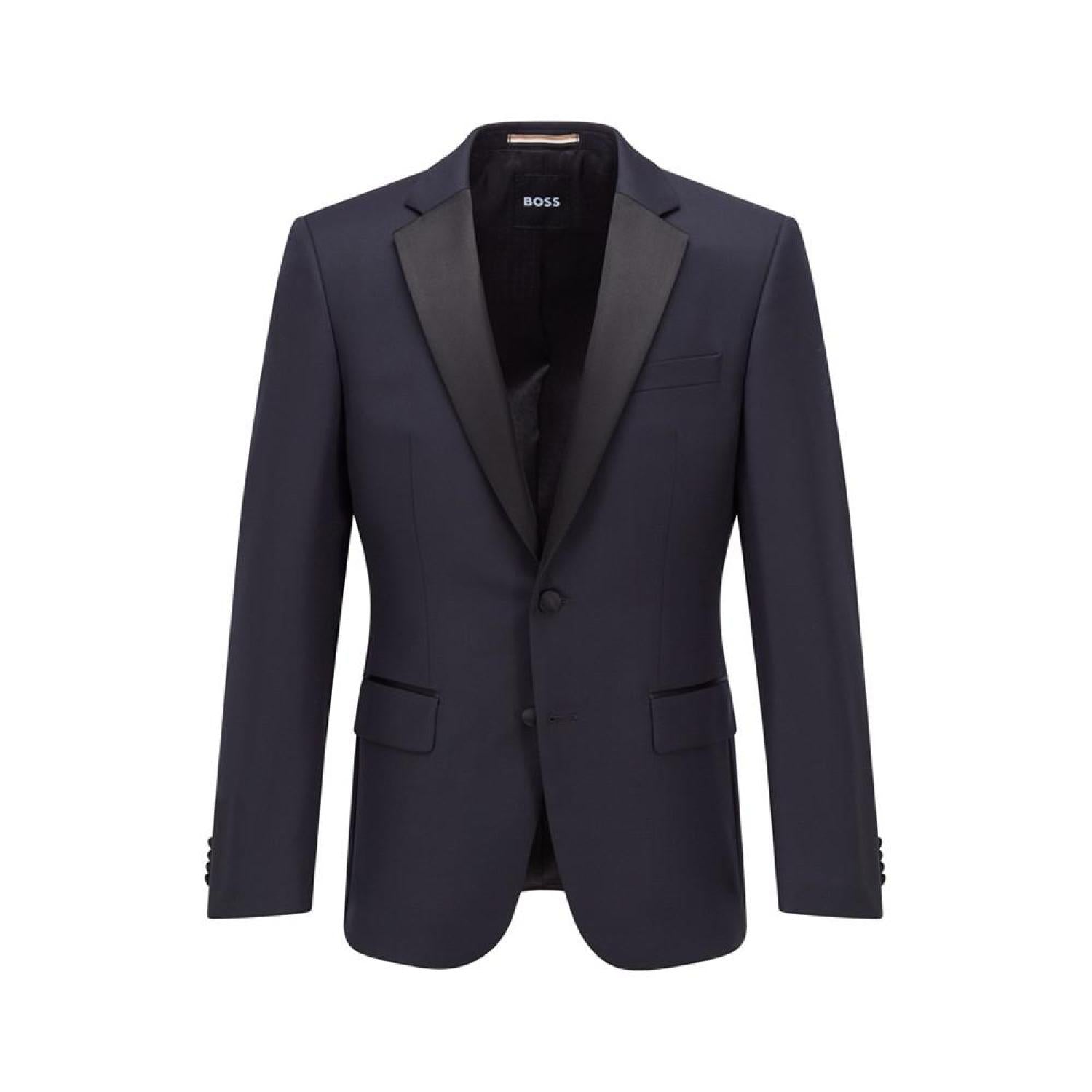 A slim-fit tuxedo jacket by BOSS Menswear. Crafted in serge-woven cloth for a refined look and feel, this jacket is trimmed with elegant silk-blend accents. Slim fit Number of buttons- 2 Welt chest pockets Pockets top- Flap pockets Inside jet pocket with button The model is a size 32R and is 6'2" tall with a 38" chest, 29" waist and 36" hips Wool Machine Washable Imported