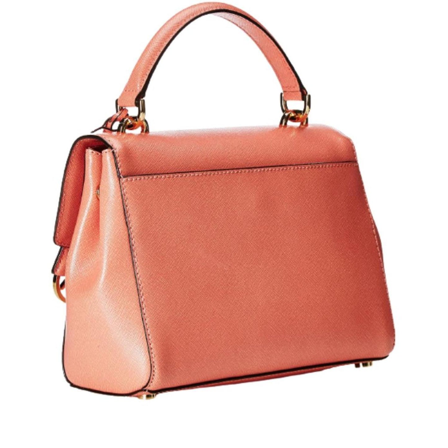 Made of Leather with top handle; Flap with Magnetic inside closure; Back open pocket with snap closure; 1 inside zip pocket 1 inside open pocket; Adjustable and detachable leather shoulder strap of 18-22 inches drop Leather handles of 4 inches drop; Gold hardware Measurements - Length - 9.75 x Height - 7 x Width - 4 Inches Comes with original tags