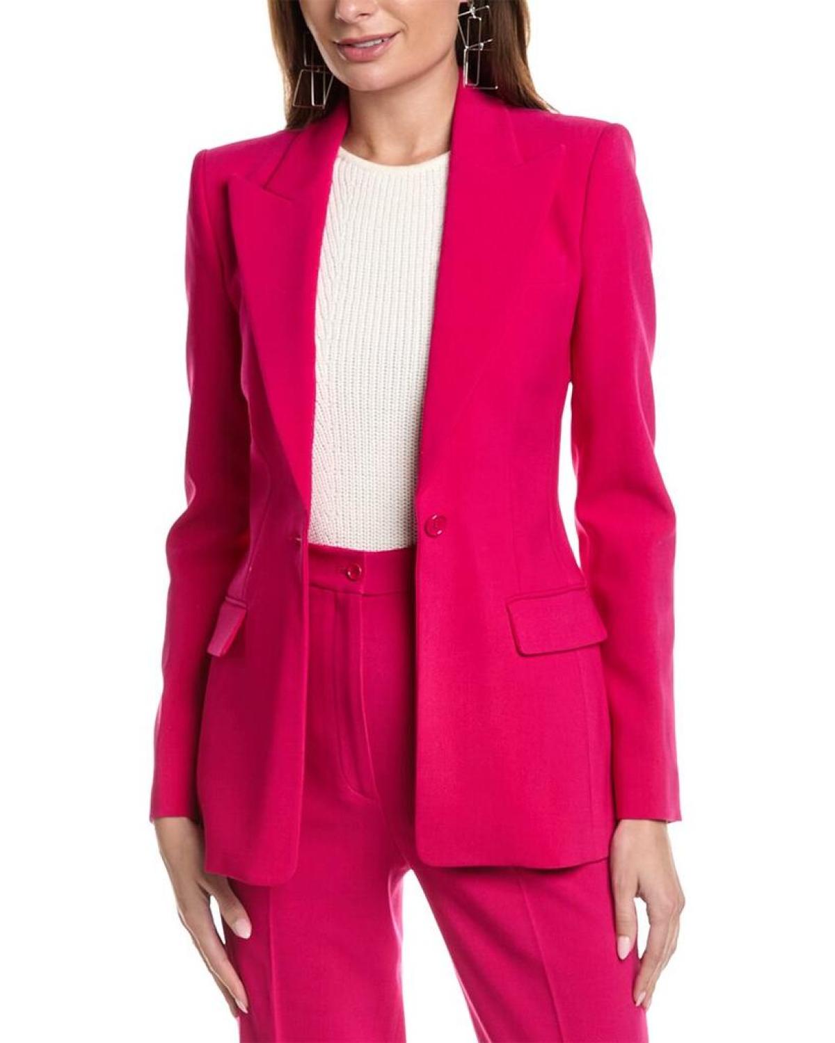 Introducing the Michael Kors Collection Georgina One Button Wool-Blend Blazer, a stunning addition to your wardrobe that exudes effortless style and luxurious comfort. Crafted with meticulous attention to detail, this blazer embodies the timeless elegance synonymous with the Michael Kors Collection brand. Impeccably tailored in Italy, it showcases the brand's commitment to exceptional quality and craftsmanship.The Georgina blazer features a vibrant fuchsia color, adding a bold and eye-catching element to any outfit. Its one-button design exudes femininity and sophistication, making it a versatile piece perfect for both professional settings and special occasions.Made from a premium blend of 90% virgin wool, 8% polyamide, and 2% elastane, this blazer offers supreme comfort and a flattering fit. The high-quality materials ensure durability, while the added elastane provides just the right amount of stretch for freedom of movement.Please note that the model is 5'10' and is wearing a size [size], but measurements may vary slightly by size. To maintain the pristine condition of this garment, we recommend dry cleaning only.Experience the allure of Michael Kors Collection and elevate your wardrobe with the Georgina One Button Wool-Blend Blazer. With its all-American style and easy glamour, this blazer embodies the essence of luxurious living. Expand your collection of timeless pieces and embrace the sophistication that comes with wearing a Michael Kors garment.