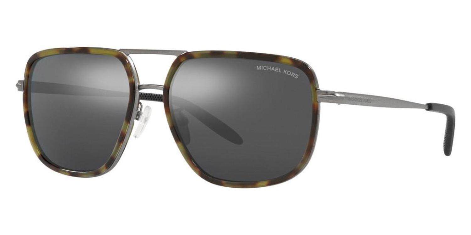 Dimensions - 59 mm x 16 mm x 145 mm. The frame is Metal and Rectangular shape. The lenses are Gunmetal Mirror and the frame is Matte Gunmetal (MK1110-10026G)