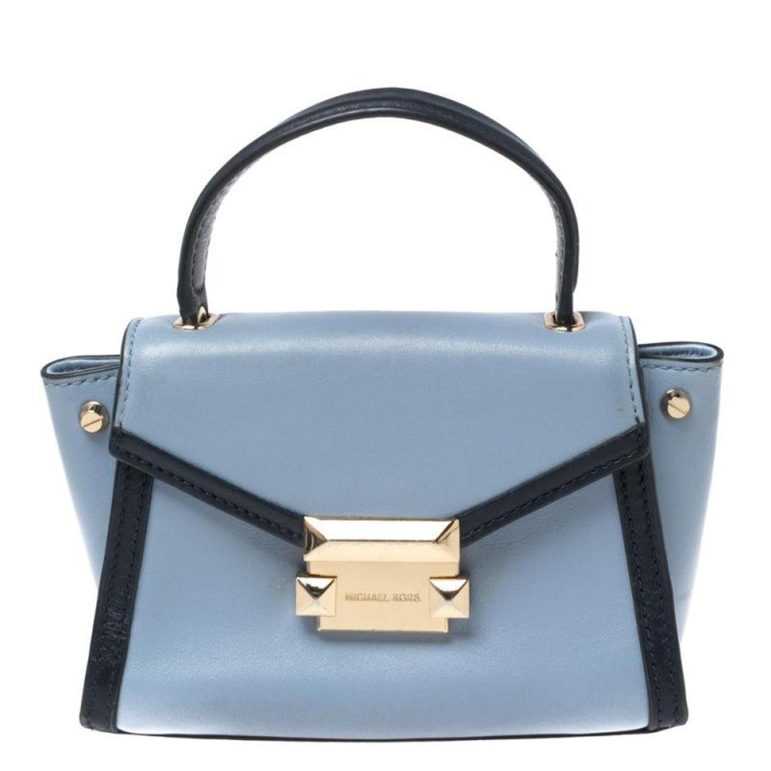 • From Michael Kors this Whitney bag is a grand fusion of brilliance and timeless style. It is fashioned in two tone blue leather with an engraved logo accent perched on the front. It is decorated with gold tone fittings a fabric lined interior and a top handle. Invest today in this beautiful bag.