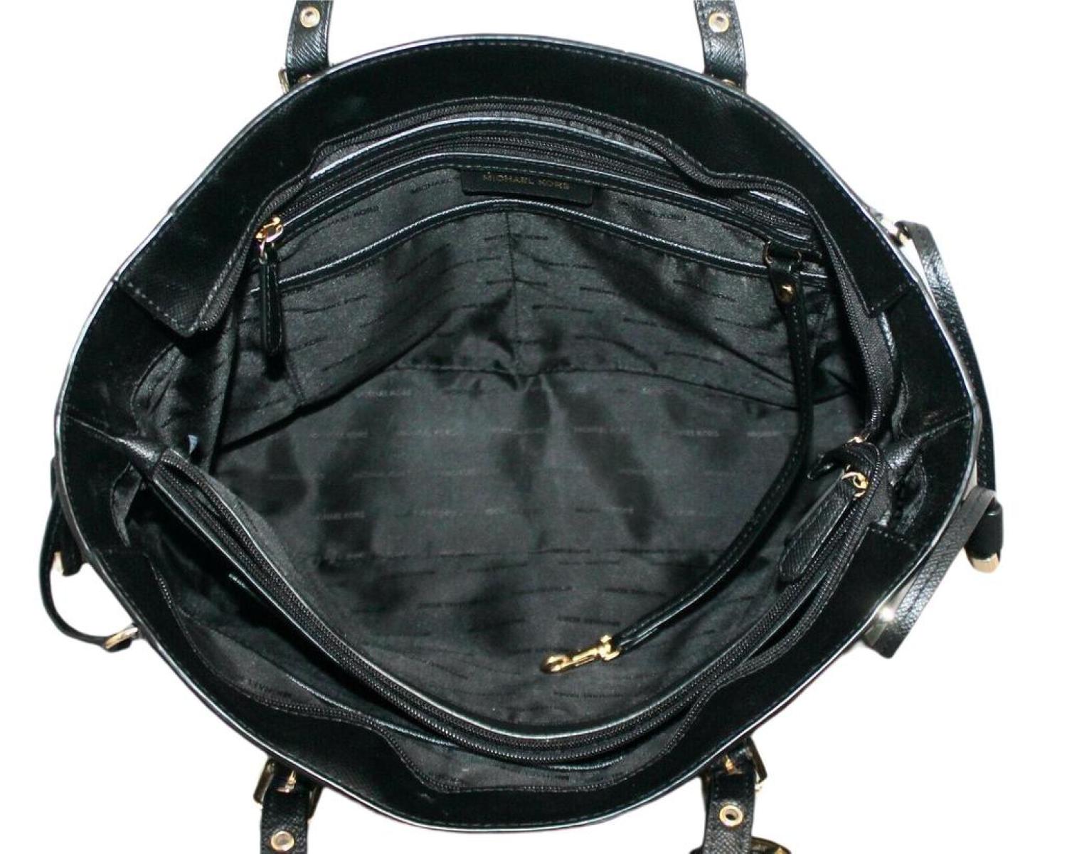 • Made of PVC; Top zip for closure; 01 center Large zip pocket divided the bag in 02 large compartment; 01 zip pocket; 02 inside open pockets and KEY fob. 02 side pockets; MK SV LOGO CHARM; Flat bottom with protective metal feet; Double dual buckle Adjustable Leather shoulder strap with 8"-10" drop. Gold hardware. Measurements - Length - 16.5 x Height - 10.5 x Width - 6.25 Inches. Comes with original tags.