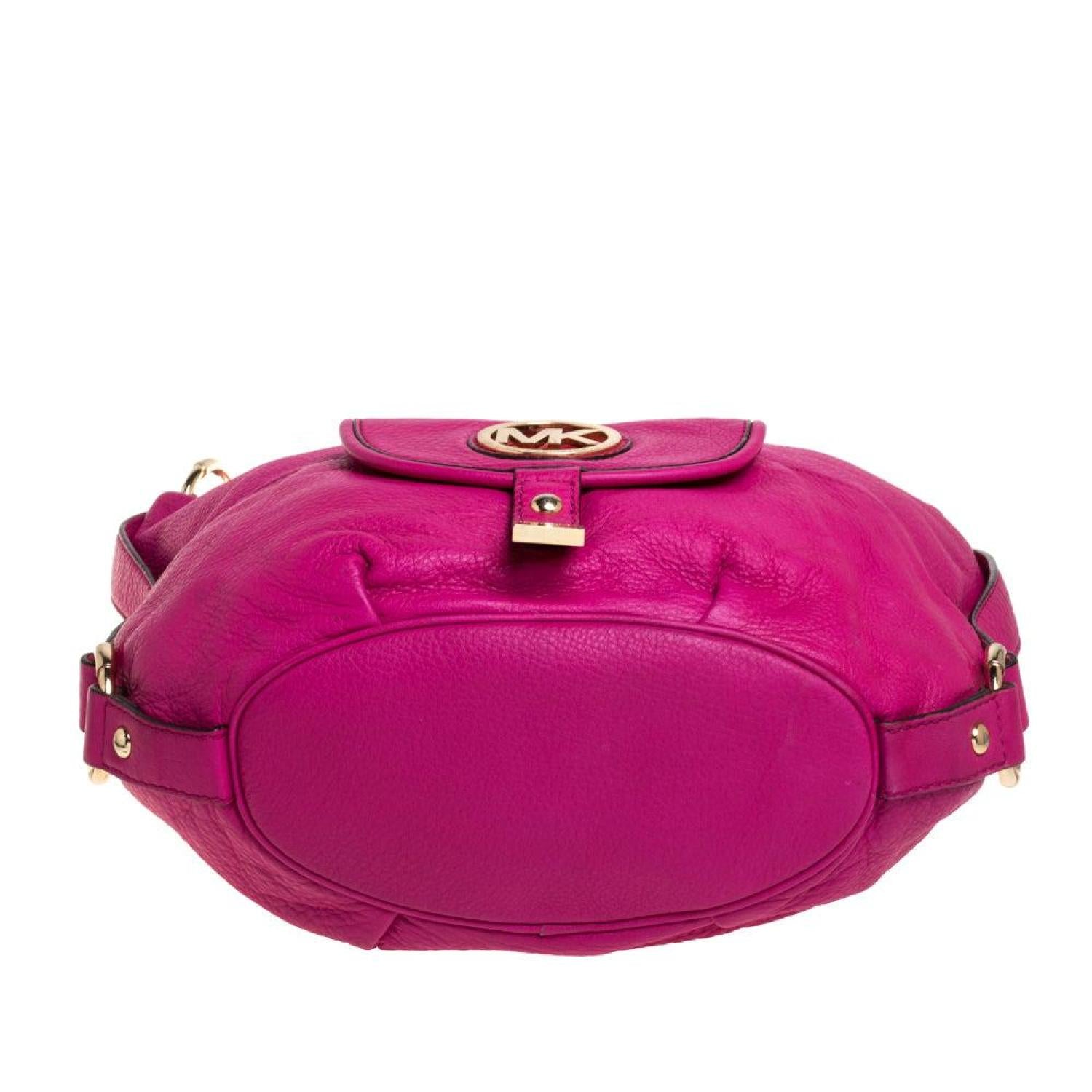 This Michael Kors Fulton hobo will surely catch a lot of attention. It has been designed with fuchsia leather and is secured with a zip closure. This bag comes fitted with a single handle a front pocket detailed with the MK logo. It has a nylon lined interior and is finished with gold tone hardware.