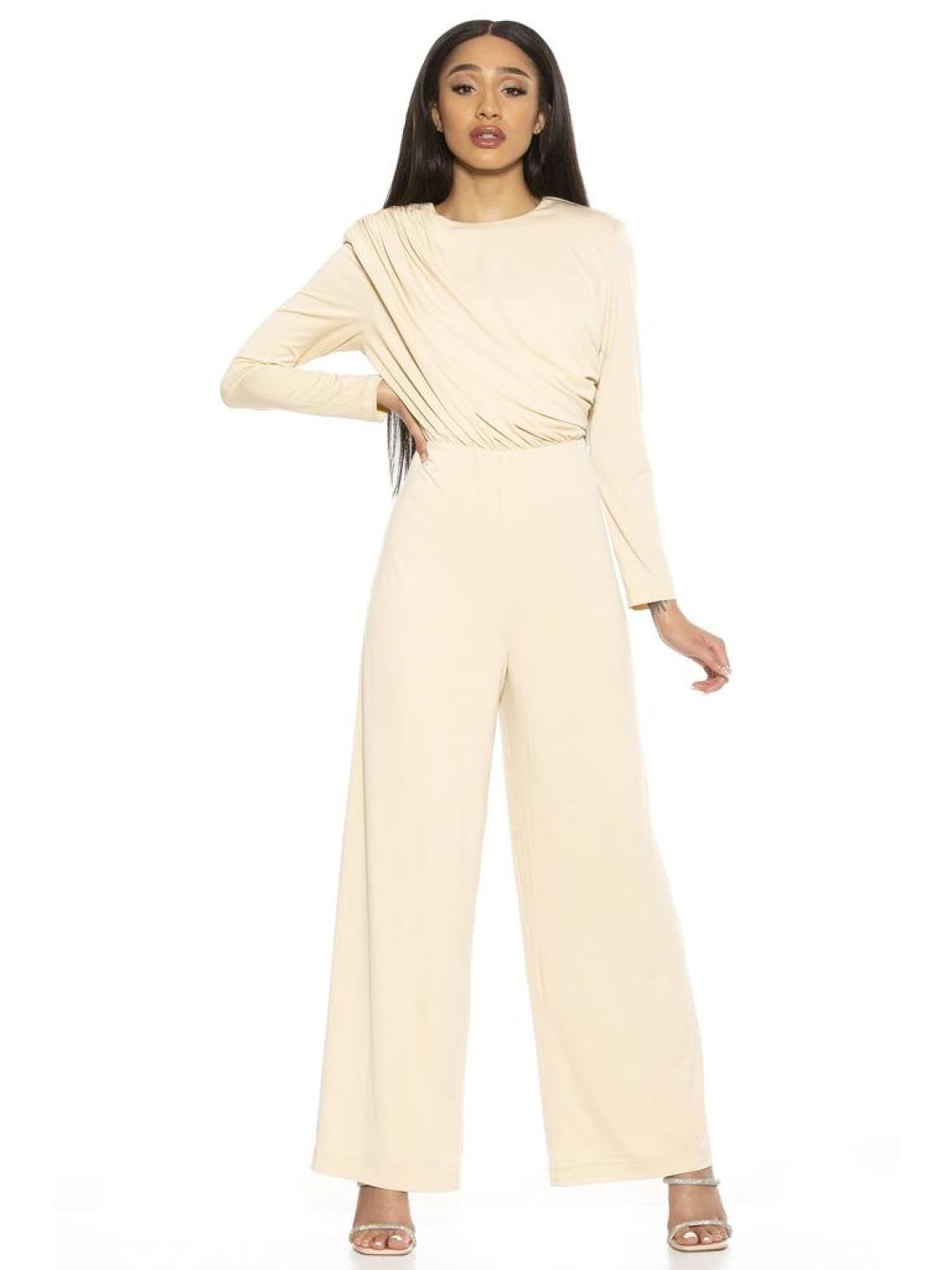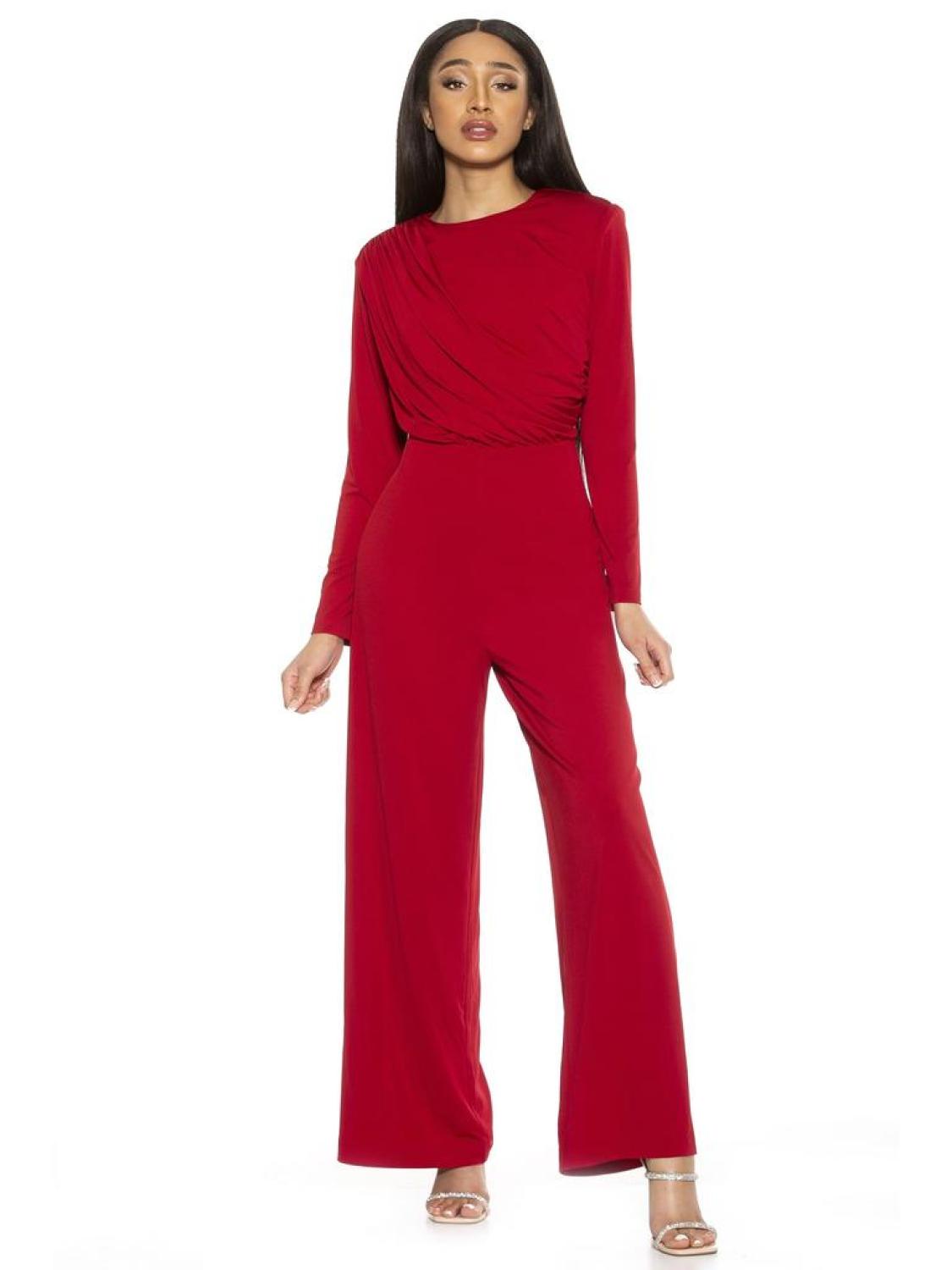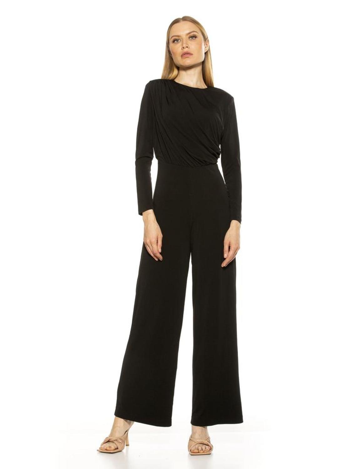 • PRODUCT FEATURES Long Sleeves Draped Crewneck Wide Legs Back Zipper Slim Fitted Sleeves 95% Polyester, 5% Spandex Lined - 100% Polyester Machine Wash Imported Style D3844