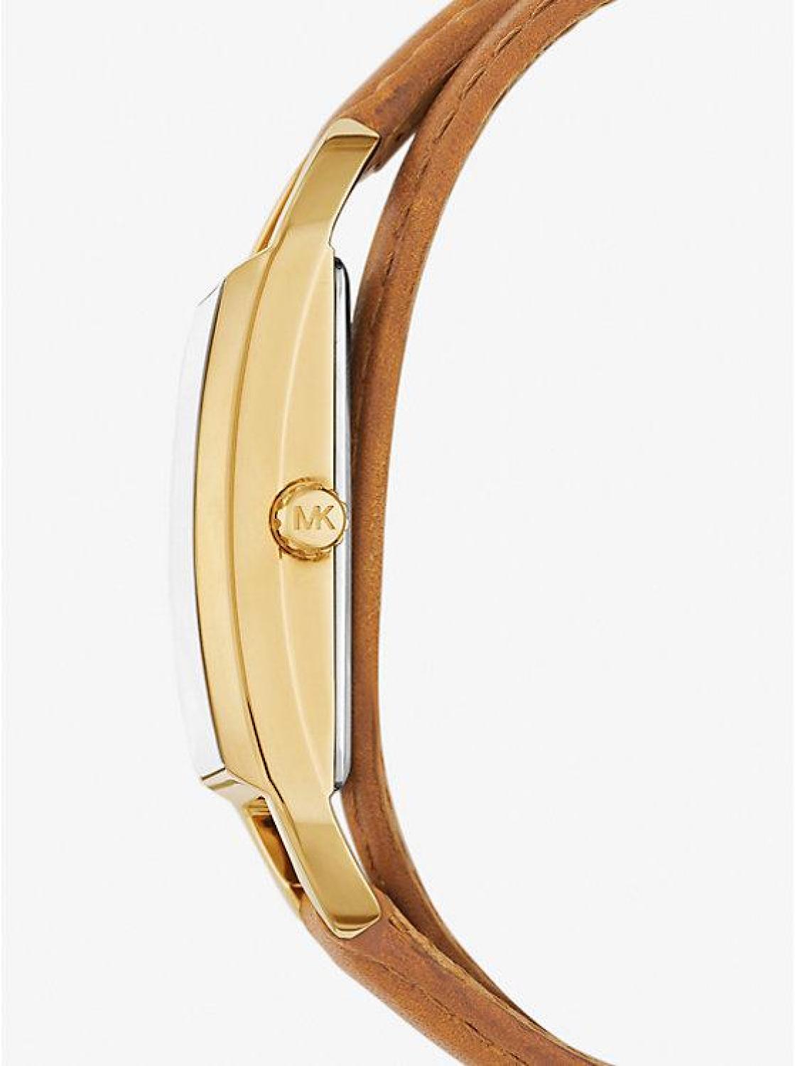 • Channeling New York’s incomparable energy, this Empire timepiece brings together a gold-tone stainless steel case and a refined leather bracelet strap. Slim in size, it features a logo-faceted dial and case that nods to our iconic Empire hardware. The double-wrap strap looks elegant alone, or stacked with a few bracelets.